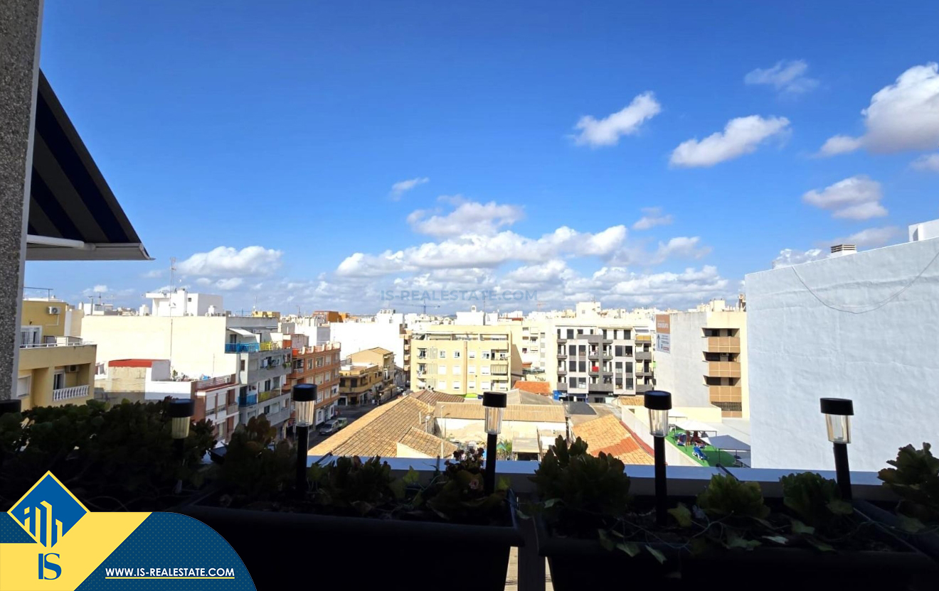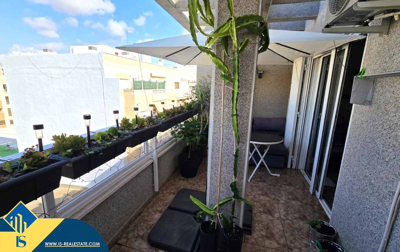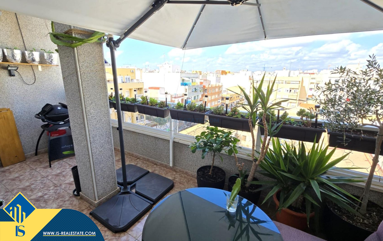 2-jų kambarių penthouse apartamentas su terasa, Ispanijoje, Alicante provincijoje, Torrevieja mieste, bendras plotas 59 m², 700 metrų iki jūros, 45 kilometrai iki Alicante oro uosto. Turtui priklauso terasa, liftas, garažas. Netoli turto yra parduotuvės, restoranai, vaistinės, autobusų stotelės, degalinės, žalios zonos, kavinės
