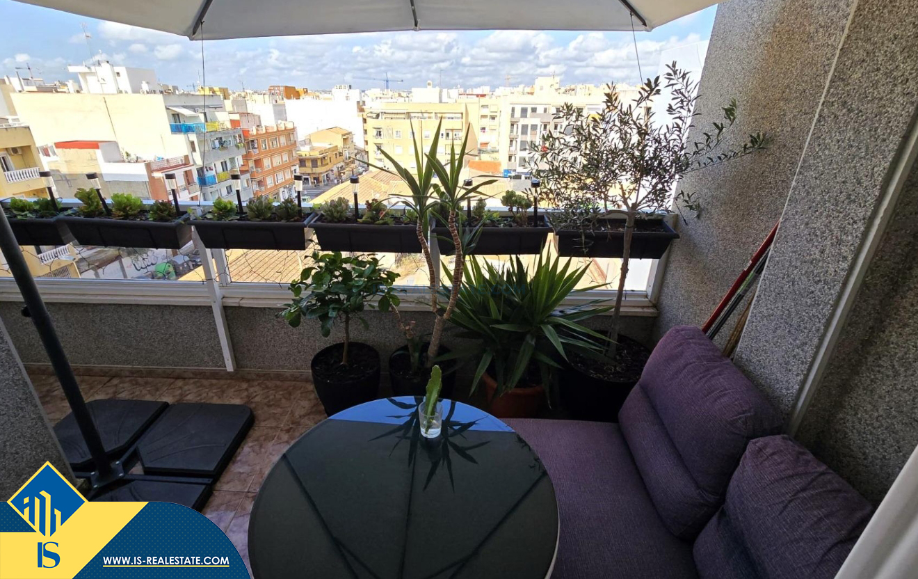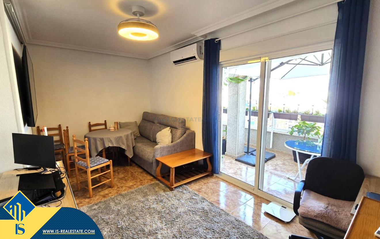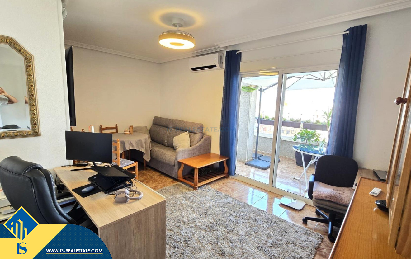 2-jų kambarių penthouse apartamentas su terasa, Ispanijoje, Alicante provincijoje, Torrevieja mieste, bendras plotas 59 m², 700 metrų iki jūros, 45 kilometrai iki Alicante oro uosto. Turtui priklauso terasa, liftas, garažas. Netoli turto yra parduotuvės, restoranai, vaistinės, autobusų stotelės, degalinės, žalios zonos, kavinės