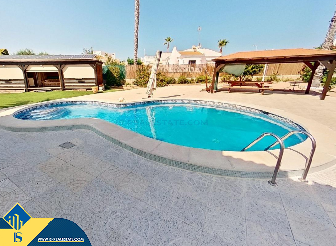 5-ių kambarių vila su privačiu baseinu, Ispanijoje, Alicante provincijoje, Torrevieja mieste, El Chaparral rajone, bendras plotas 163 m², 4 kilometrai iki paplūdimio, 45 kilometrai iki Alicante miesto oro uosto. Turtui priklauso privatus baseinas, terasa, kiemas, vieta automobiliui. Netoli turto yra parduotuvės, restoranai, autobusų stotelės, vaikų zonos, degalinės, žalios zonos, kavinės, vaistinės