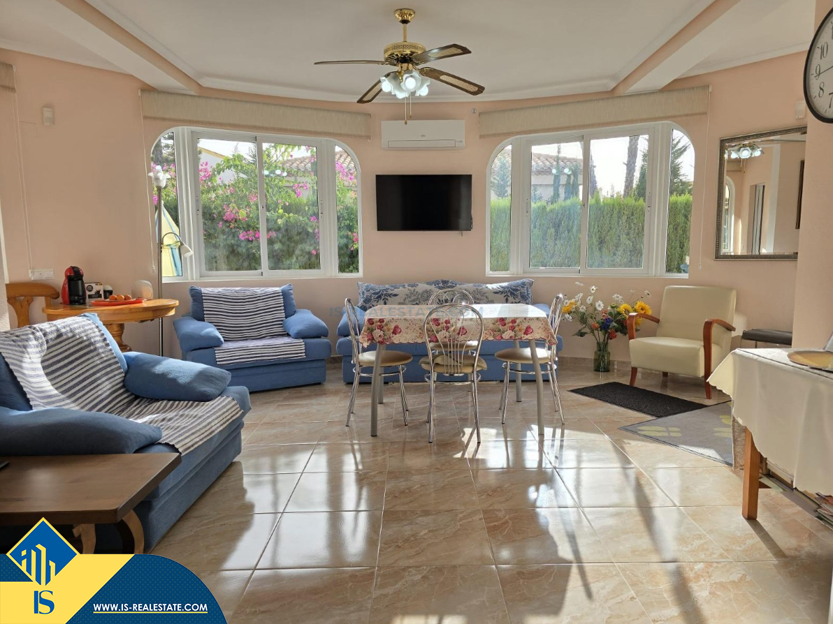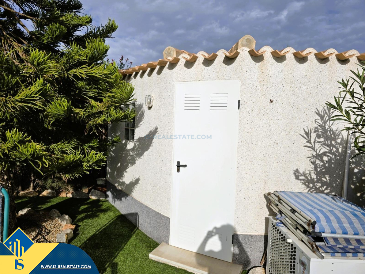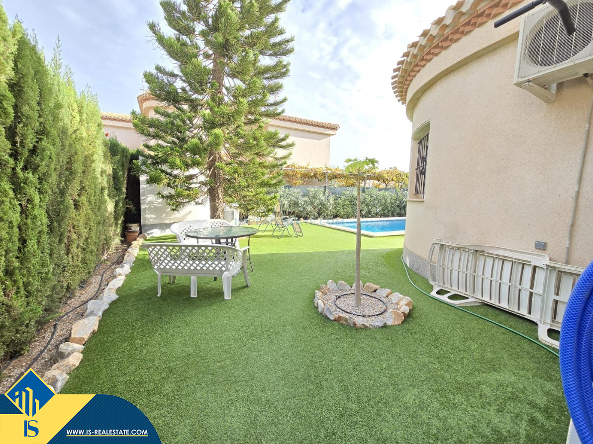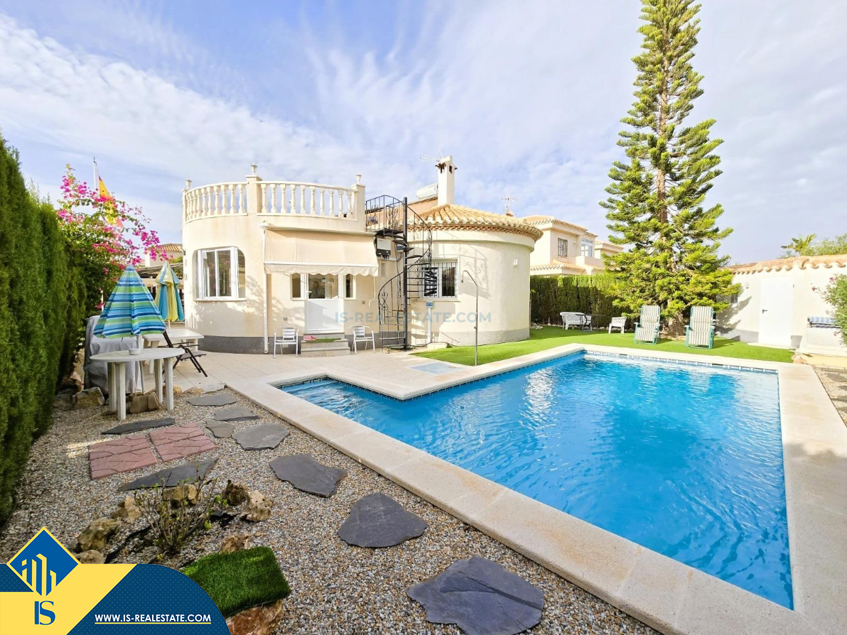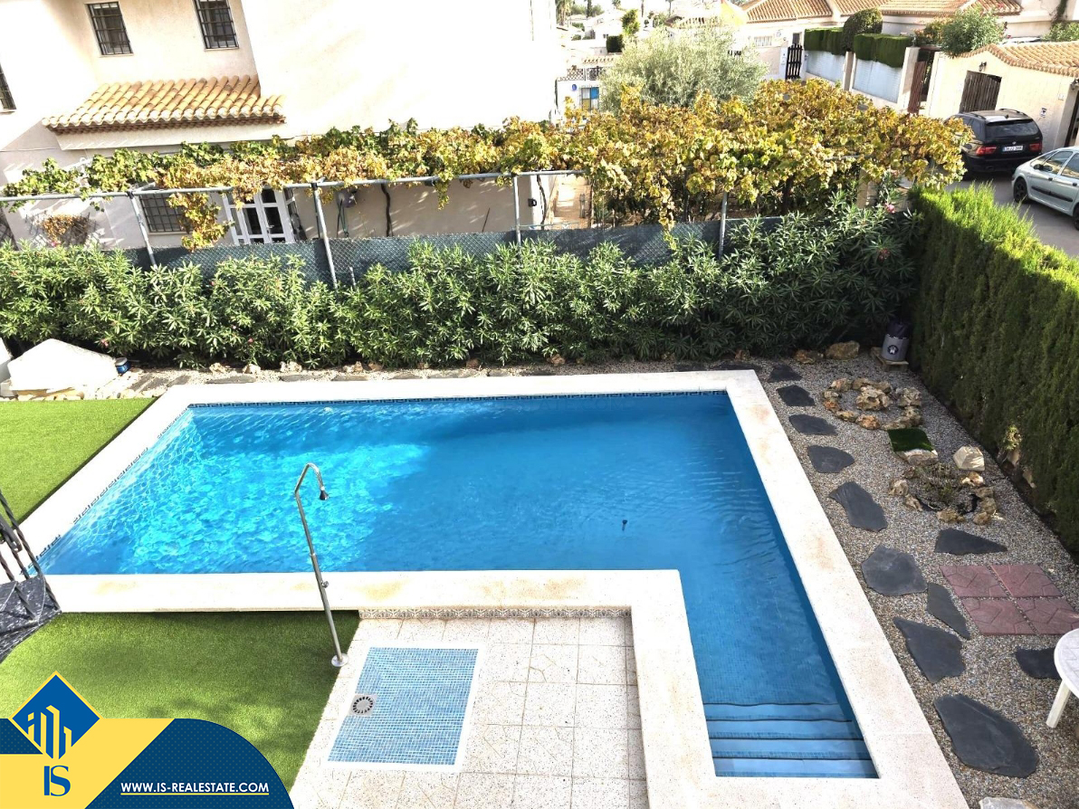 4-ių kambarių vila su privačiu baseinu, Ispanijoje, Alicante provincijoje, Orihuela Costa mieste, bendras plotas 105 m², 1 kilometras iki jūros, 57 kilometrai iki Alicante oro uosto. Turtui priklauso terasa, privatus baseinas, vieta automobiliui, sandėliukas, privatus kiemas. Netoli turto yra parduotuvės, restoranai, autobusų stotelės, vaikų zonos, degalinės, žalios zonos, kavinės, ligoninė