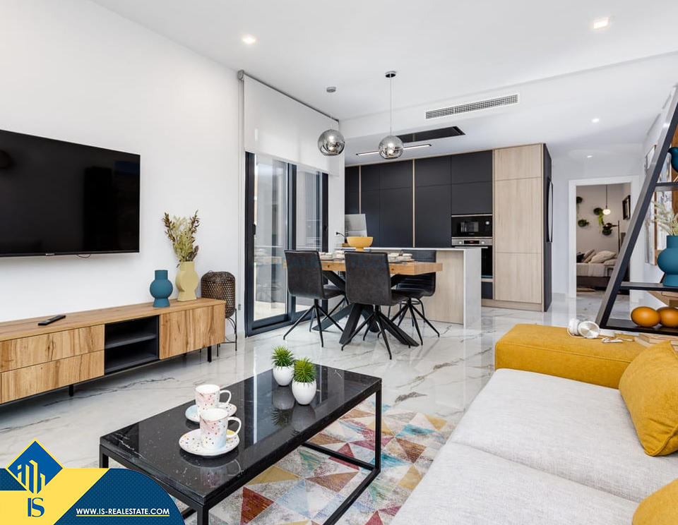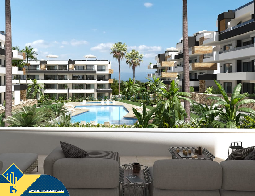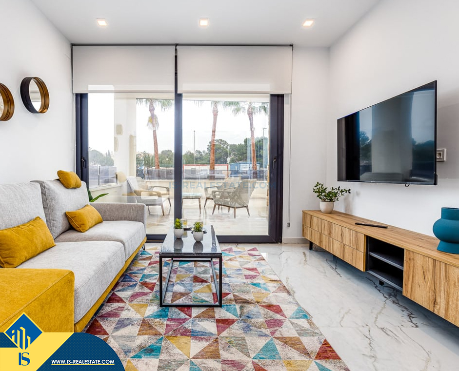 Statomi apartamentai 3-jų kambarių, Ispanijoje, Alicante provincijoje, Torrevieja mieste, bendras plotas 75 m², 3 kilometrai iki jūros, 45 kilometrai iki Alicante miesto oro uosto. Turtui priklauso bendras baseinas, terasa, vieta automobiliui, soliariumas. Netoli turto yra parduotuvės, restoranai, autobusų stotelės, degalinės, žalios zonos, kavinės, vaistinės, pagrindinė promenada.