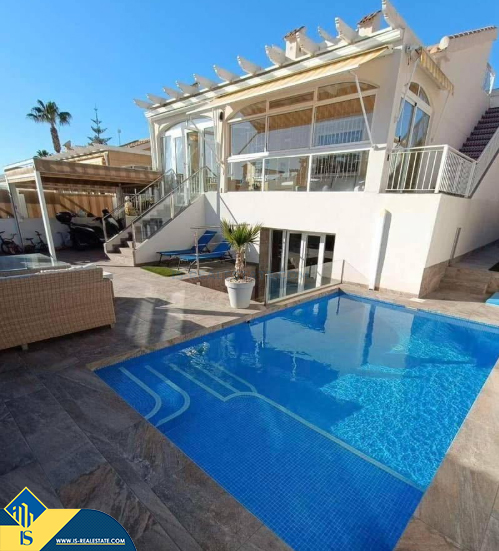 4-ių kambarių vila su privačiu baseinu, Ispanijoje, Alicante provincijoje, Orihuela Costa mieste, bendras plotas 203 m², 3 kilometrai iki jūros, 57 kilometrai iki Alicante oro uosto. Turtui priklauso privatus baseinas, bendras baseinas, terasa, vieta automobiliui, privatus kiemas. Netoli turto yra parduotuvės, restoranai, autobusų stotelės, vaikų zonos, degalinės, žalios zonos, kavinės, ligoninė