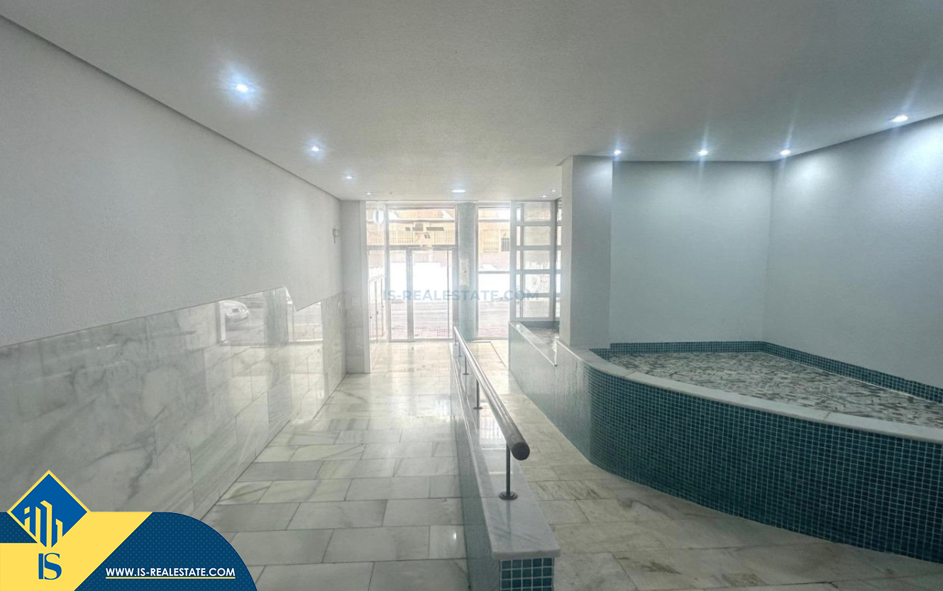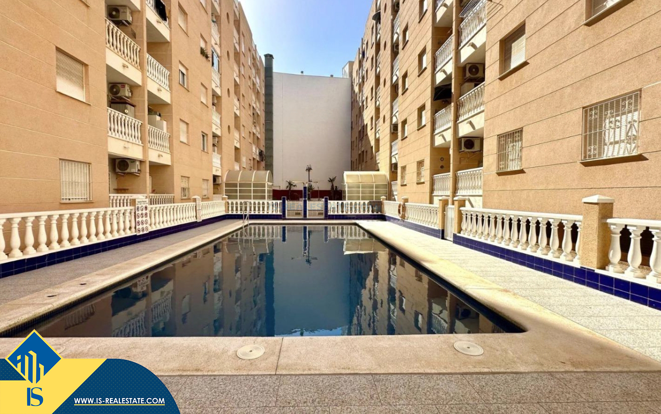 3-jų kambarių apartamentas su bendru baseinu, Ispanijoje, Alicante provincijoje, Torrevieja mieste, Playa del Cura rajone, bendras plotas 60 m², 500 metrų iki jūros, 45 kilometrai iki Alicante oro uosto. Turtui priklauso bendras baseinas, balkonas, liftas, garažas. Netoli turto yra parduotuvės, restoranai, vaistinės, autobusų stotelės, degalinės, žalios zonos, kavinės, Habaneras alėja