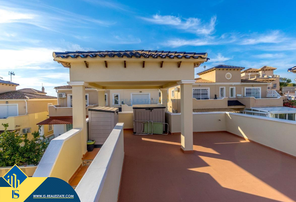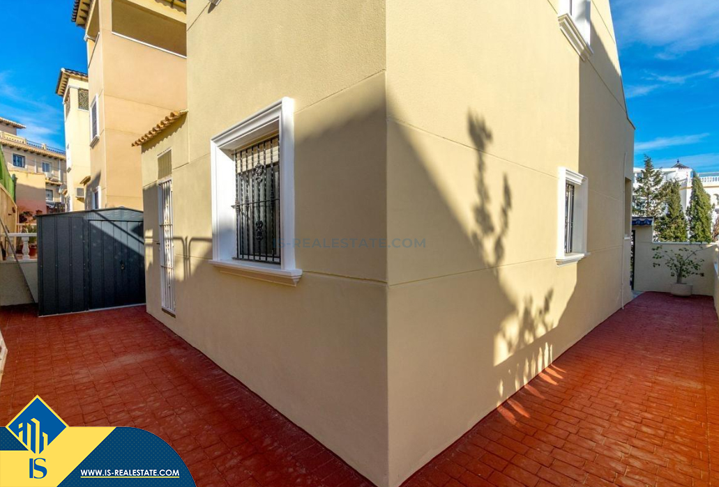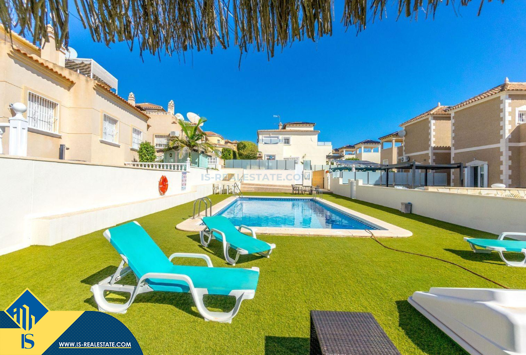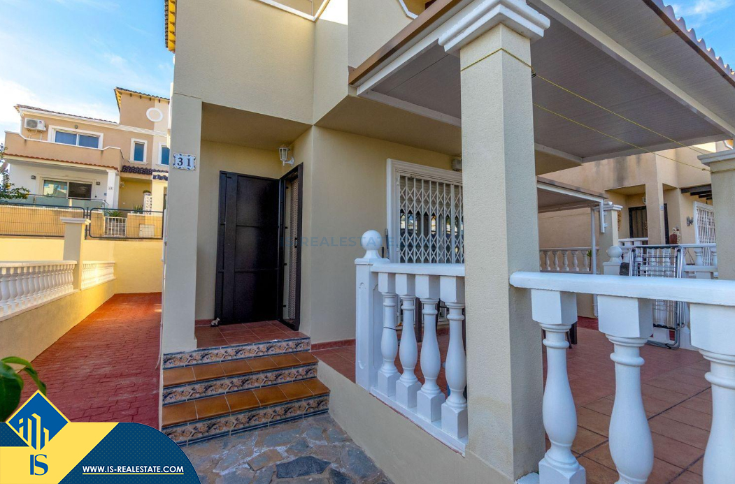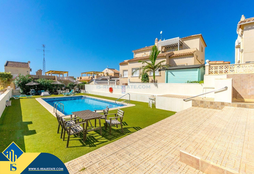 4-ių kambarių namas su bendru baseinu, Ispanijoje, Alicante provincijoje, Orihuela Costa mieste, bendras plotas 105 m², 4 kilometrai iki jūros, 57 kilometrai iki Alicante oro uosto. Turtui priklauso bendras baseinas, terasa, vieta automobiliui, privatus kiemas. Netoli turto yra parduotuvės, restoranai, autobusų stotelės, vaikų zonos, degalinės, žalios zonos, kavinės, ligoninė