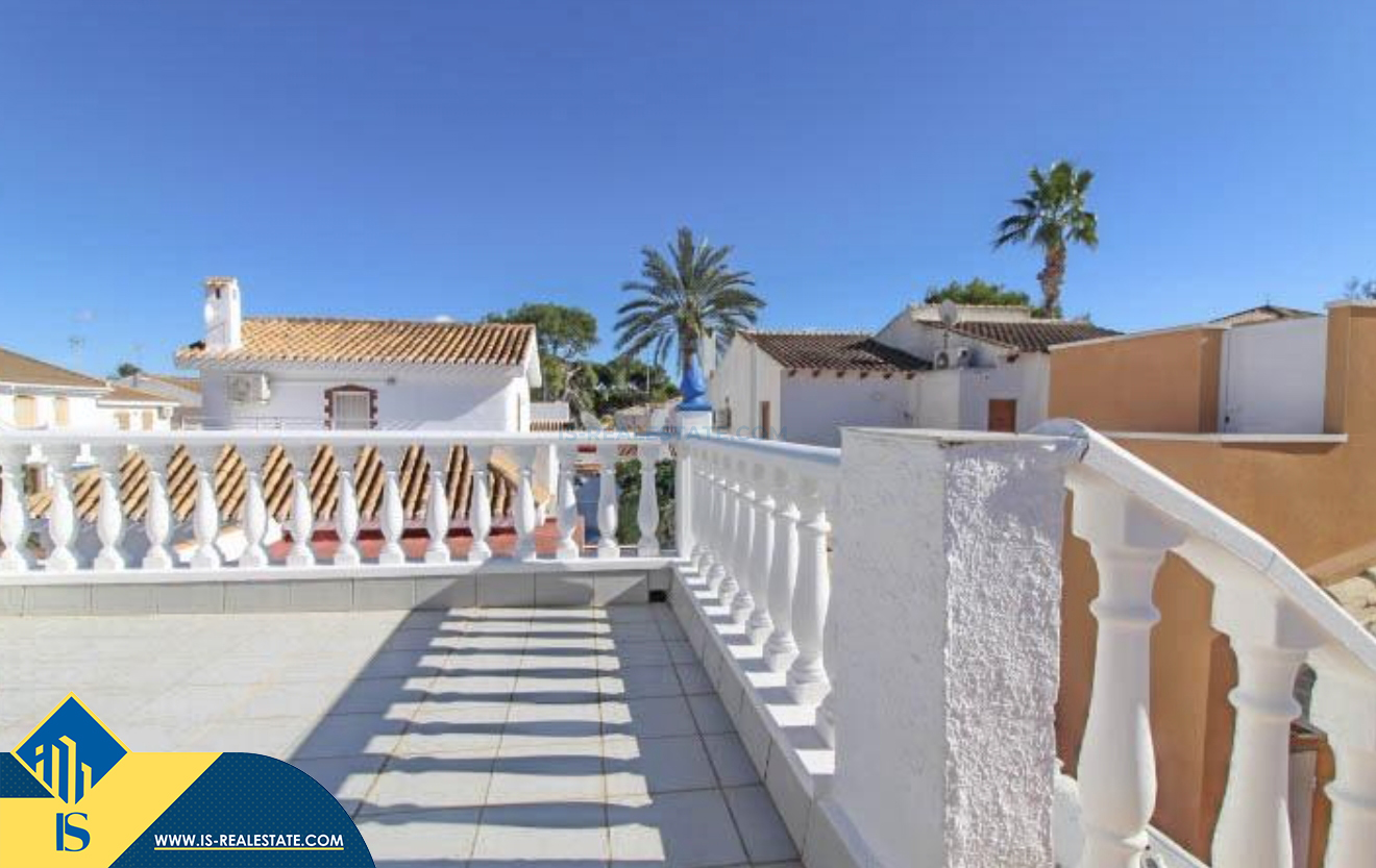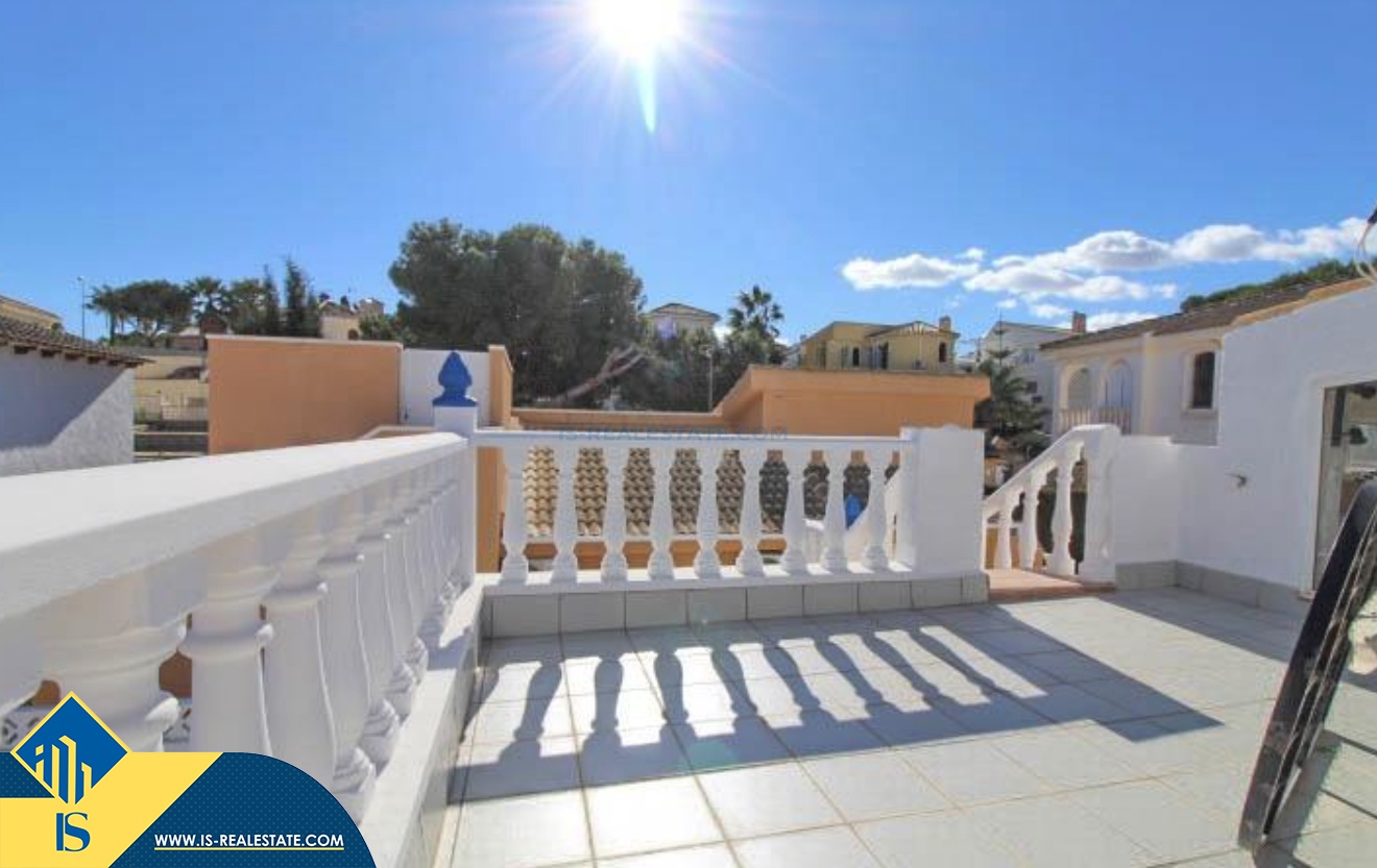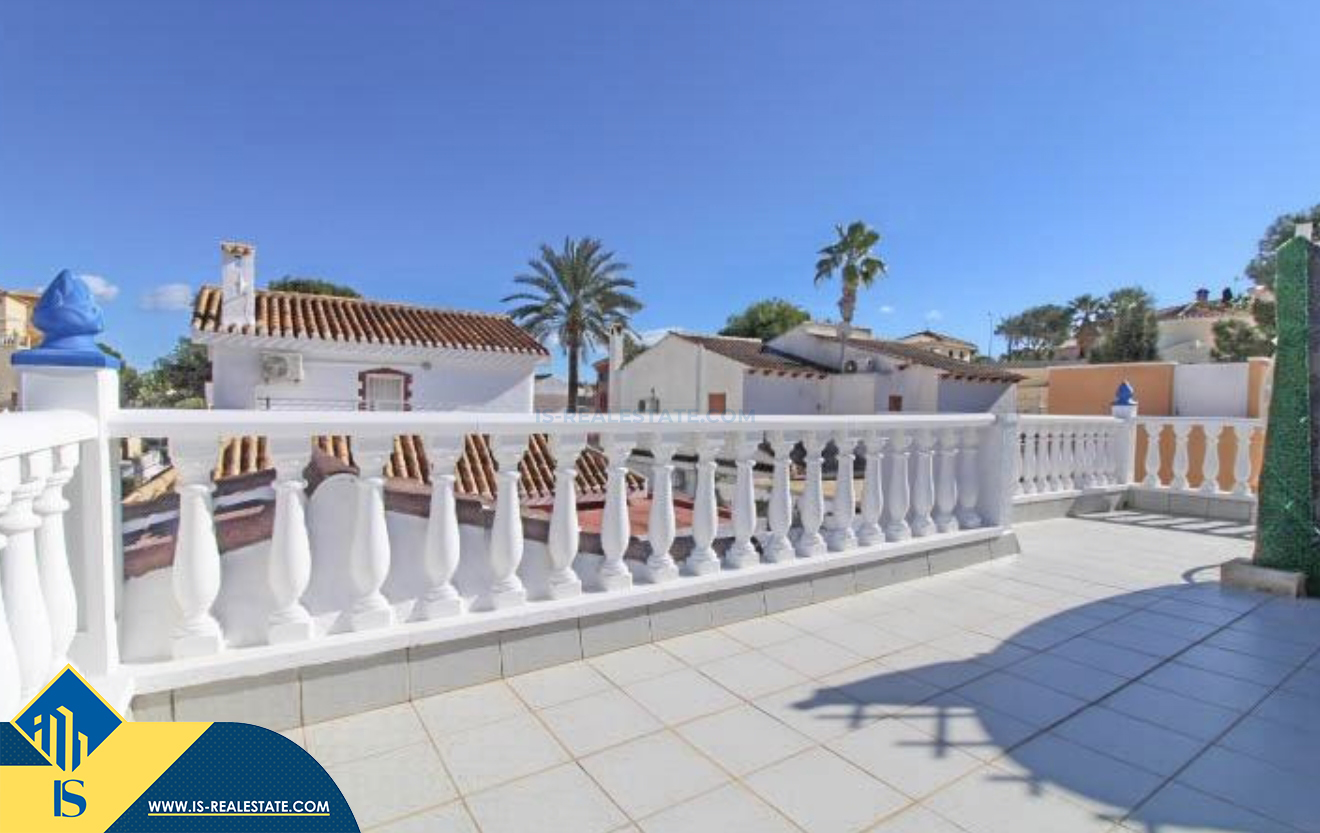 4-ių kambarių vila su terasa, Ispanijoje, Alicante provincijoje, Orihuela Costa mieste, bendras plotas 120 m², 400 metrų iki jūros, 57 kilometrai iki Alicante oro uosto. Turtui priklauso terasa, vieta automobiliui, privatus kiemas. Netoli turto yra parduotuvės, restoranai, autobusų stotelės, vaikų zonos, degalinės, žalios zonos, kavinės, ligoninė