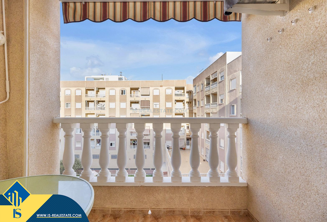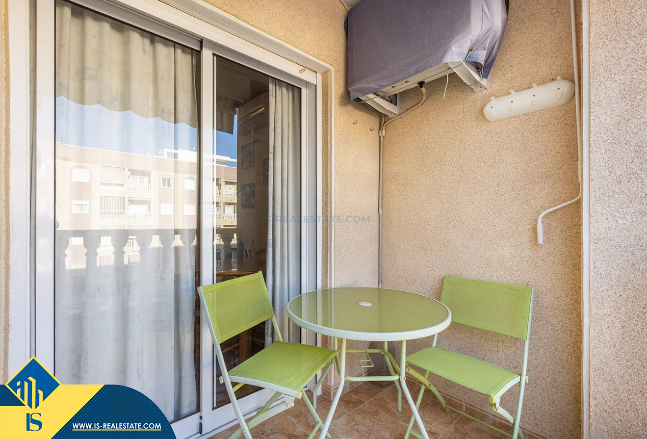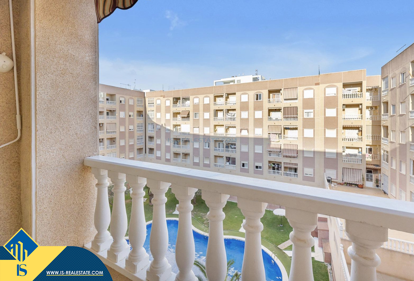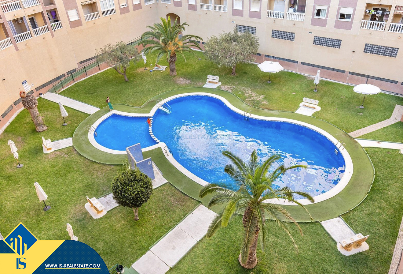 3-jų kambarių apartamentas su bendru baseinu, Ispanijoje, Alicante provincijoje, Torrevieja mieste, bendras plotas 58 m², 650 metrų iki jūros, 45 kilometrai iki Alicante oro uosto. Turtui priklauso bendras baseinas, terasa, liftas, garažas. Netoli turto yra parduotuvės, restoranai, vaistinės, autobusų stotelės, degalinės, žalios zonos, kavinės