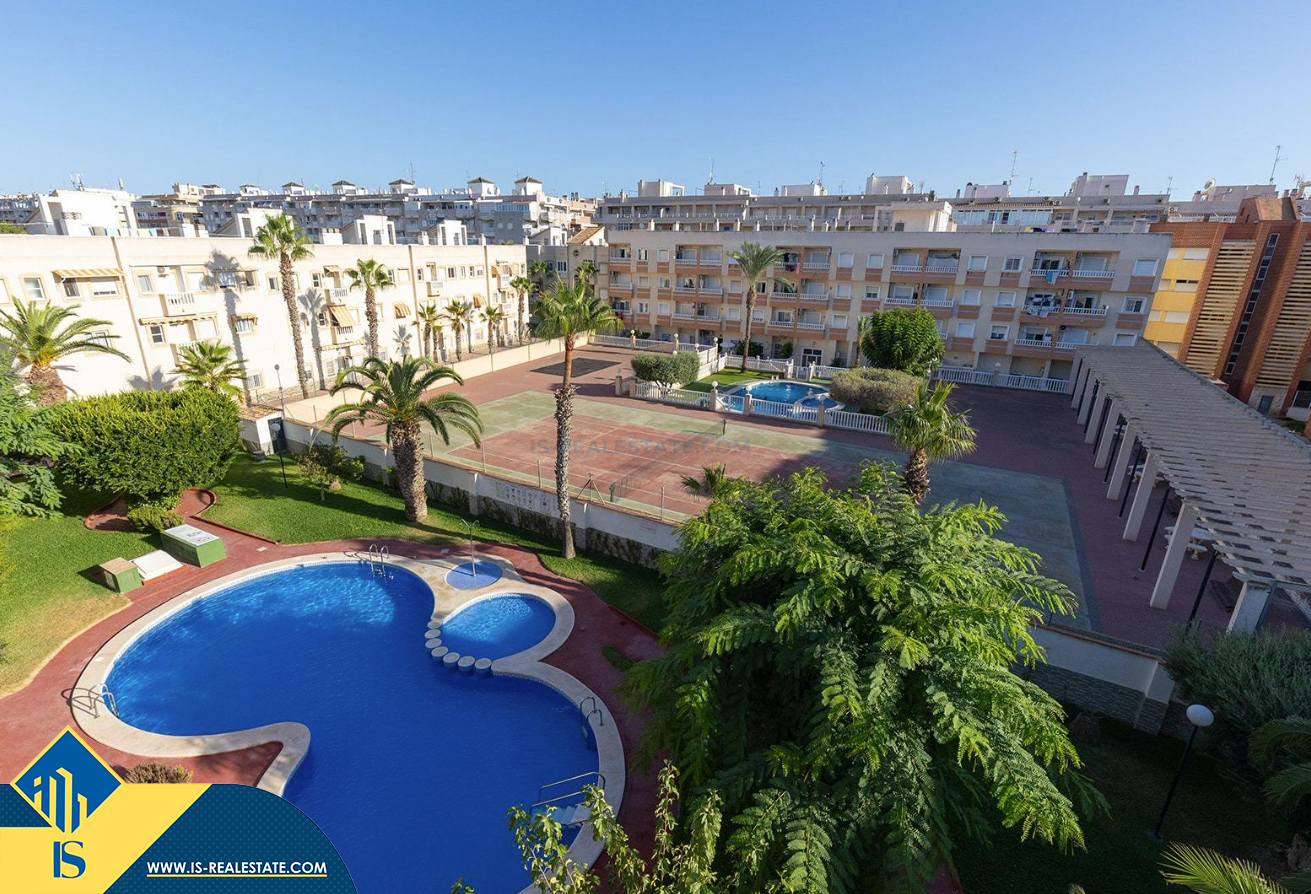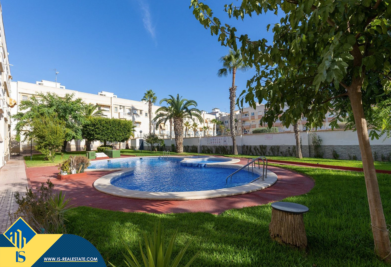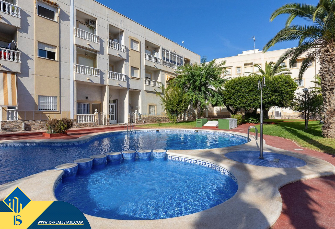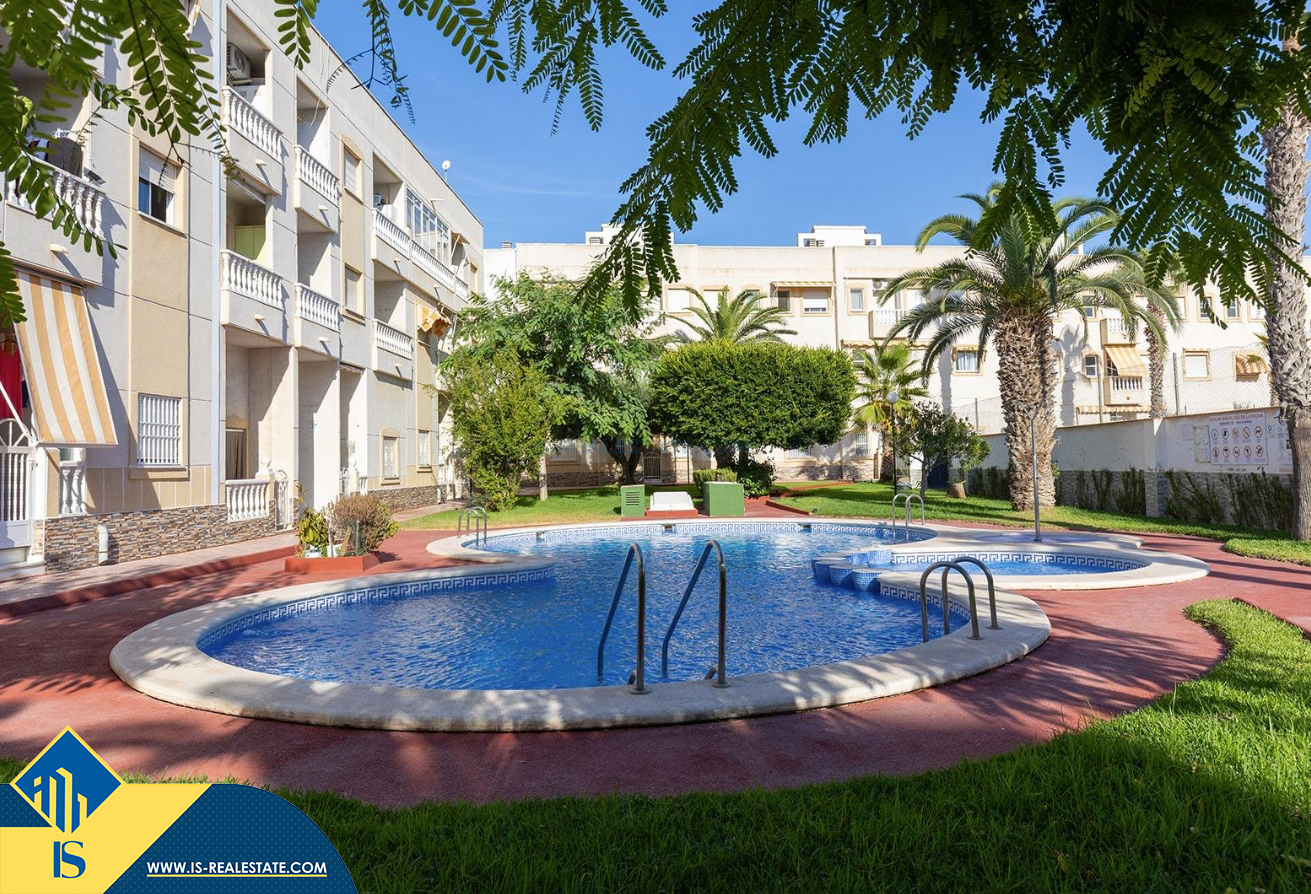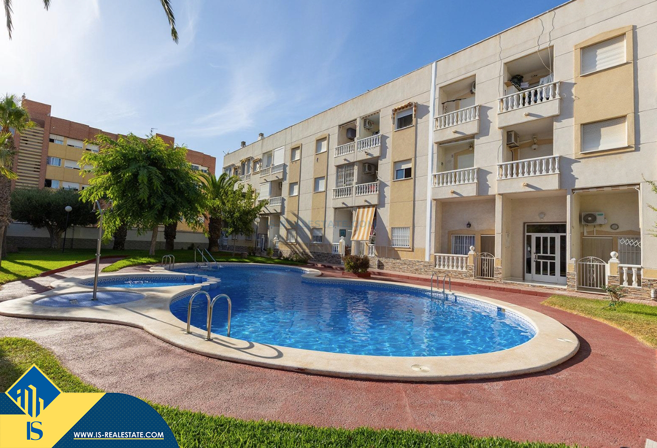 3-jų kambarių apartamentas su bendru baseinu, Ispanijoje, Alicante provincijoje, Torrevieja mieste, bendras plotas 51 m², 900 metrų iki jūros, 45 kilometrai iki Alicante oro uosto. Turtui priklauso bendras baseinas, terasa, liftas. Netoli turto yra parduotuvės, restoranai, vaistinės, autobusų stotelės, degalinės, žalios zonos, kavinės