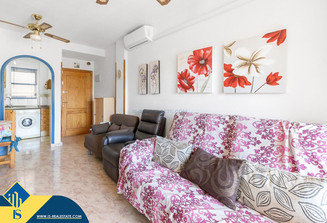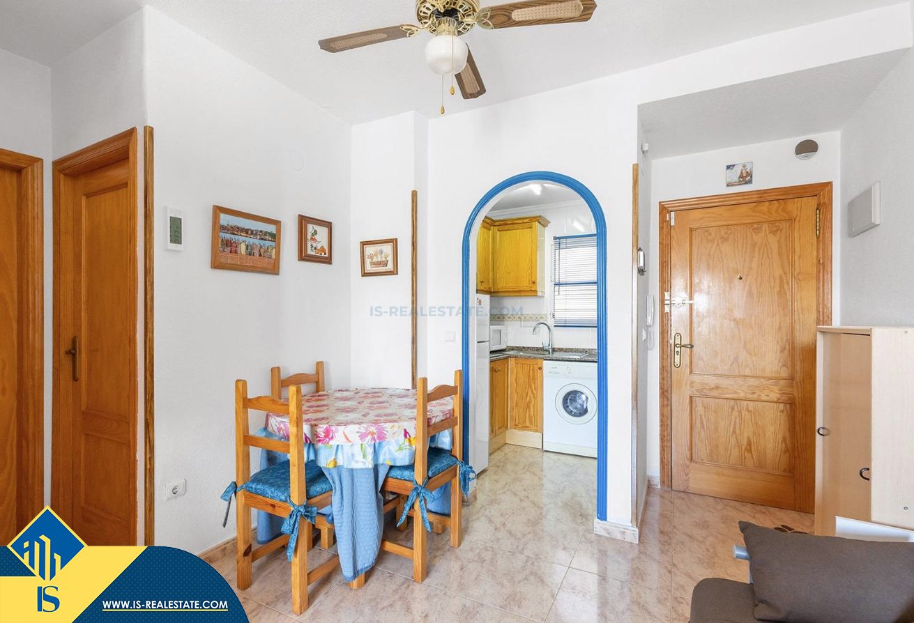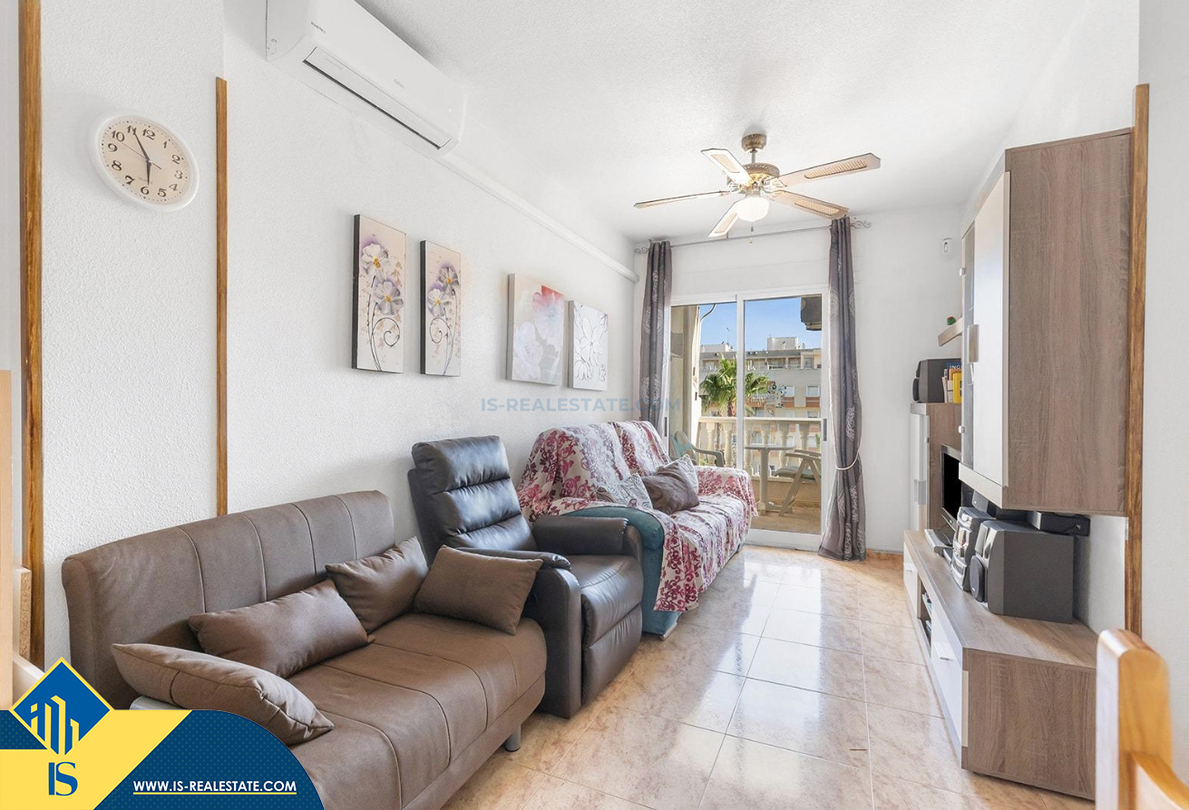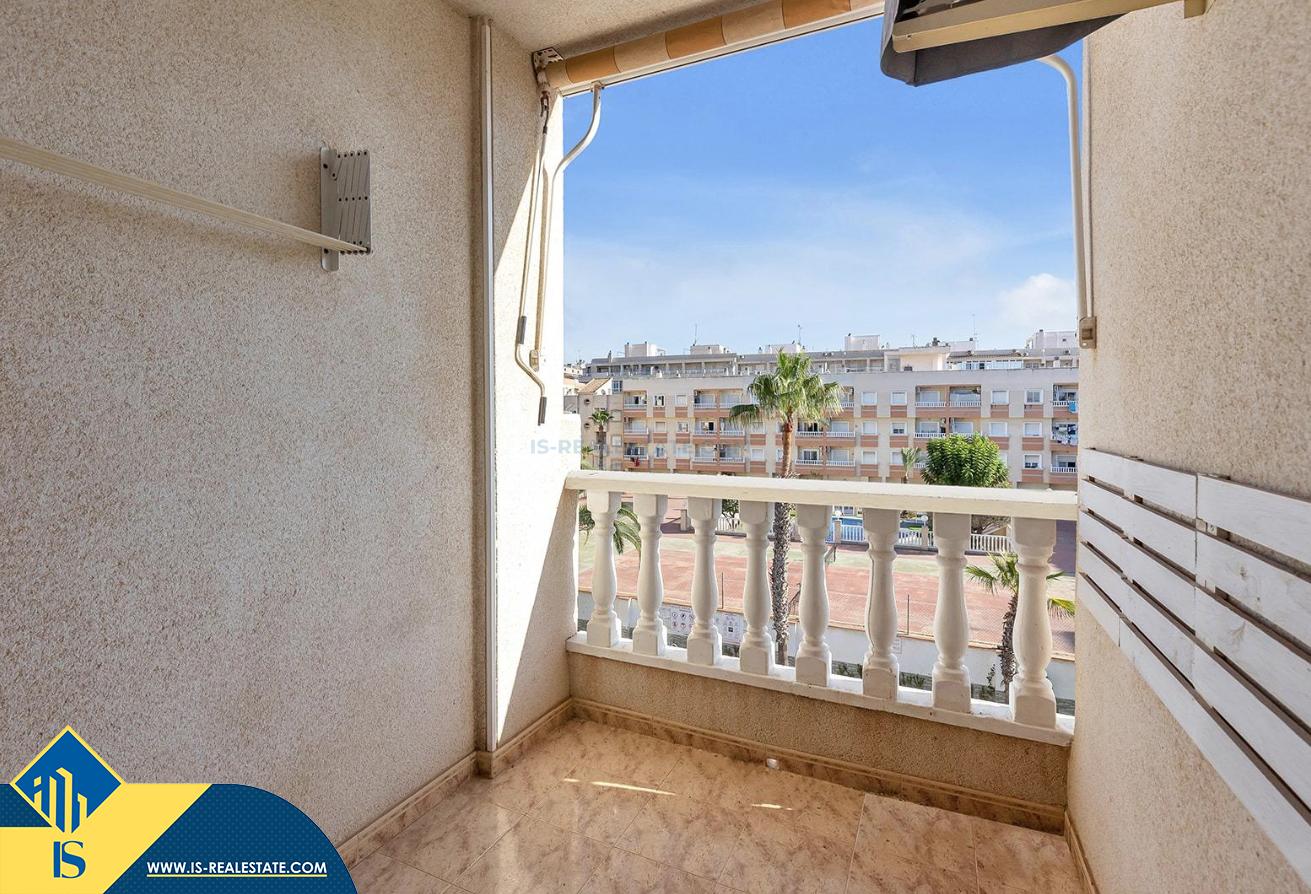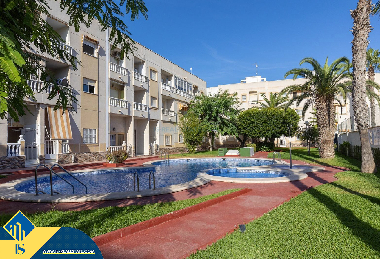 3-jų kambarių apartamentas su bendru baseinu, Ispanijoje, Alicante provincijoje, Torrevieja mieste, bendras plotas 51 m², 900 metrų iki jūros, 45 kilometrai iki Alicante oro uosto. Turtui priklauso bendras baseinas, terasa, liftas. Netoli turto yra parduotuvės, restoranai, vaistinės, autobusų stotelės, degalinės, žalios zonos, kavinės