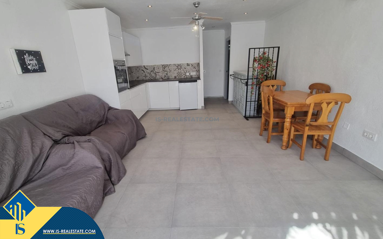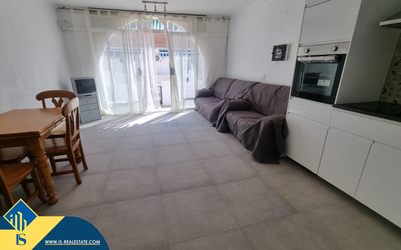 2-jų kambarių renovuotas bungalas su terasa, Ispanijoje, Alicante provincijoje, Torrevieja mieste, El Chaparral rajone, bendras plotas 45 m², 3 kilometrai iki jūros, 45 kilometrai iki Alicante oro uosto. Turtui priklauso terasa. Netoli turto yra parduotuvės, restoranai, autobusų stotelės, vaikų zonos, degalinės, žalios zonos, kavinės, vaistinės