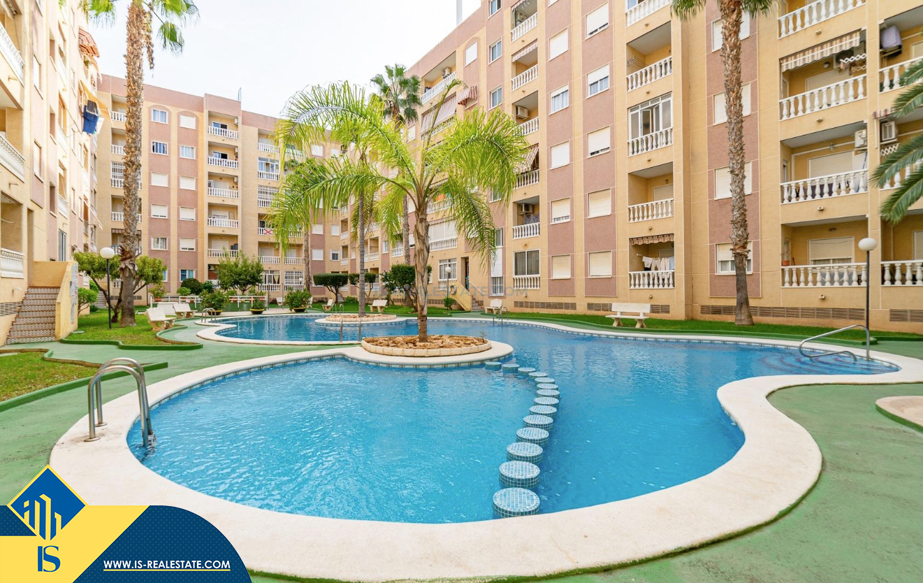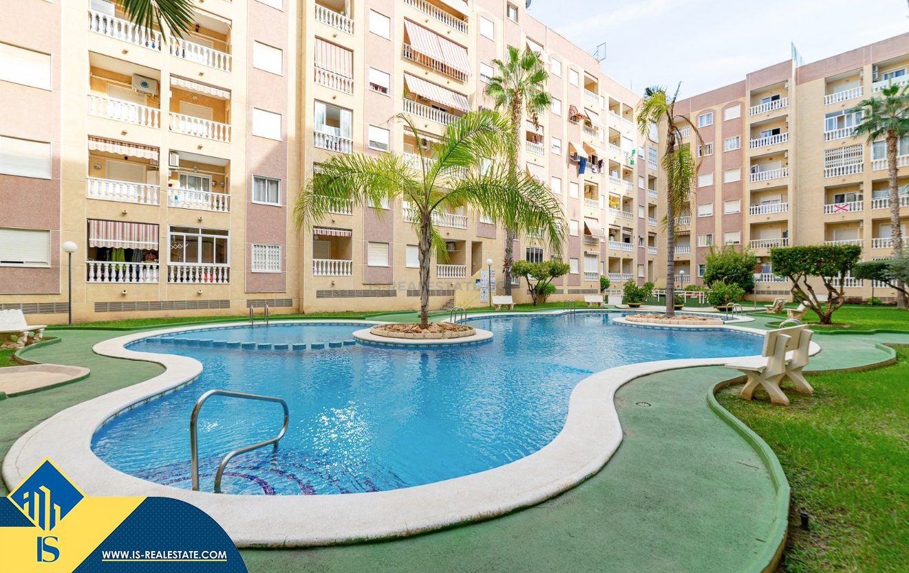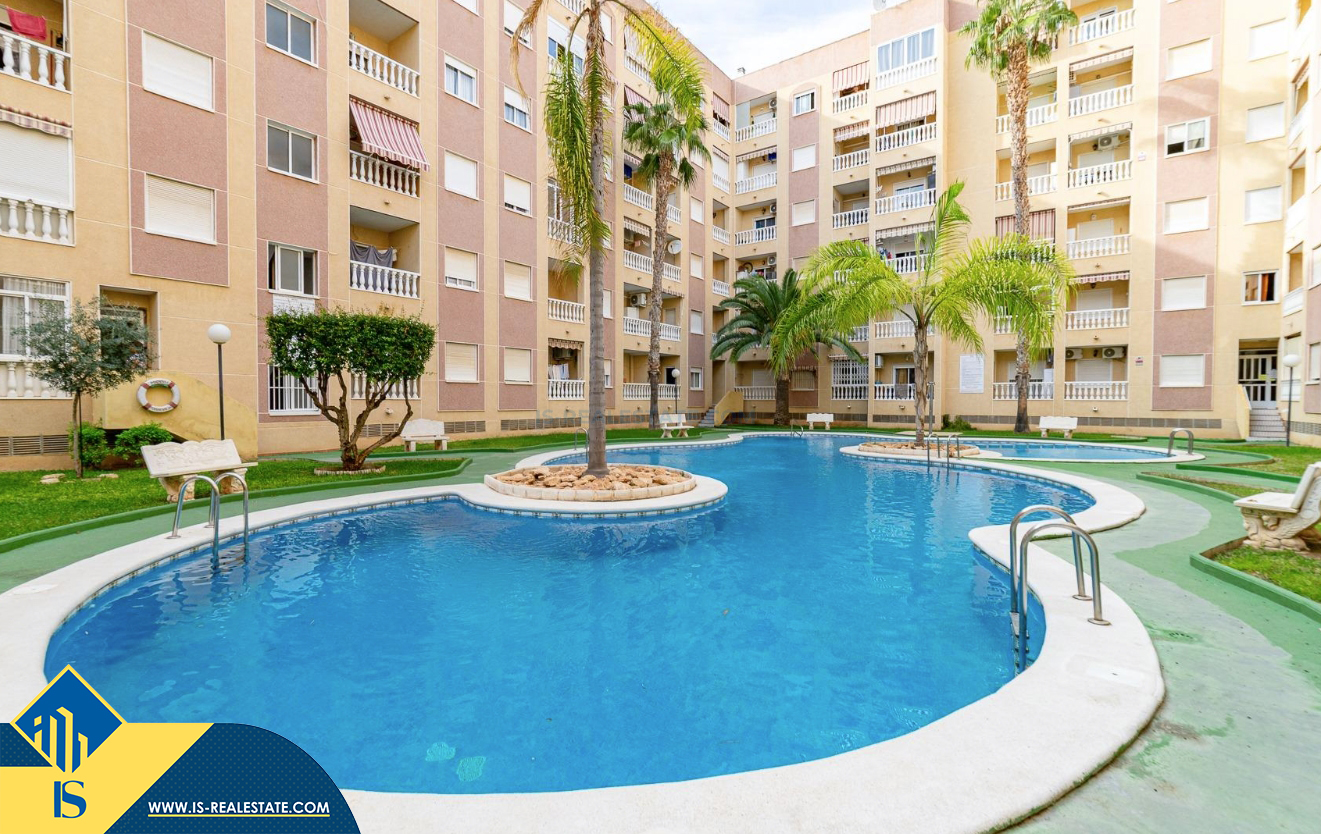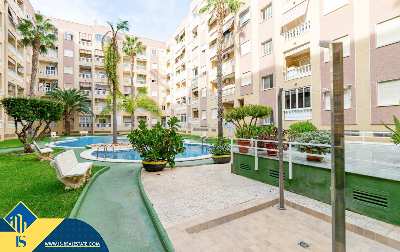 2-jų kambarių apartamentas su bendru baseinu, Ispanijoje, Alicante provincijoje, Torrevieja mieste, bendras plotas 47 m², 900 metrų iki jūros, 45 kilometrai iki Alicante oro uosto. Turtui priklauso bendras baseinas, terasa, liftas. Netoli turto yra parduotuvės, restoranai, vaistinės, autobusų stotelės, degalinės, žalios zonos, kavinės