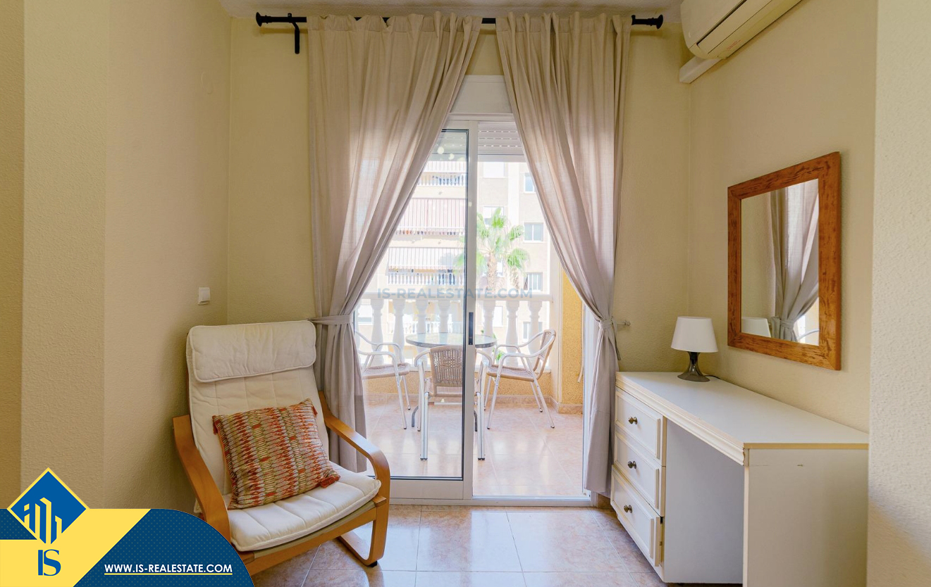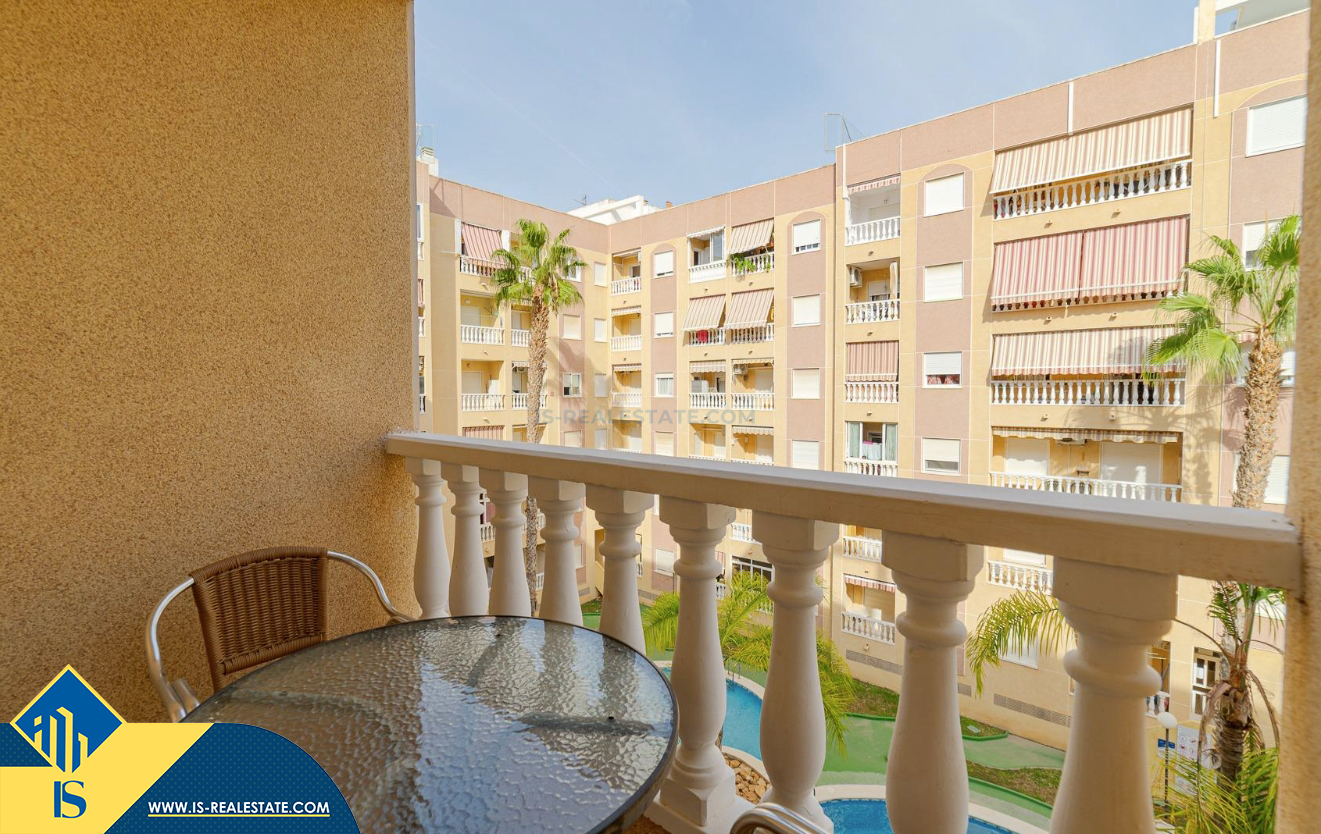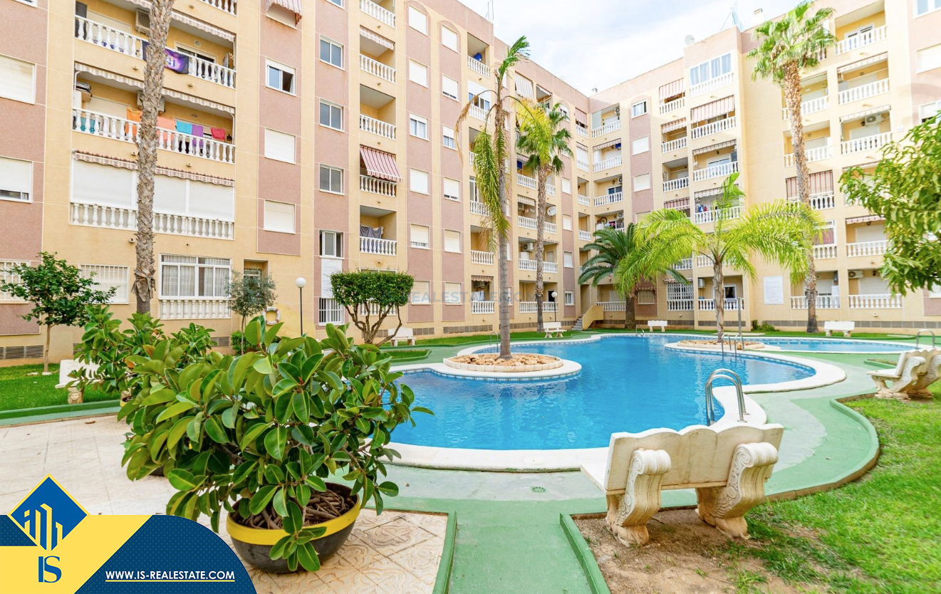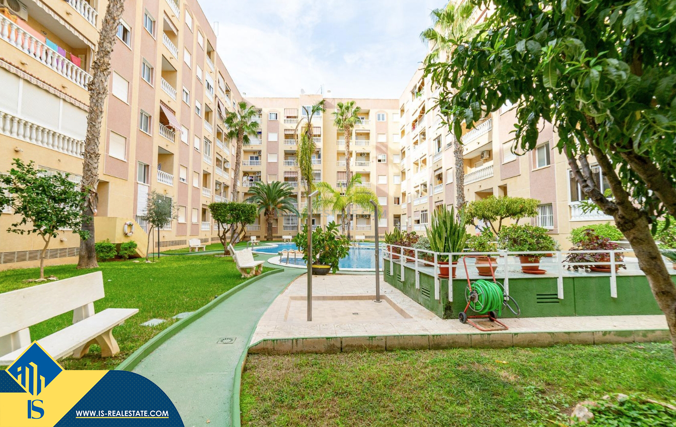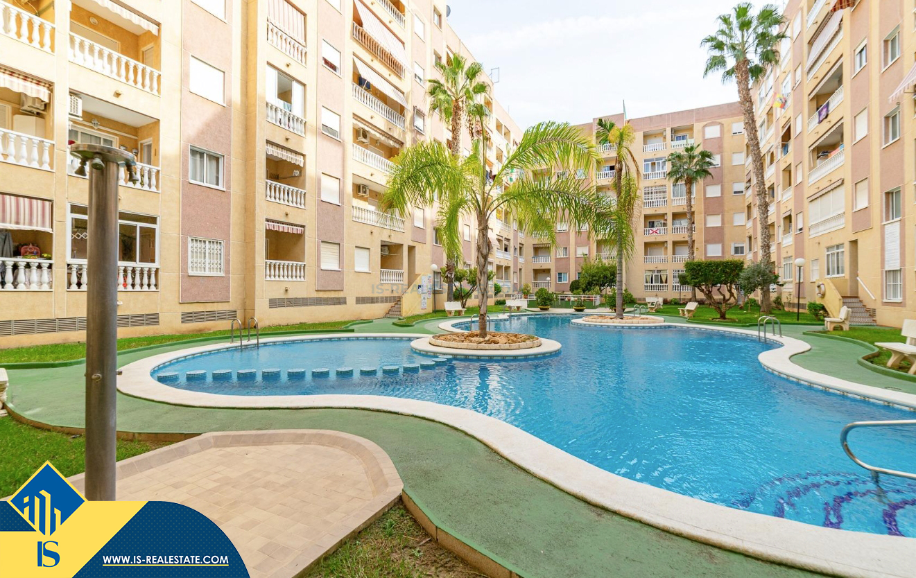 2-jų kambarių apartamentas su bendru baseinu, Ispanijoje, Alicante provincijoje, Torrevieja mieste, bendras plotas 47 m², 900 metrų iki jūros, 45 kilometrai iki Alicante oro uosto. Turtui priklauso bendras baseinas, terasa, liftas. Netoli turto yra parduotuvės, restoranai, vaistinės, autobusų stotelės, degalinės, žalios zonos, kavinės
