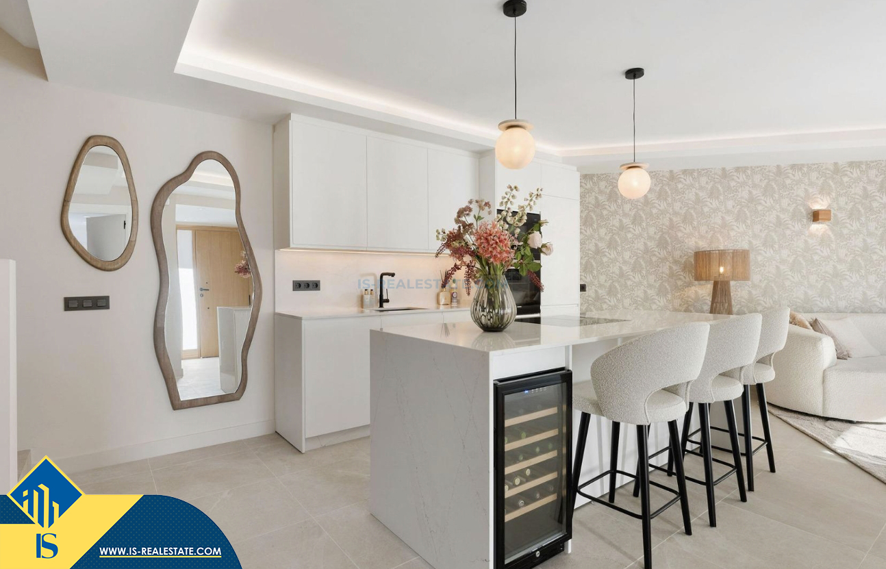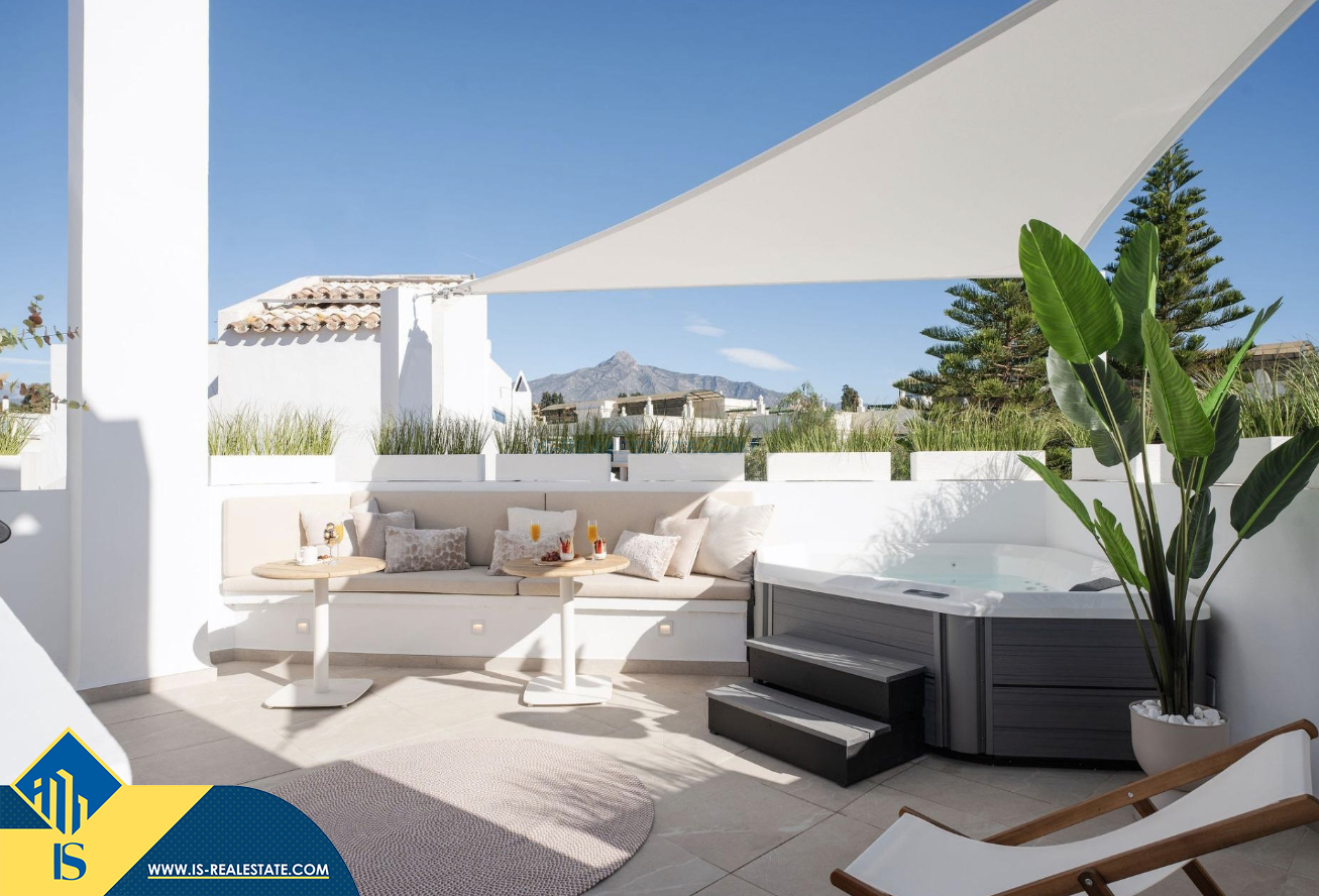 4-ių kambarių renovuotas namas su bendru baseinu, Ispanijoje, Malaga provincijoje, Marbella mieste, Nueva Andalucia rajone, bendras plotas 235 m², 2 kilometrai iki jūros, 57 kilometrai iki Malaga oro uosto. Turtui priklauso bendras baseinas, terasa, balkonas, vieta automobiliui. Netoli turto yra parduotuvės, restoranai, autobusų stotelės, vaikų zonos, degalinės, žalios zonos, kavinės, vaistinės, ligoninė