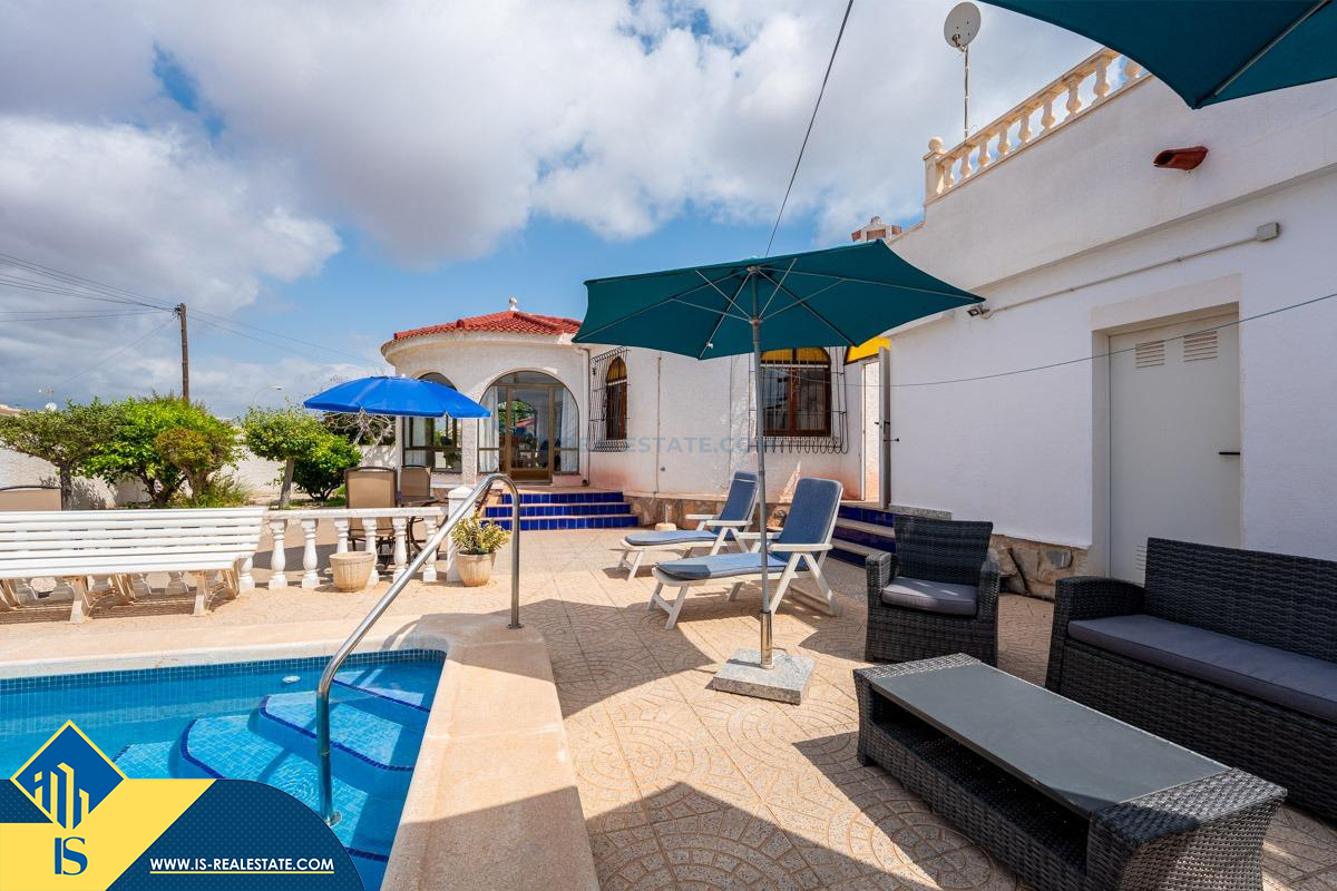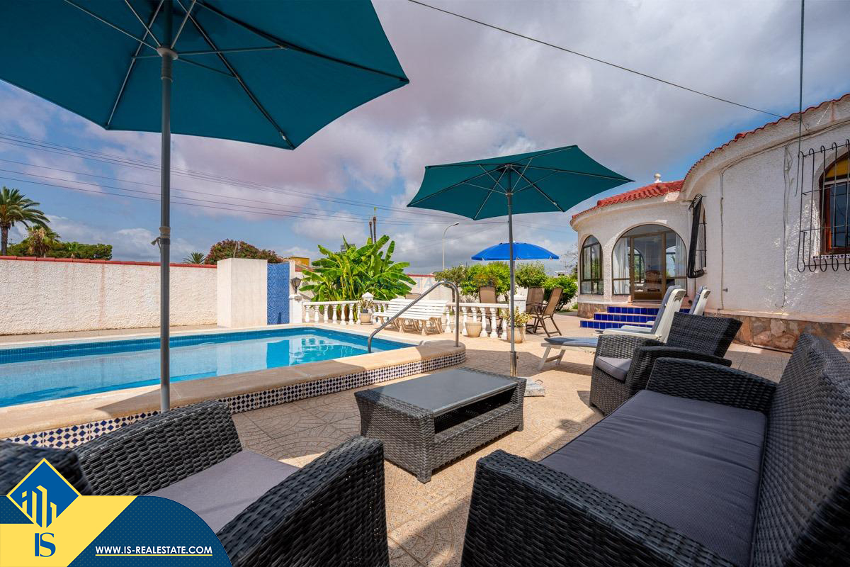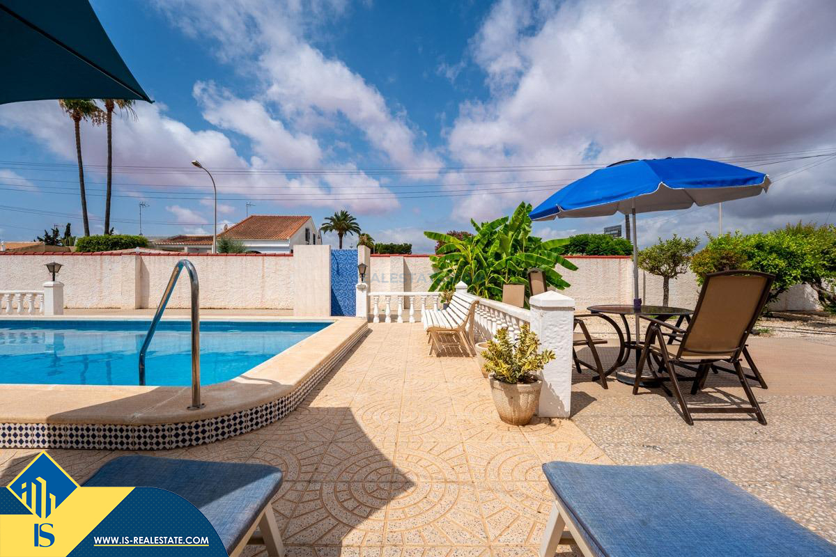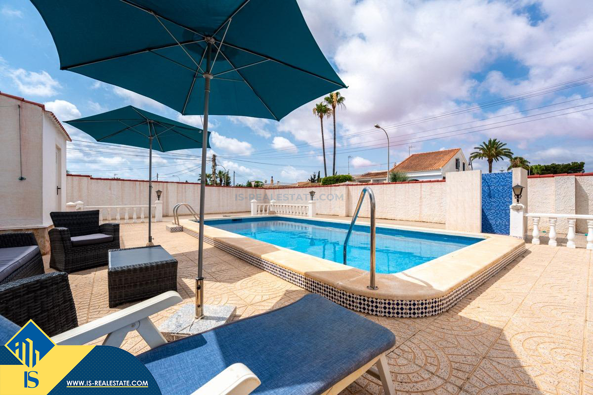 4-ių kambarių vila su privačiu baseinu, Ispanijoje, Alicante provincijoje, Torrevieja mieste, El Chaparral rajone, bendras plotas 85 m², 4 kilometrai iki paplūdimio, 45 kilometrai iki Alicante miesto oro uosto. Turtui priklauso kiemas, privatus baseinas, terasa, vieta automobiliui. Netoli turto yra parduotuvės, restoranai, autobusų stotelės, vaikų zonos, degalinės, žalios zonos, kavinės, vaistinės