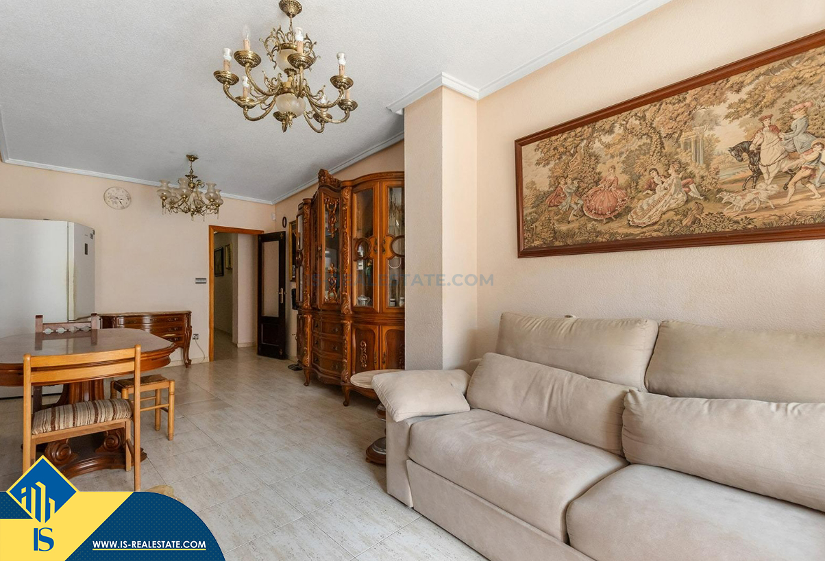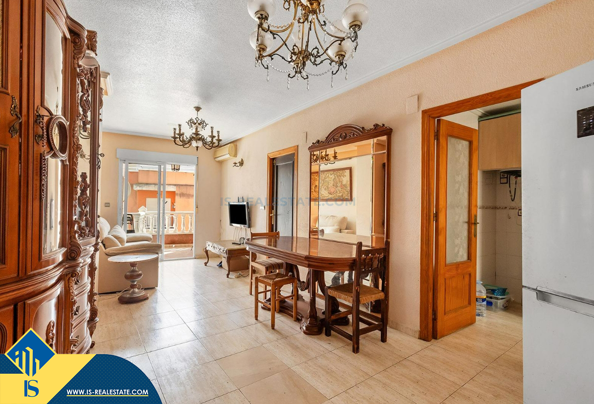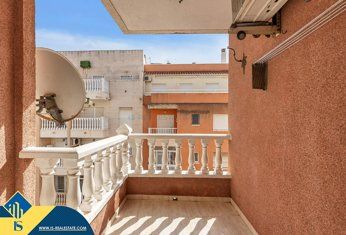 4-ių kambarių apartamentas su terasa, Ispanijoje, Alicante provincijoje, Torrevieja mieste, bendras plotas 96 m², 600 metrų iki jūros, 45 kilometrai iki Alicante oro uosto. Turtui priklauso terasa, liftas. Netoli turto yra parduotuvės, restoranai, vaistinės, autobusų stotelės, degalinės, žalios zonos, kavinės