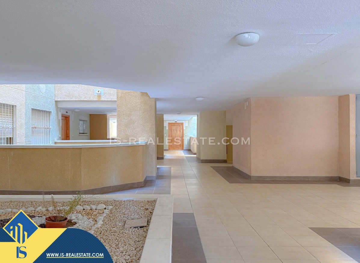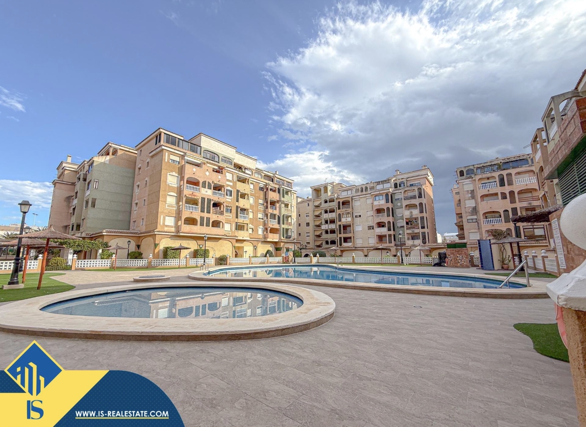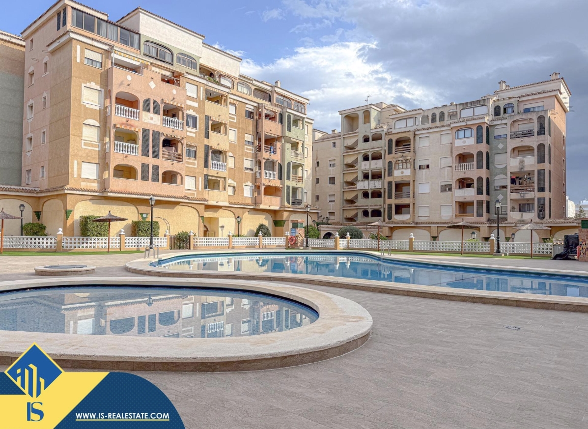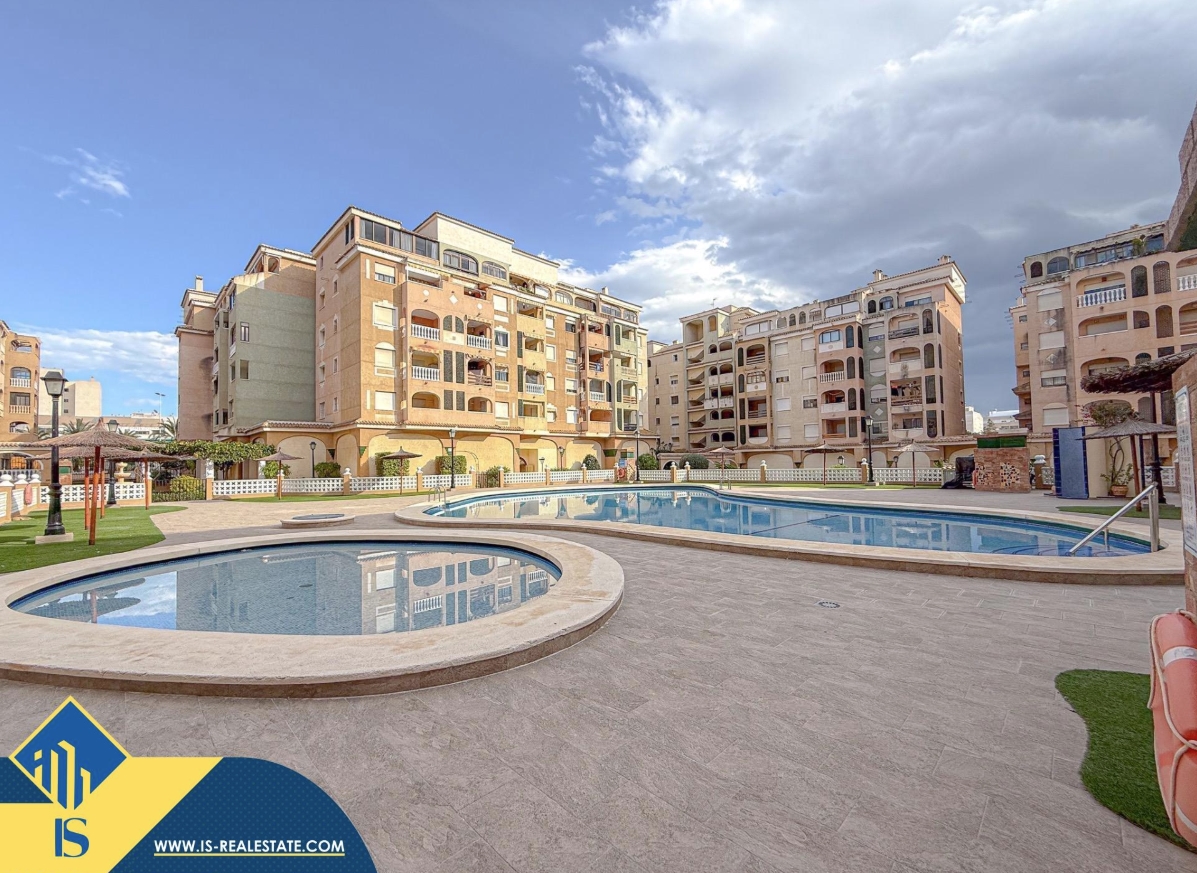 3-jų kambarių apartamentas su bendru baseinu, Ispanijoje, Alicante provincijoje, Torrevieja mieste, bendras plotas 90 m², 900 metrų iki jūros, 45 kilometrai iki Alicante oro uosto. Turtui priklauso bendras baseinas, terasa, liftas, garažas. Netoli turto yra parduotuvės, restoranai, vaistinės, autobusų stotelės, degalinės, žalios zonos, kavinės