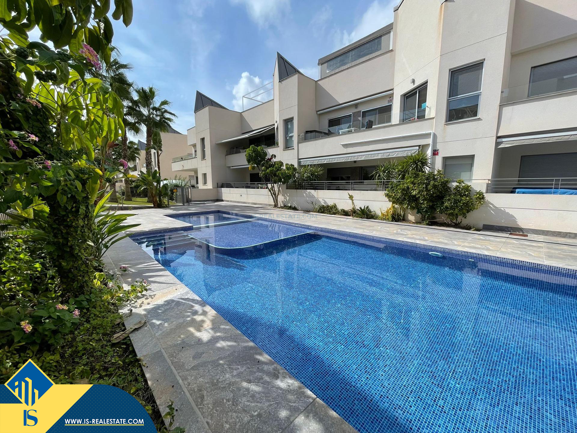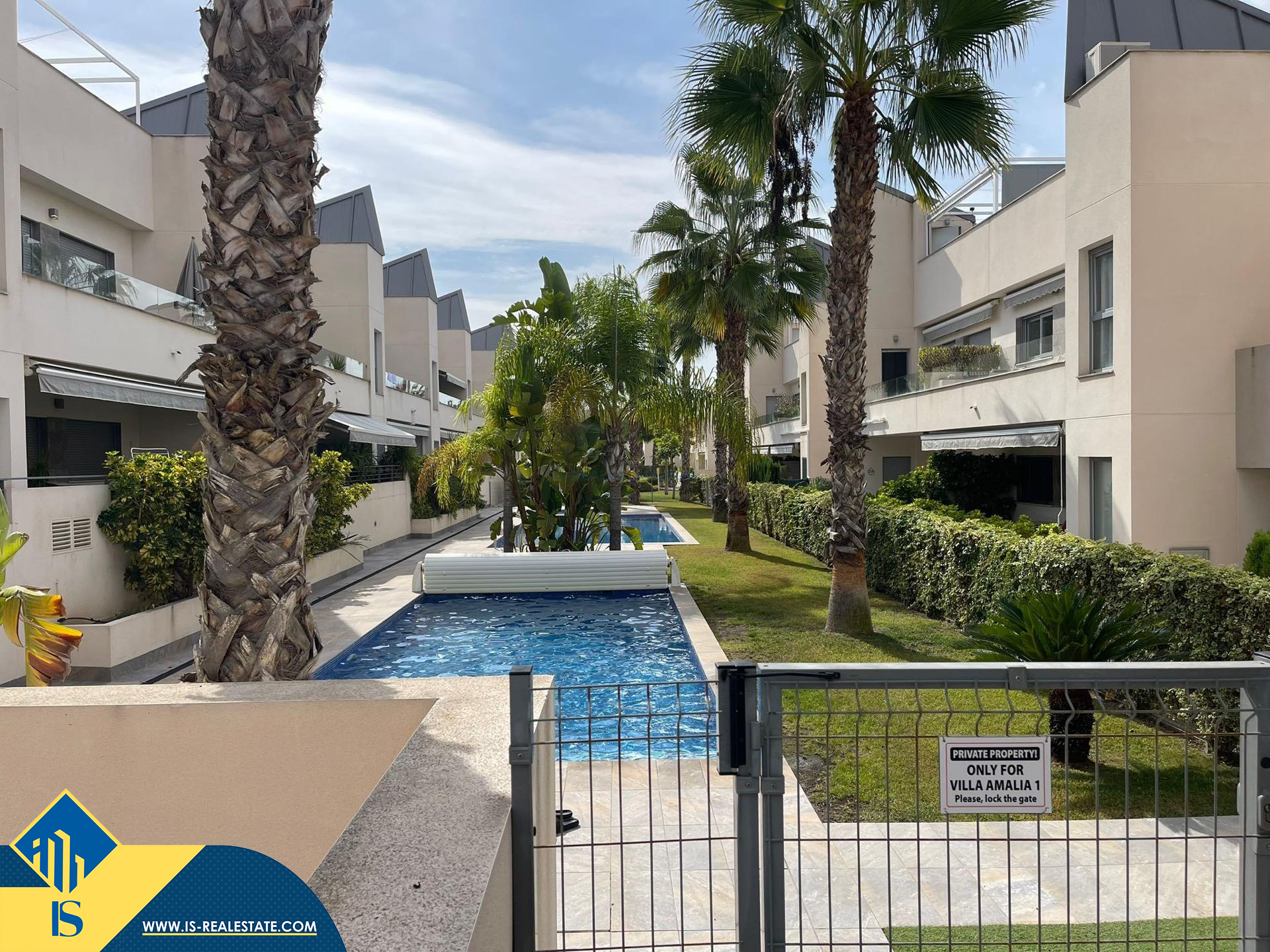 3-jų kambarių bungalas su bendru baseinu, Ispanijoje, Alicante provincijoje, Torrevieja mieste, Playa del Acequión rajone, bendras plotas 90 m², 300 metrų iki jūros, 45 kilometrai iki Alicante miesto oro uosto. Netoli turto yra parduotuvės, restoranai, vaistinės, autobusų stotelės, degalinės, žalios zonos, kavinės