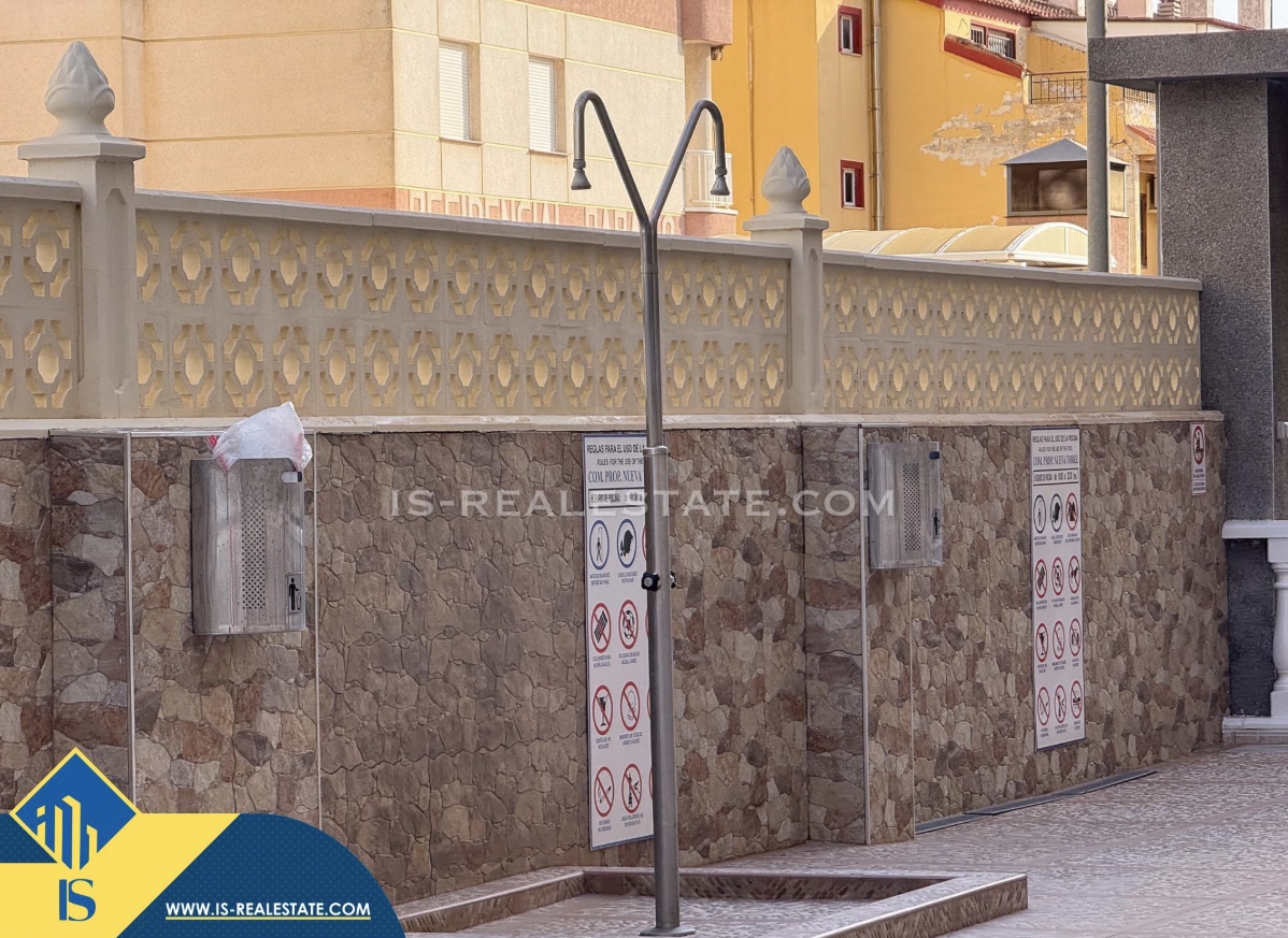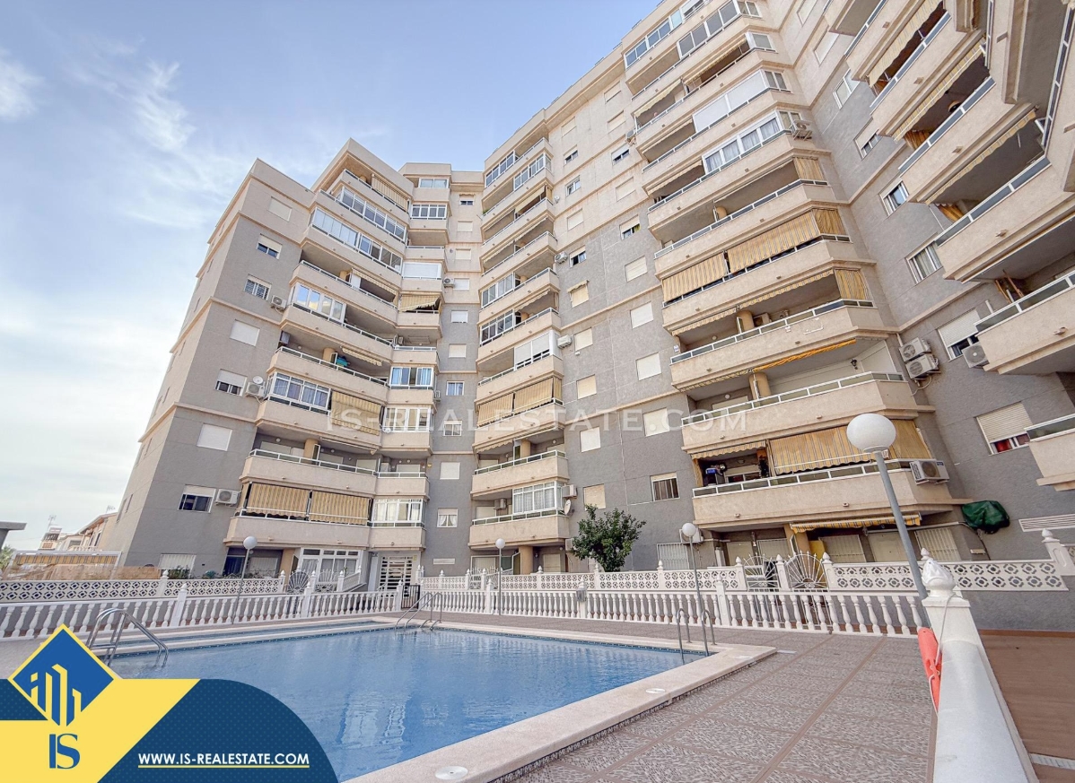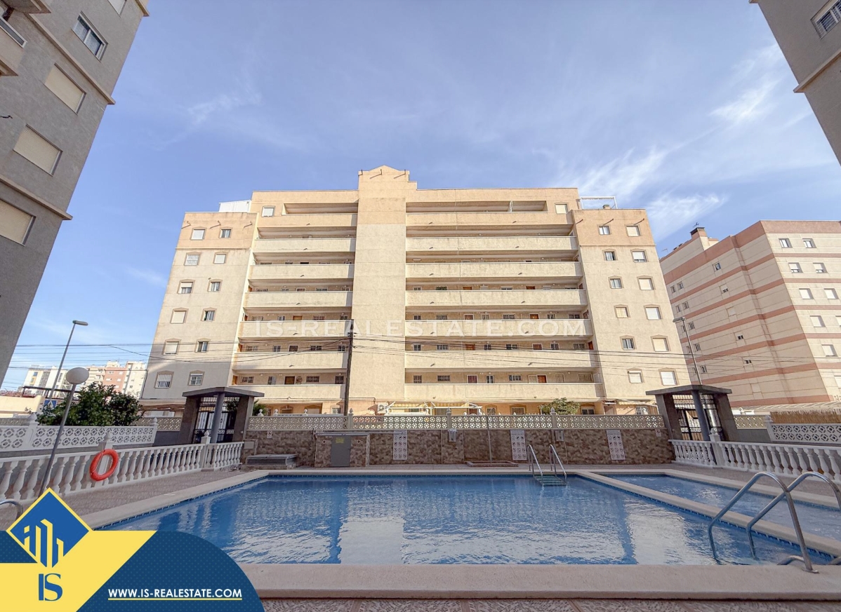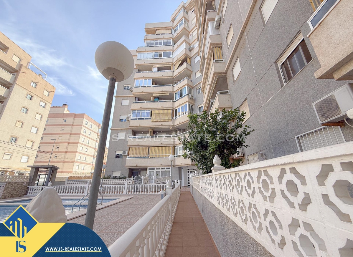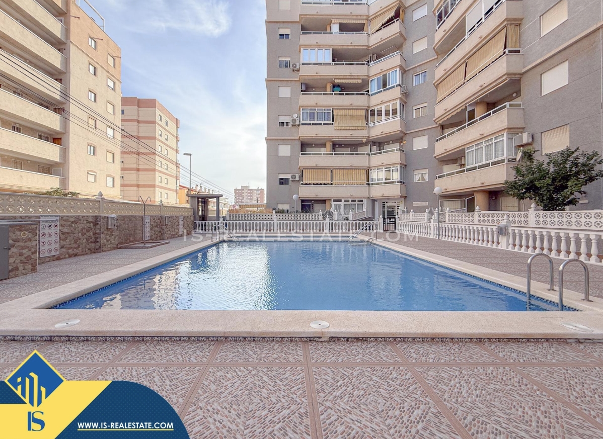 3-jų kambarių apartamentas su bendru baseinu, Ispanijoje, Alicante provincijoje, Torrevieja mieste, bendras plotas 58 m², 1.5 kilometro iki jūros, 45 kilometrai iki Alicante oro uosto. Turtui priklauso bendras baseinas, terasa, liftas, garažas. Netoli turto yra parduotuvės, restoranai, vaistinės, autobusų stotelės, degalinės, žalios zonos, kavinės