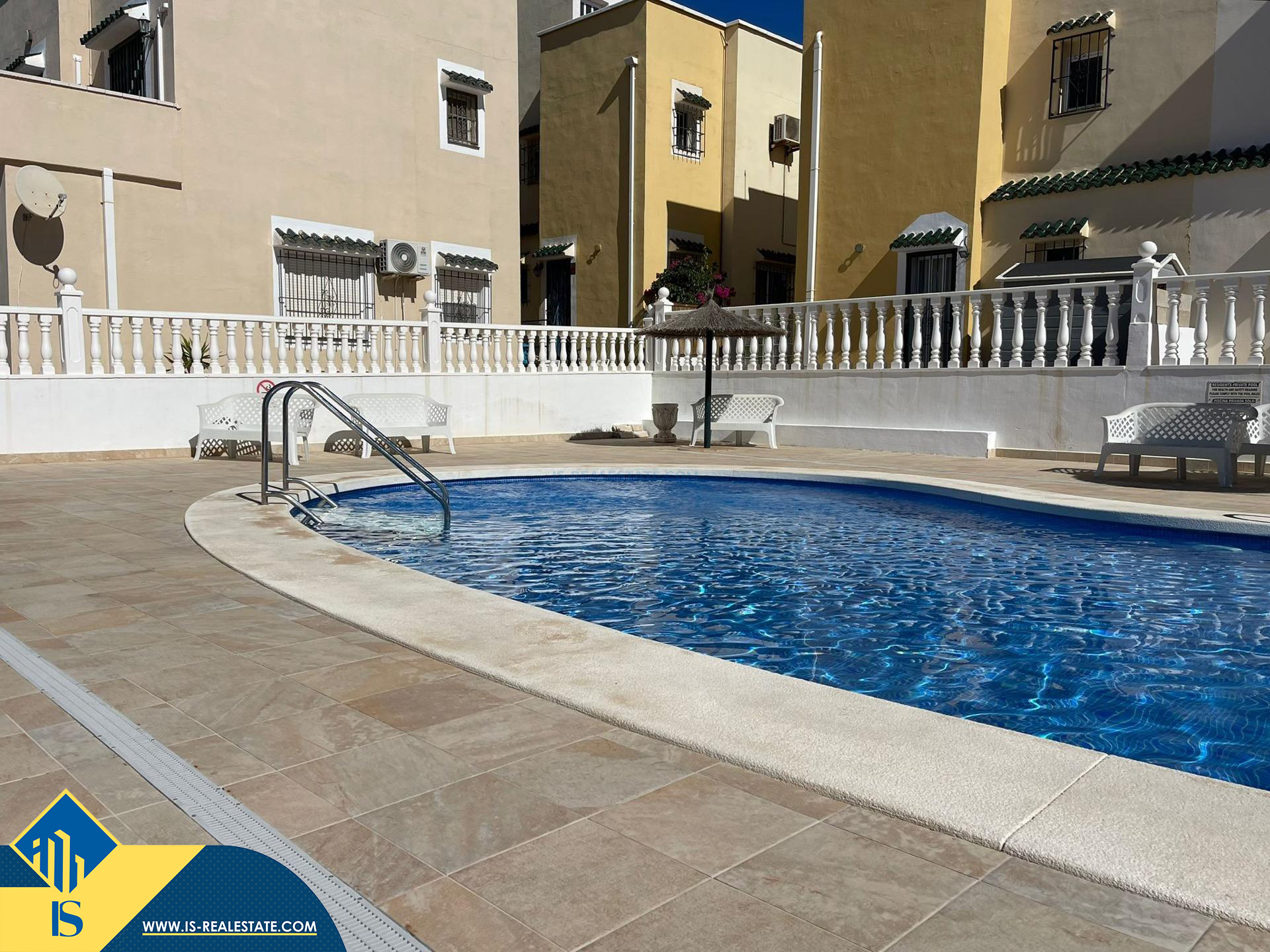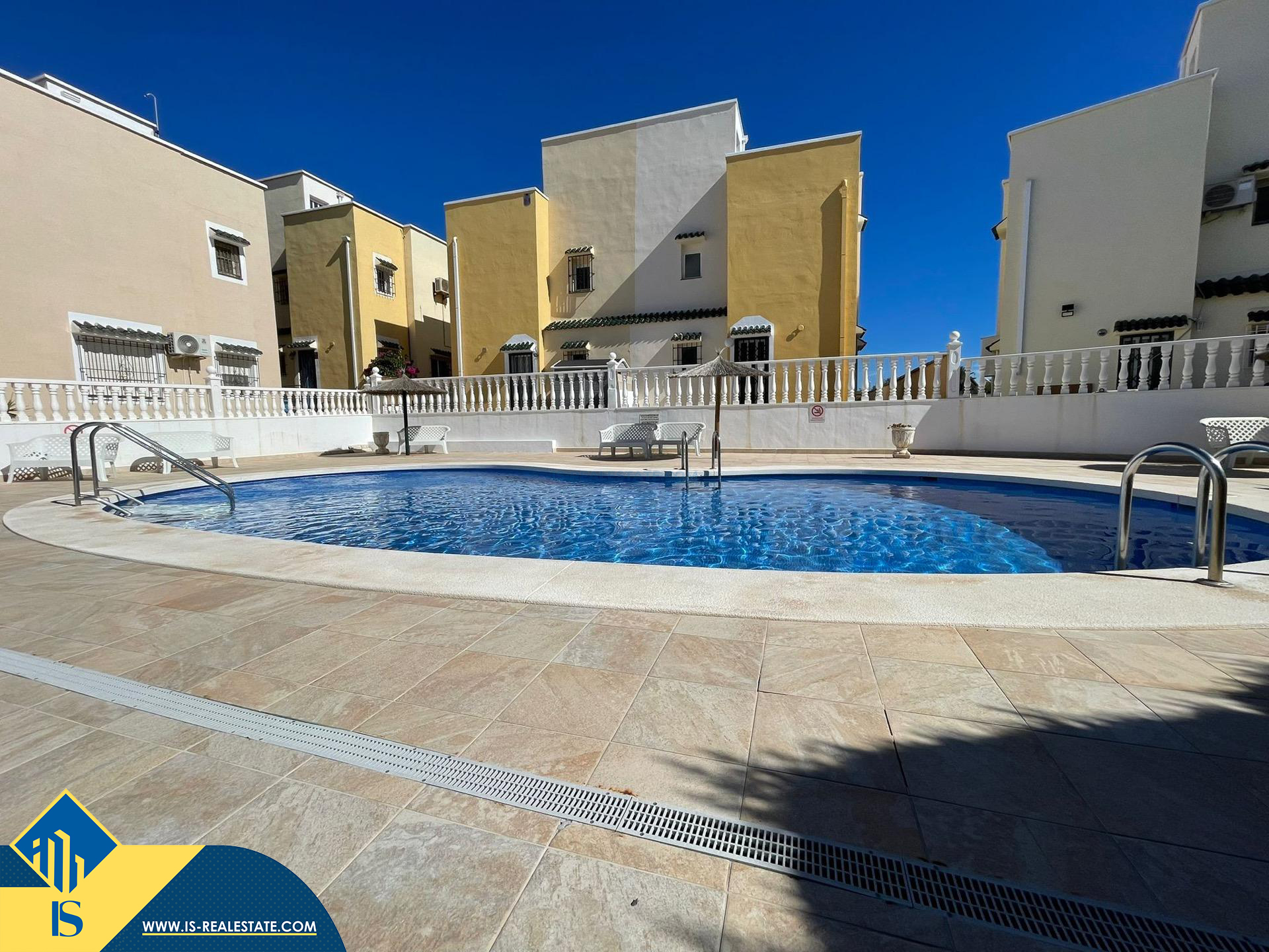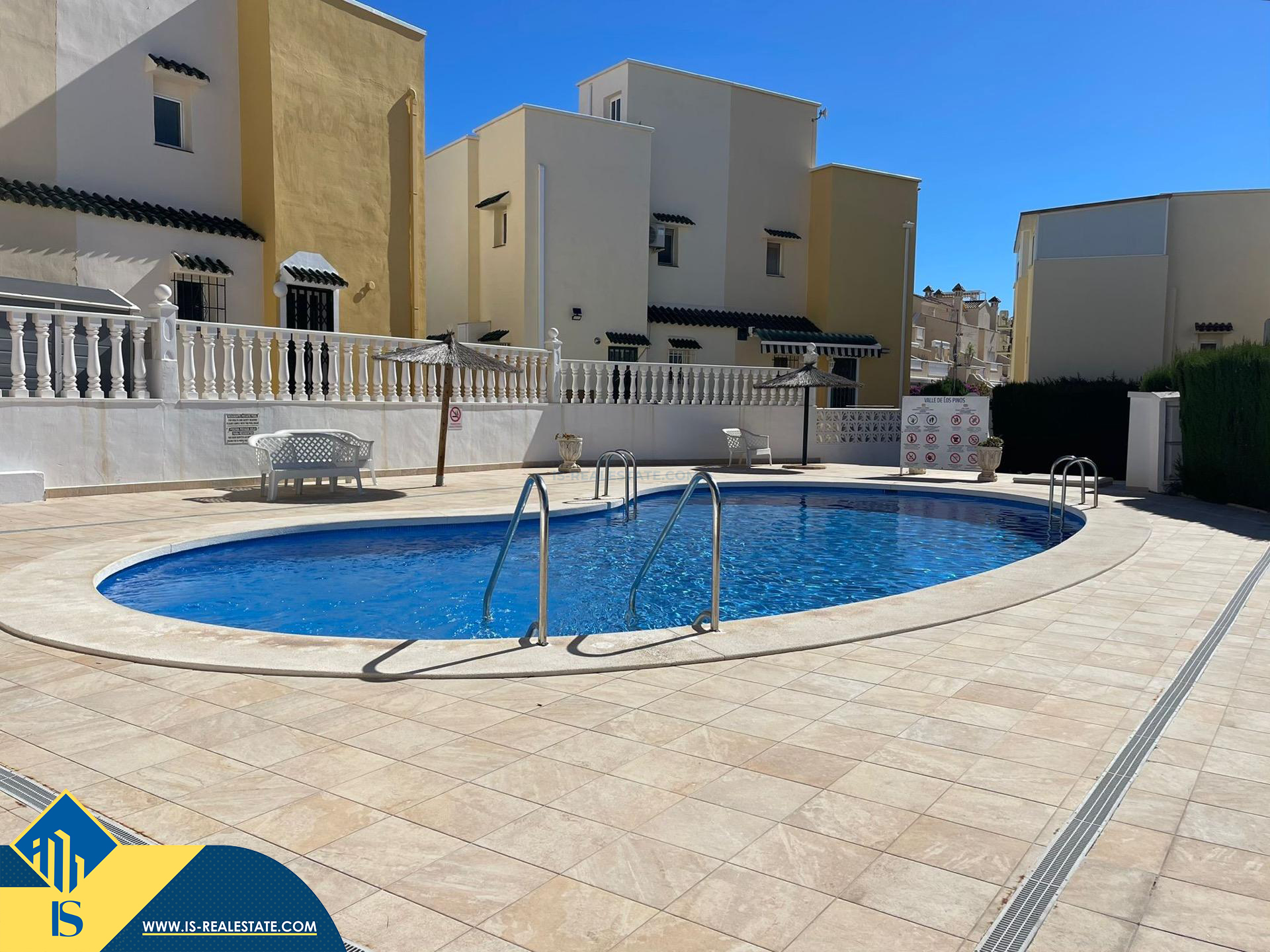 4-ių kambarių bungalas su bendru baseinu, Ispanijoje, Alicante provincijoje, Orihuela Costa mieste, bendras plotas 82 m², 2 kilometrai iki jūros, 57 kilometrai iki Alicante oro uosto. Turtui priklauso bendras baseinas, terasa, privatus kiemas. Netoli turto yra parduotuvės, restoranai, autobusų stotelės, vaikų zonos, degalinės, žalios zonos, kavinės, ligoninė