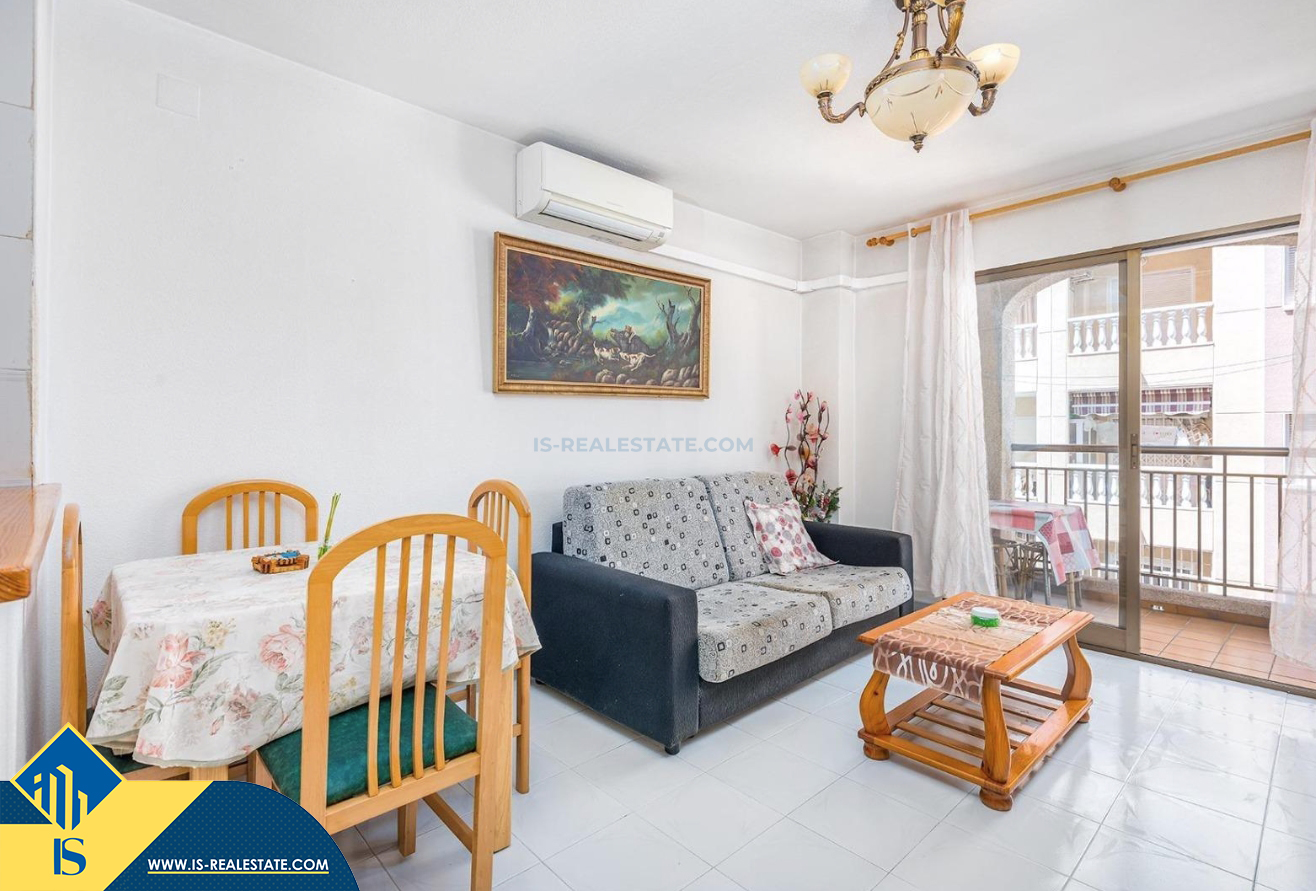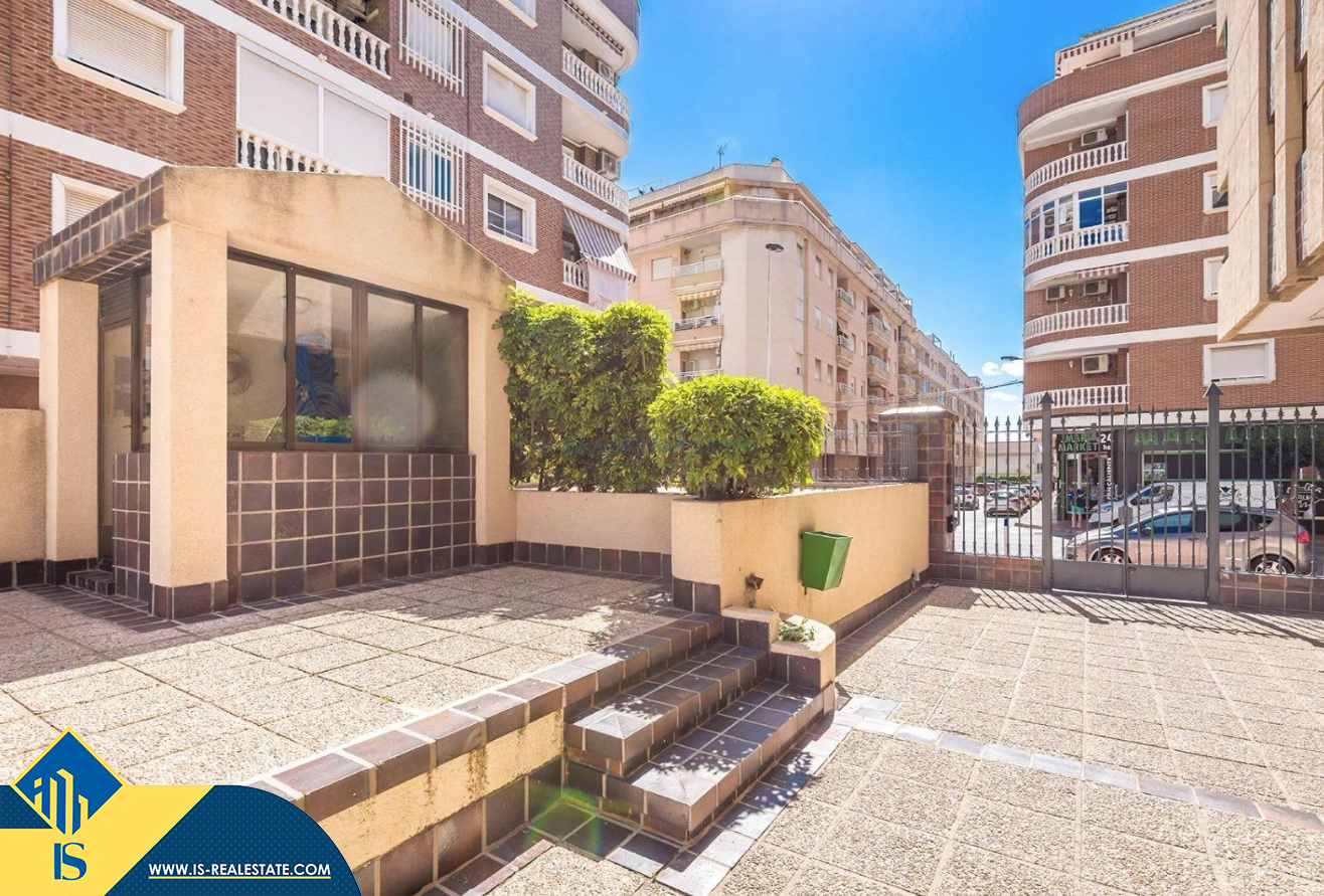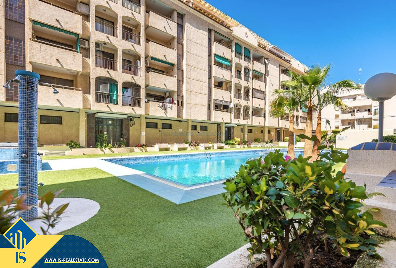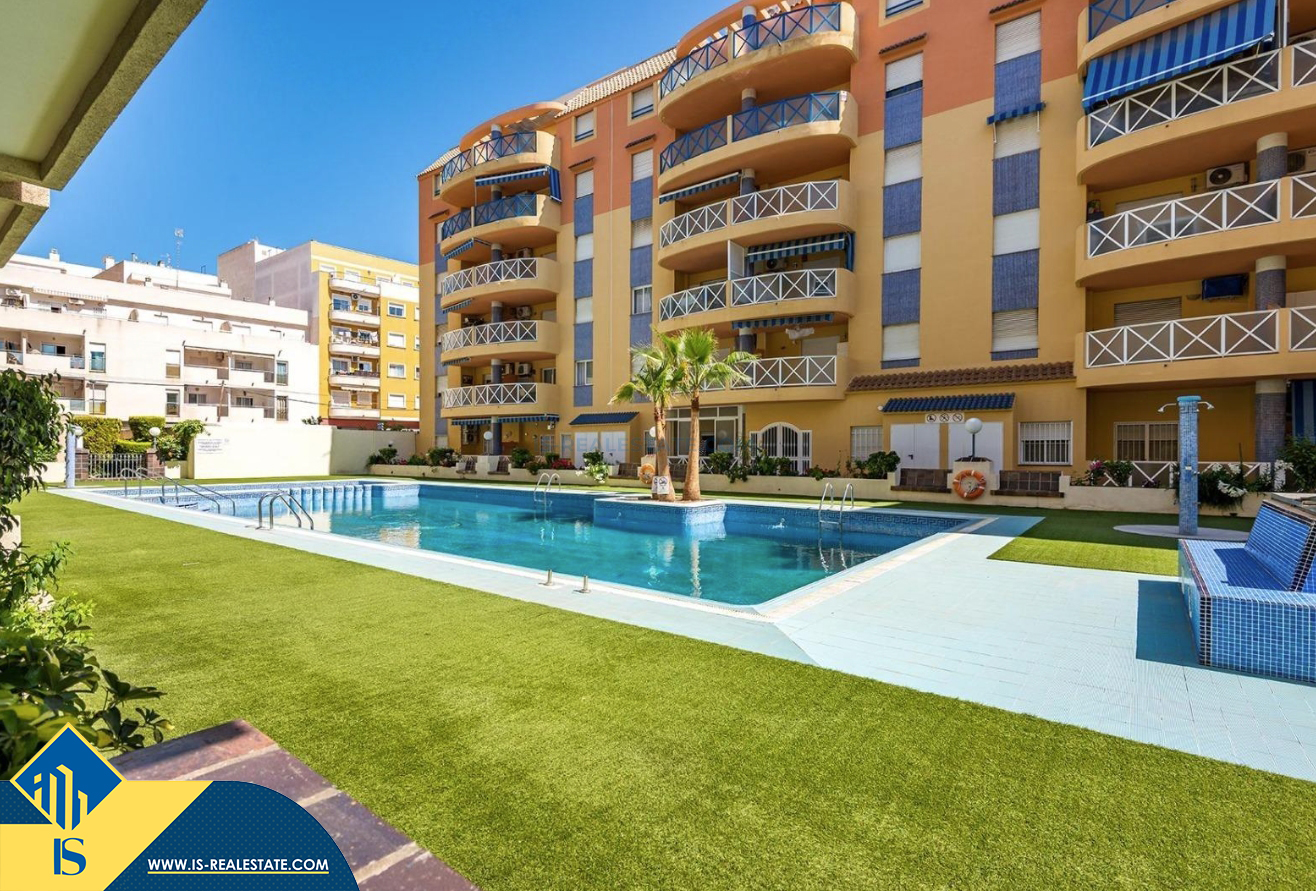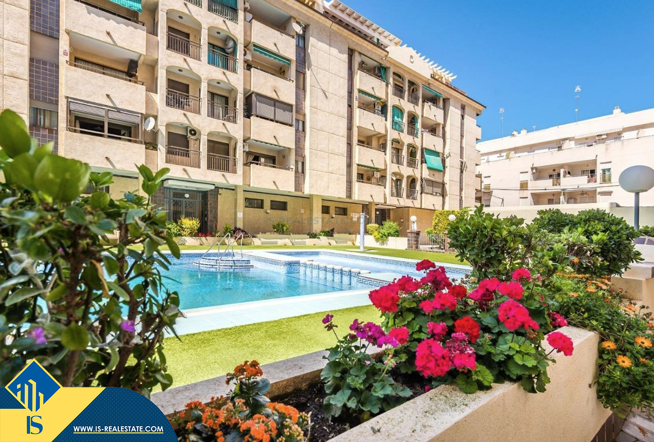 2-jų kambarių apartamentas su bendru baseinu, Ispanijoje, Alicante provincijoje, Torrevieja mieste, bendras plotas 50 m², 700 metrų iki jūros, 45 kilometrai iki Alicante oro uosto. Turtui priklauso bendras baseinas, terasa, liftas. Netoli turto yra parduotuvės, restoranai, vaistinės, autobusų stotelės, degalinės, žalios zonos, kavinės
