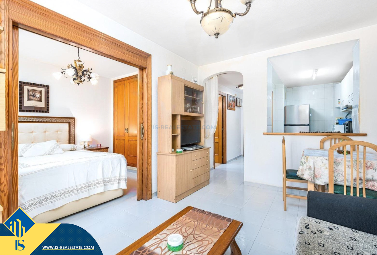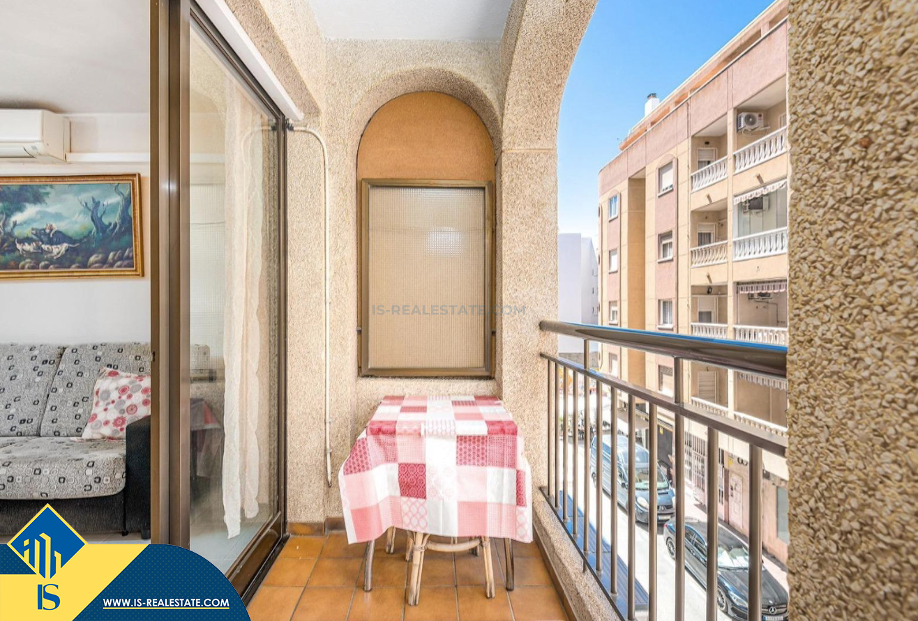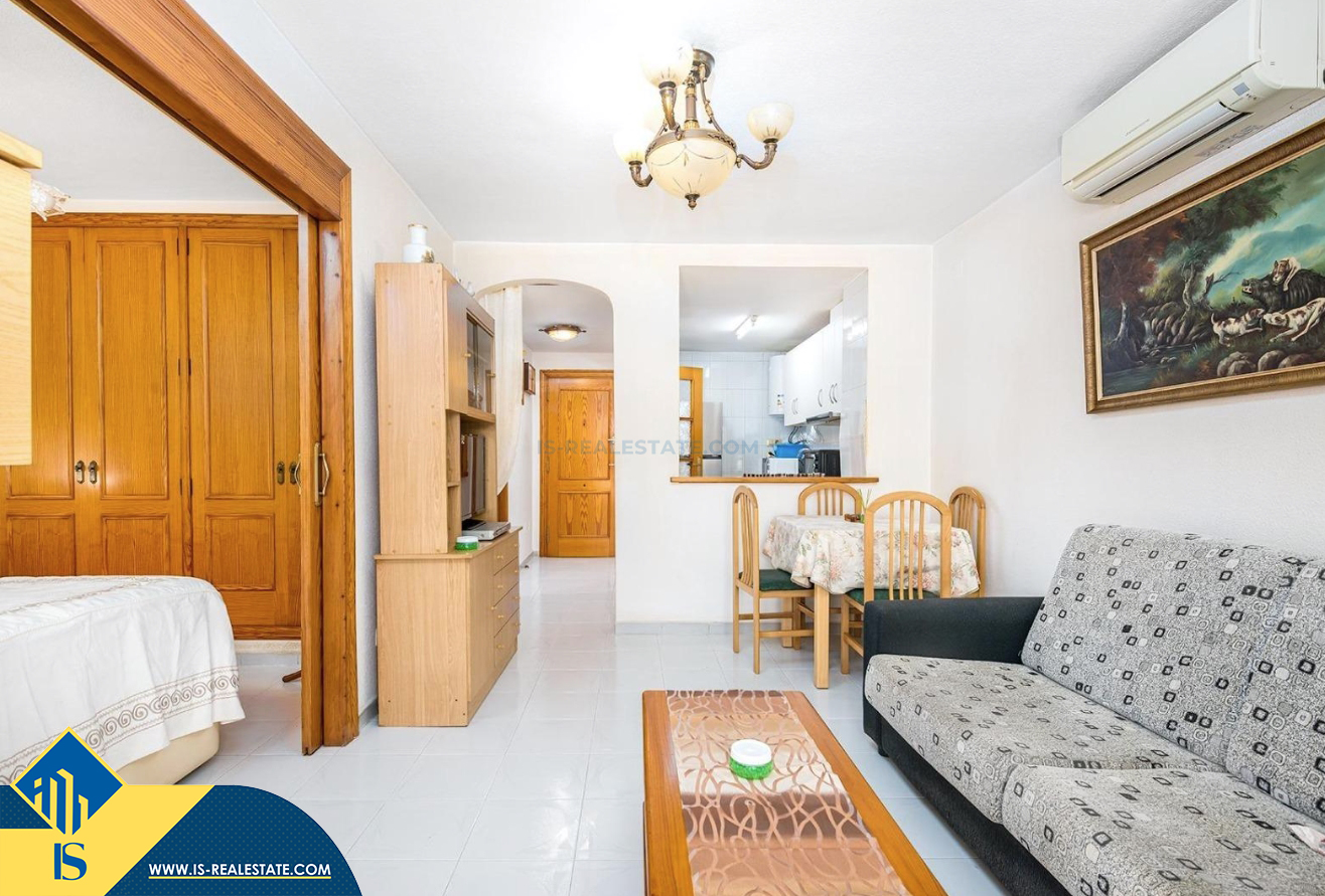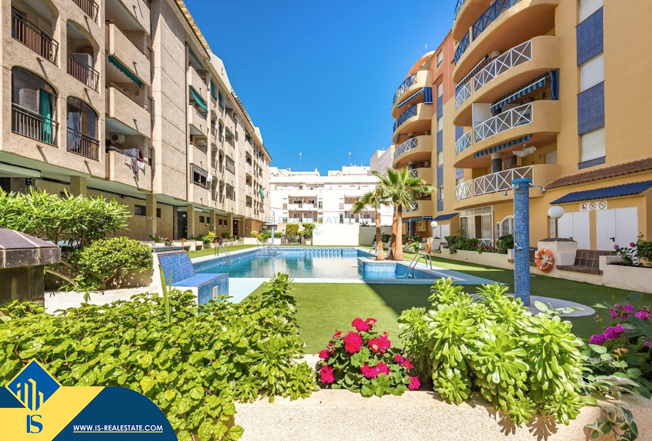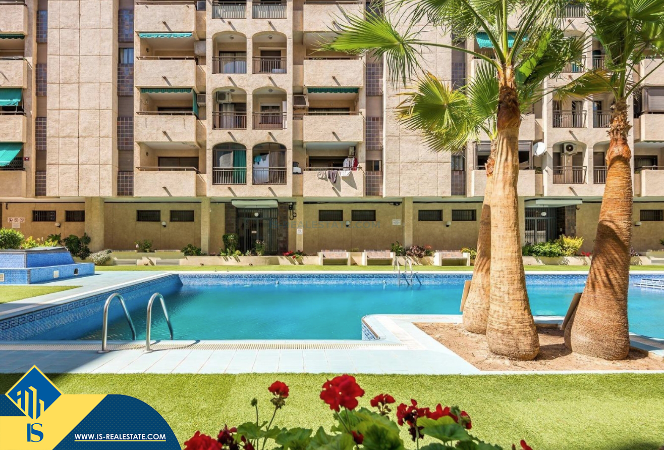 2-jų kambarių apartamentas su bendru baseinu, Ispanijoje, Alicante provincijoje, Torrevieja mieste, bendras plotas 50 m², 700 metrų iki jūros, 45 kilometrai iki Alicante oro uosto. Turtui priklauso bendras baseinas, terasa, liftas. Netoli turto yra parduotuvės, restoranai, vaistinės, autobusų stotelės, degalinės, žalios zonos, kavinės