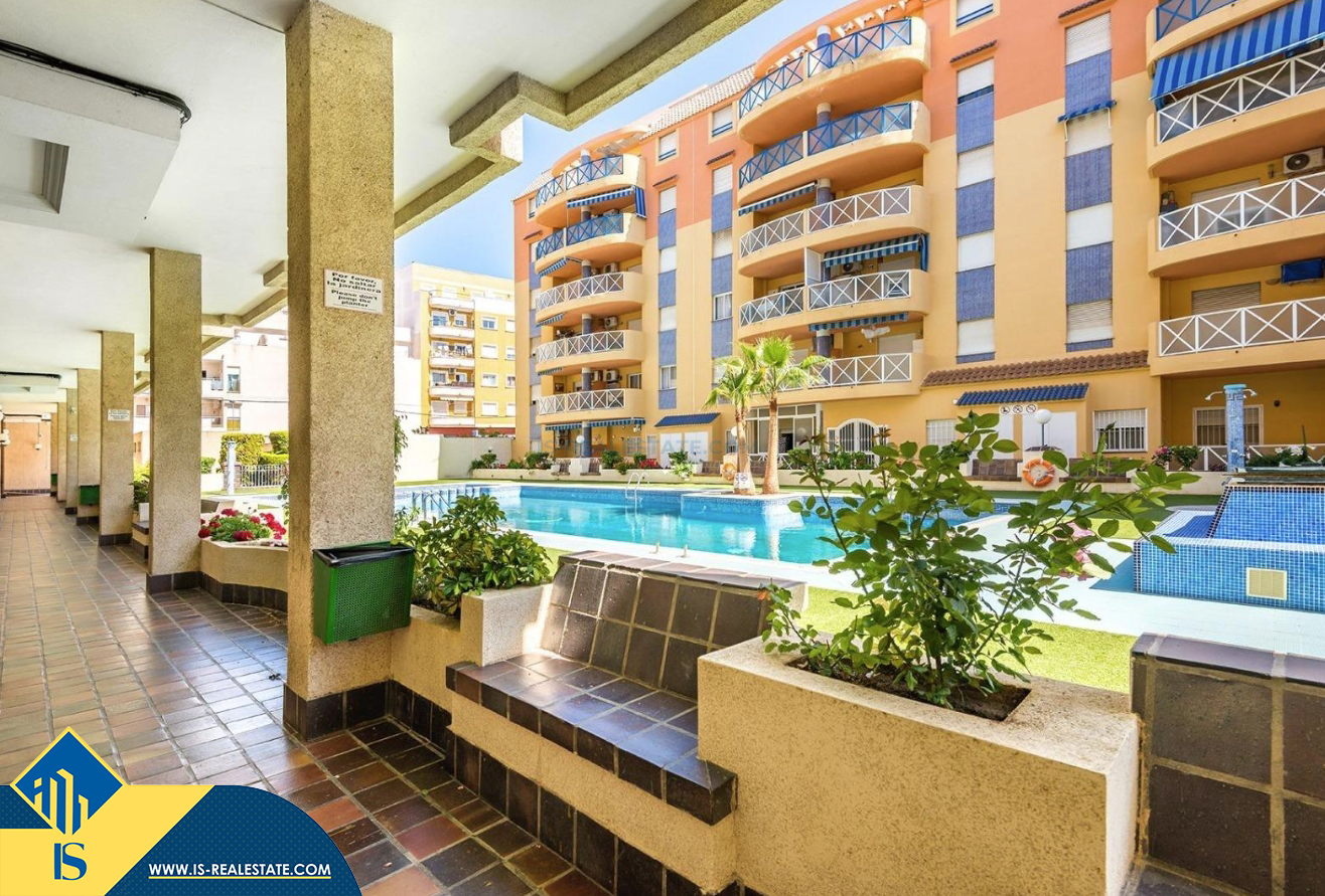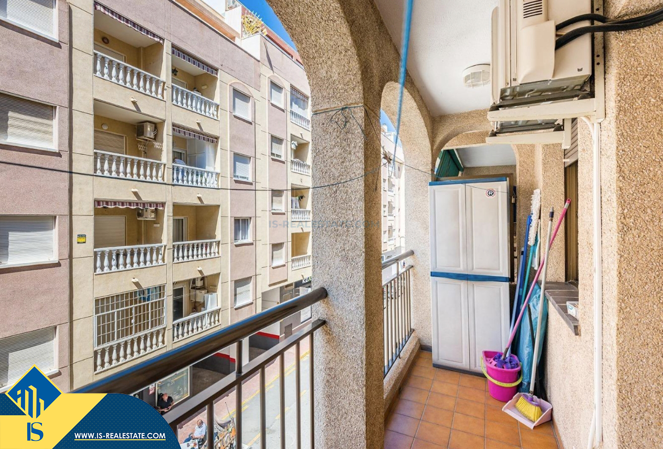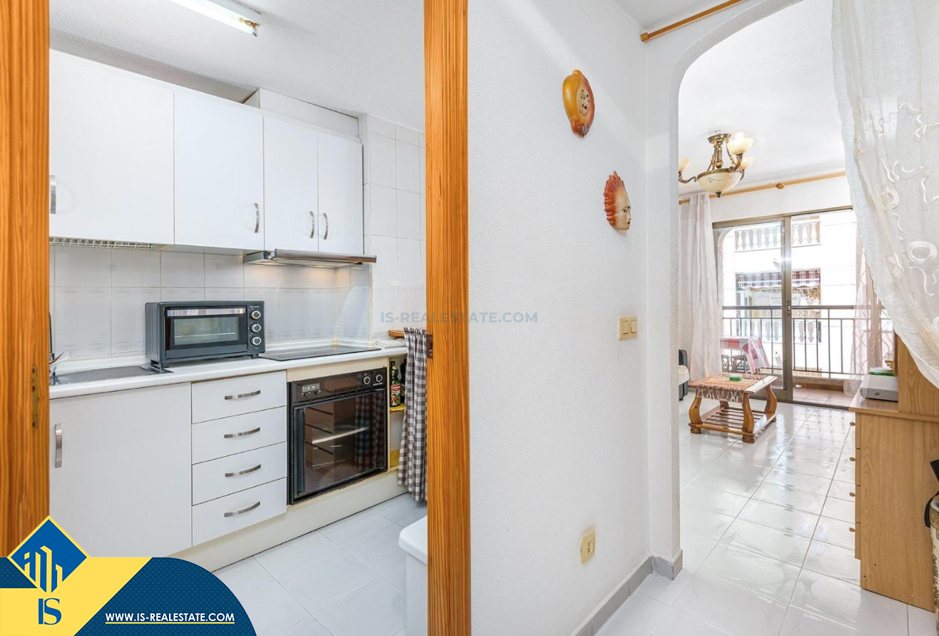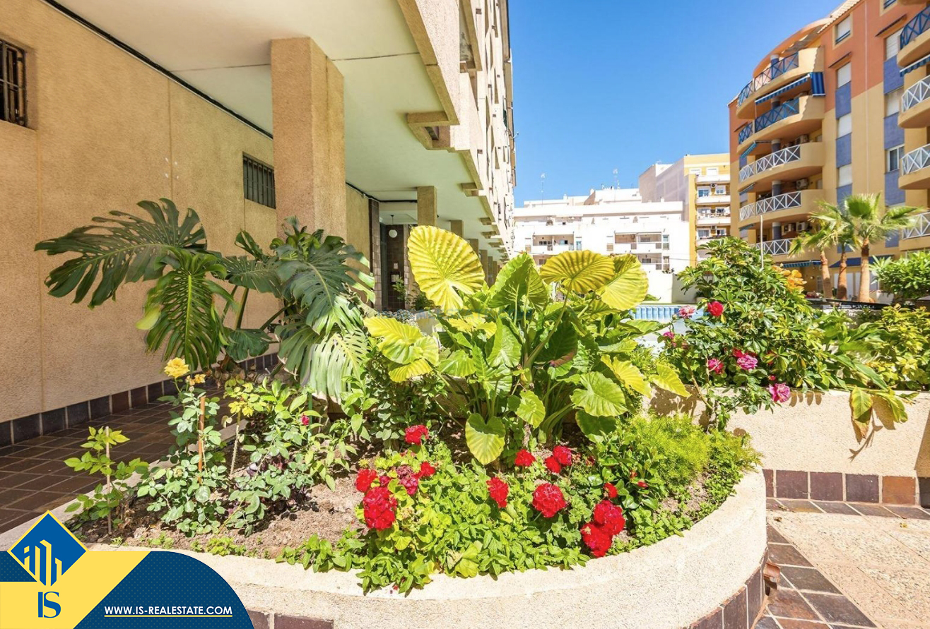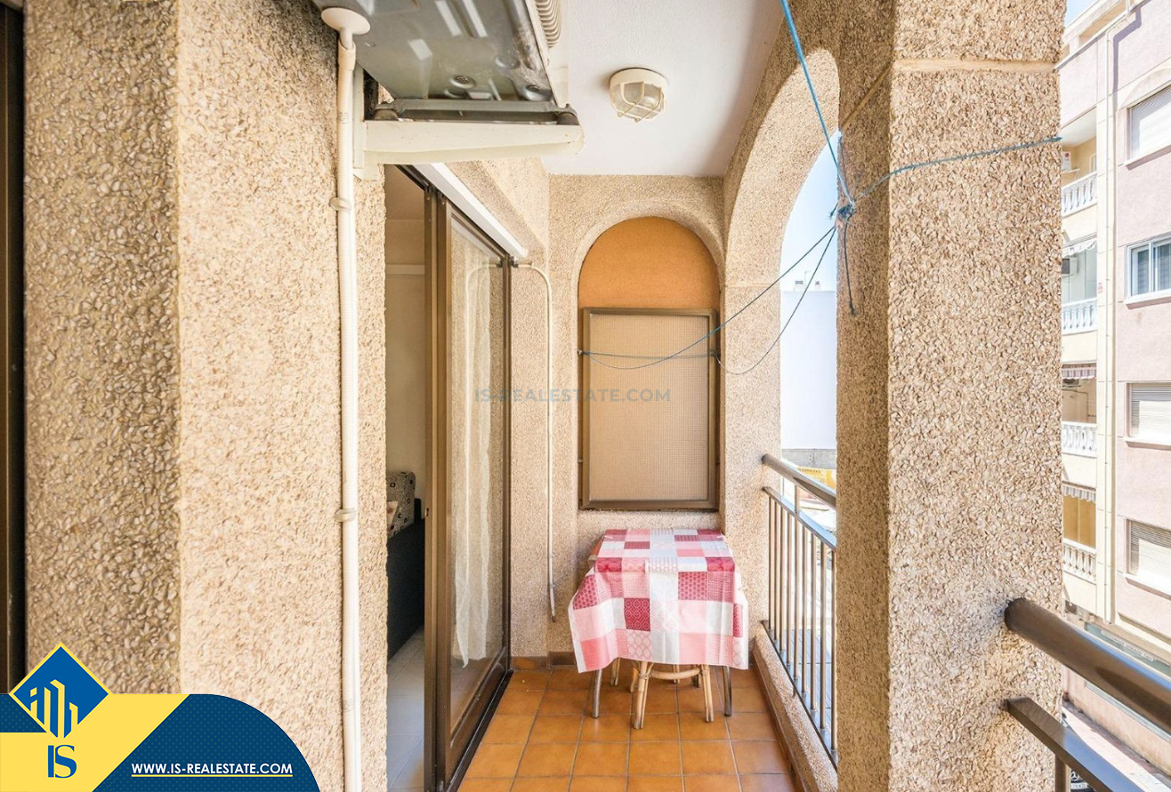 2-jų kambarių apartamentas su bendru baseinu, Ispanijoje, Alicante provincijoje, Torrevieja mieste, bendras plotas 50 m², 700 metrų iki jūros, 45 kilometrai iki Alicante oro uosto. Turtui priklauso bendras baseinas, terasa, liftas. Netoli turto yra parduotuvės, restoranai, vaistinės, autobusų stotelės, degalinės, žalios zonos, kavinės