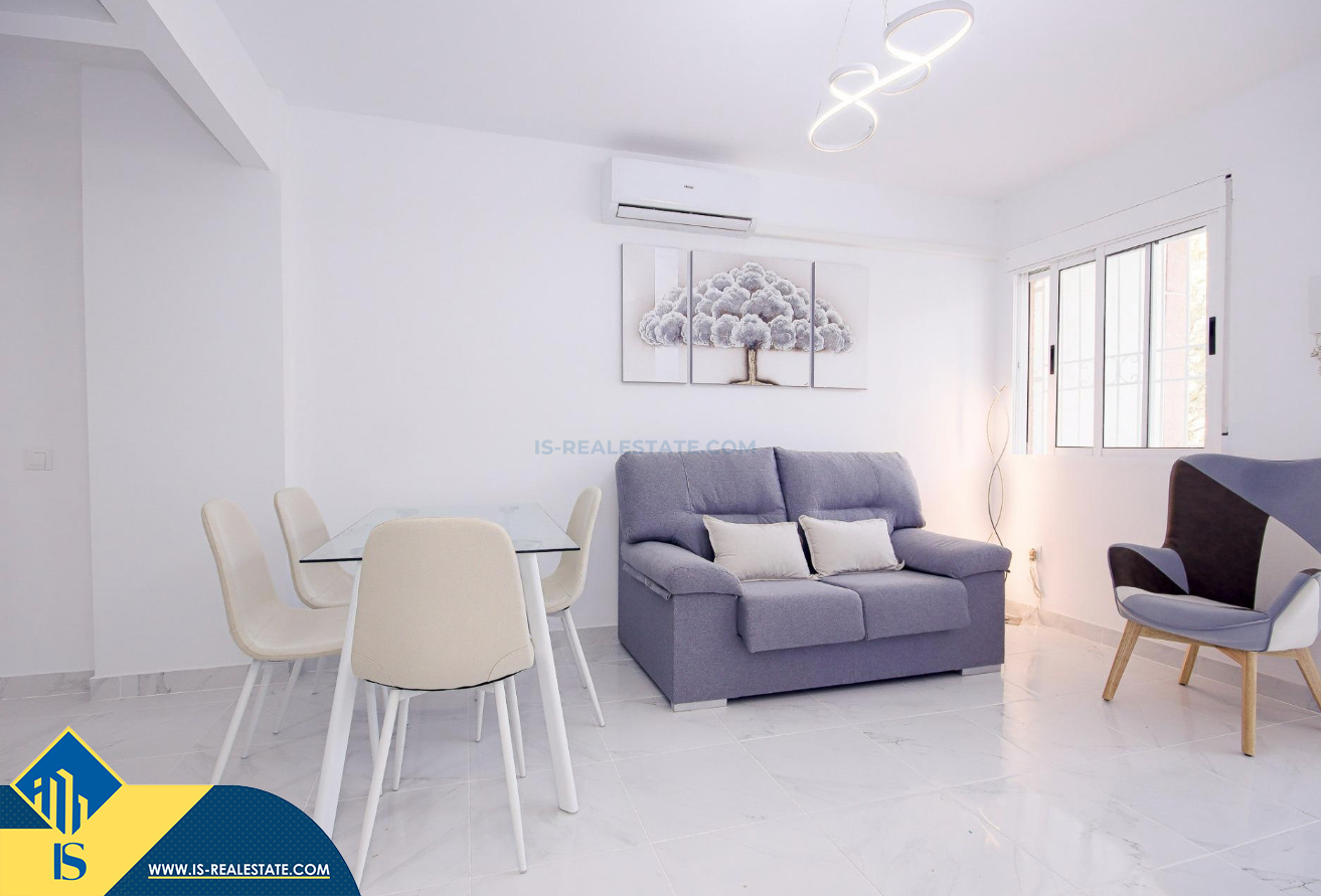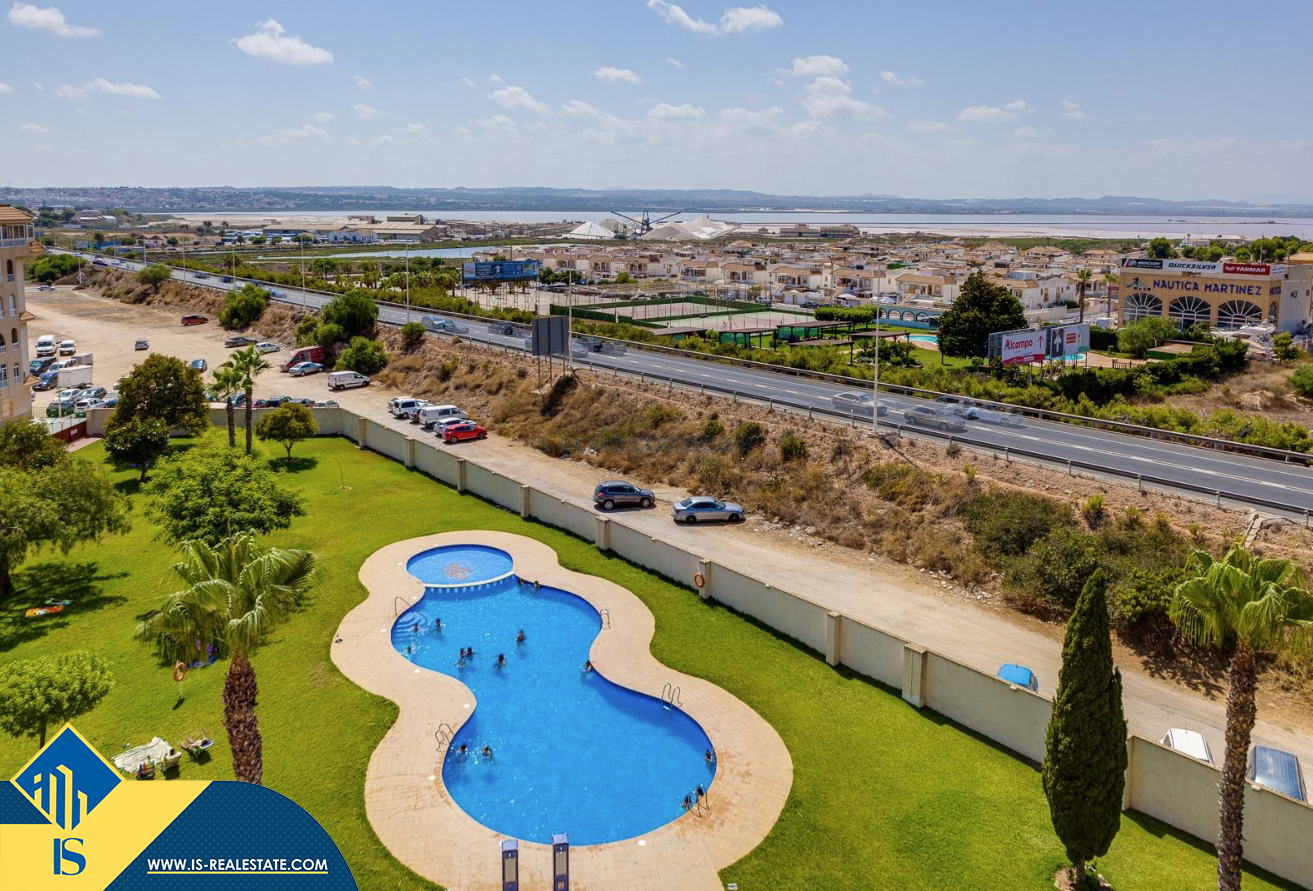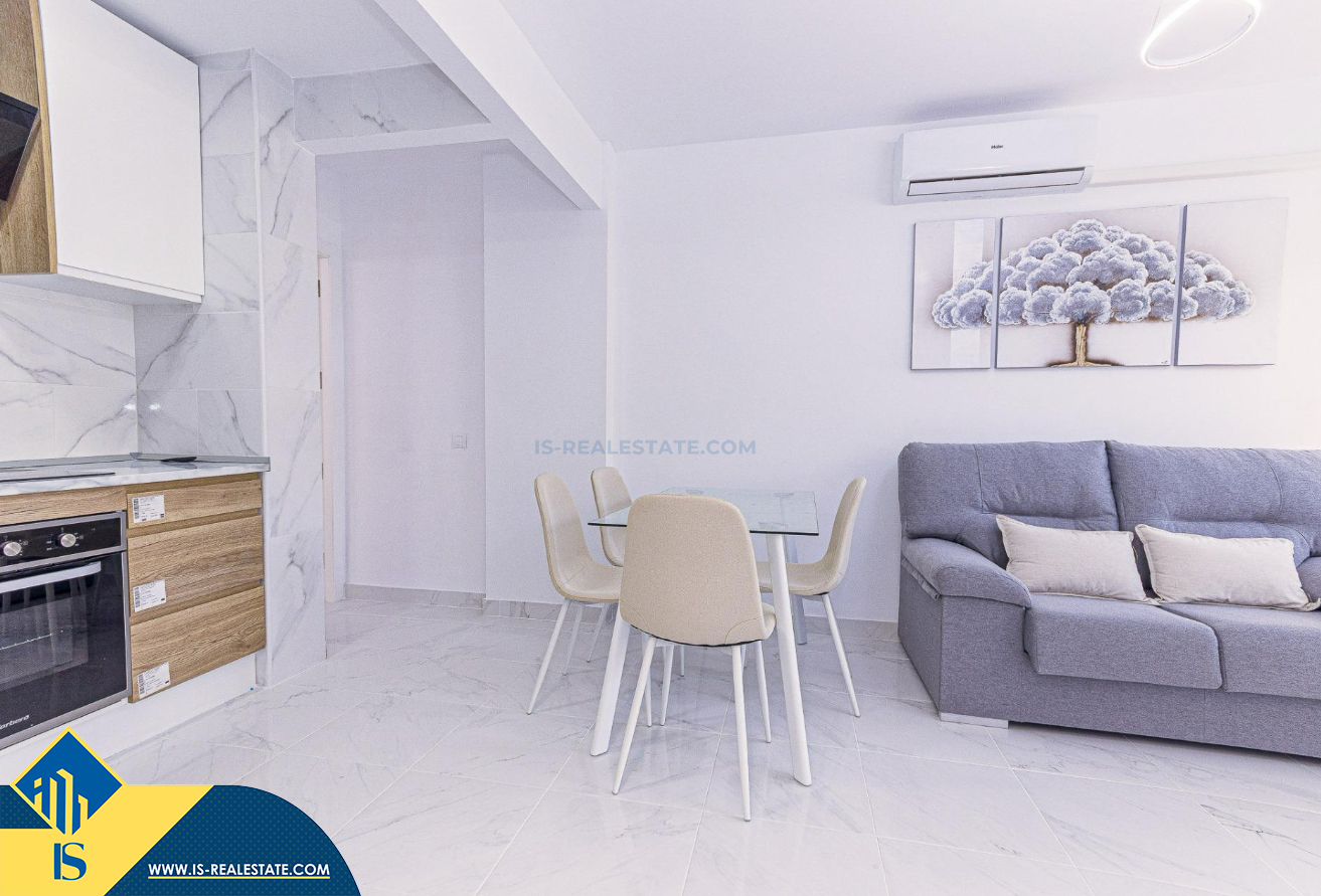 3-jų kambarių renovuotas apartamentas su bendru baseinu, Ispanijoje, Alicante provincijoje, Torrevieja mieste, bendras plotas 52 m², 800 metrų iki jūros, 45 kilometrai iki Alicante oro uosto. Turtui priklauso bendras baseinas, terasa, liftas. Netoli turto yra parduotuvės, restoranai, vaistinės, autobusų stotelės, degalinės, žalios zonos, kavinės