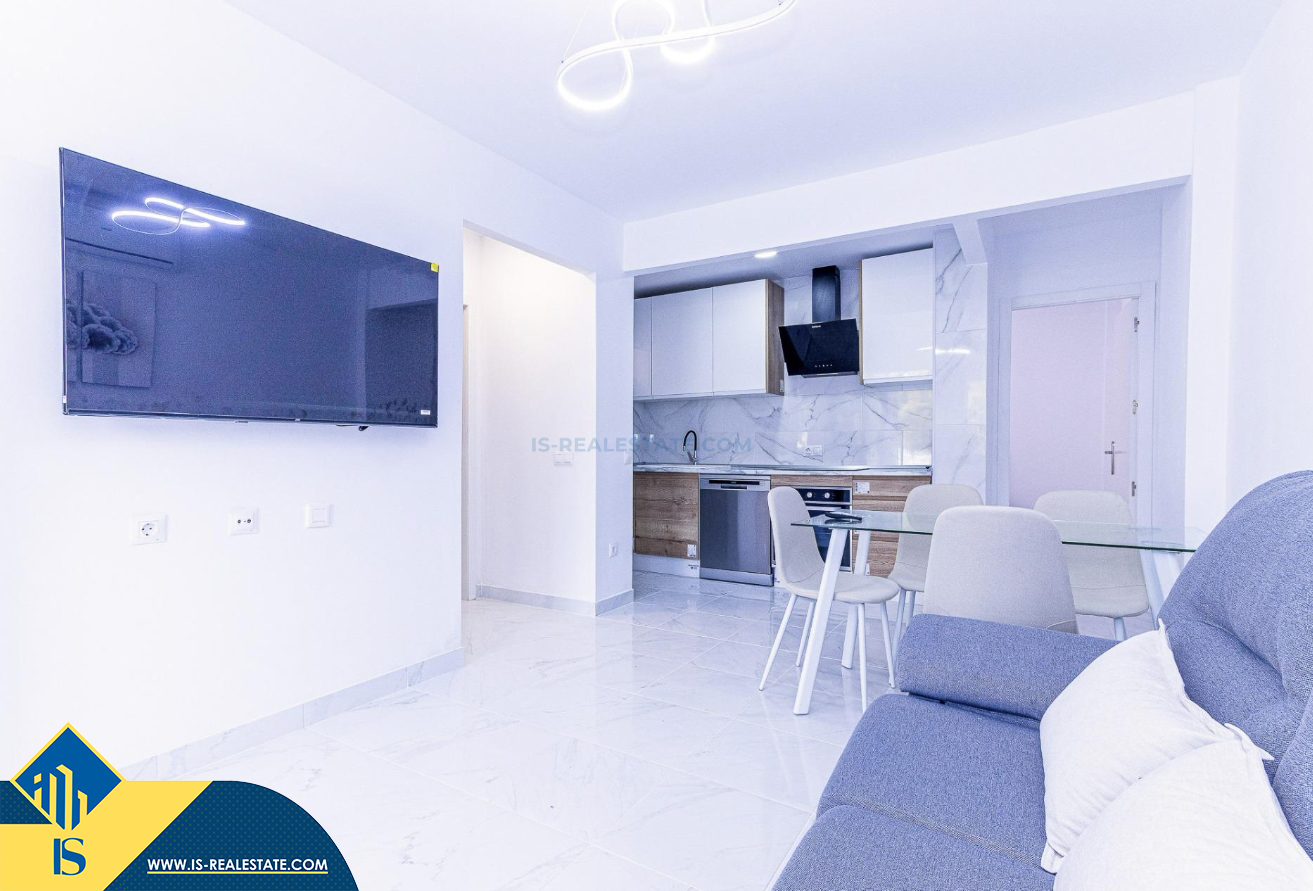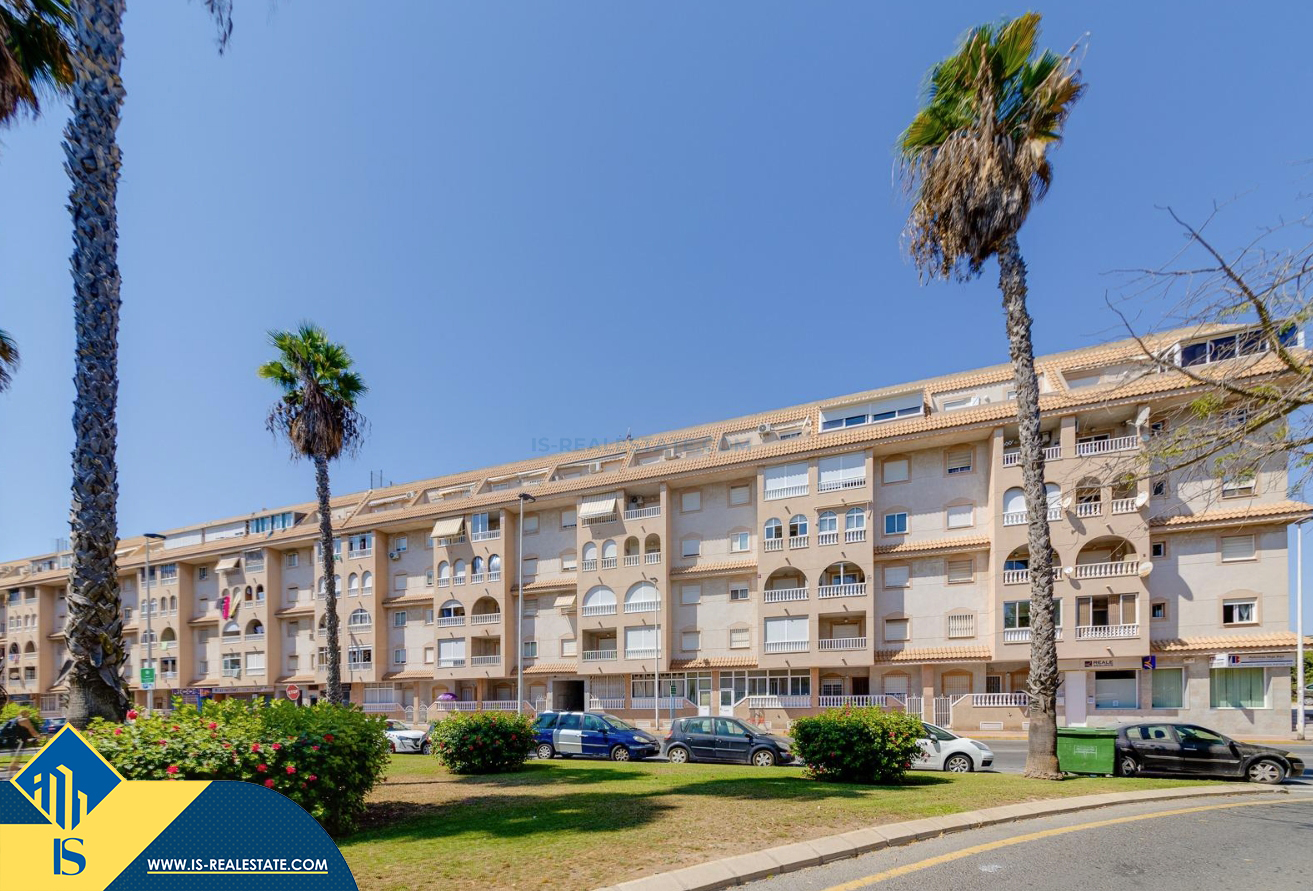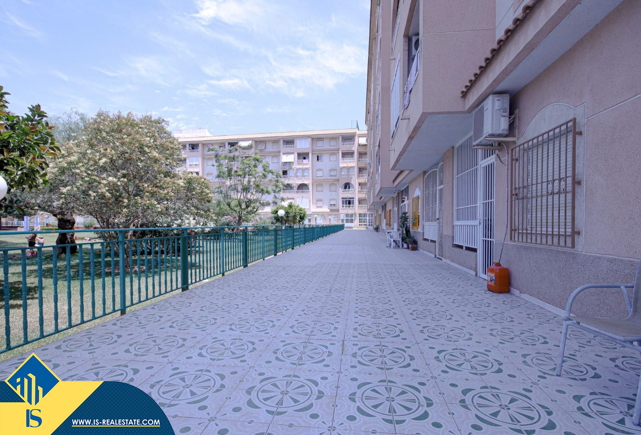 3-jų kambarių renovuotas apartamentas su bendru baseinu, Ispanijoje, Alicante provincijoje, Torrevieja mieste, bendras plotas 52 m², 800 metrų iki jūros, 45 kilometrai iki Alicante oro uosto. Turtui priklauso bendras baseinas, terasa, liftas. Netoli turto yra parduotuvės, restoranai, vaistinės, autobusų stotelės, degalinės, žalios zonos, kavinės