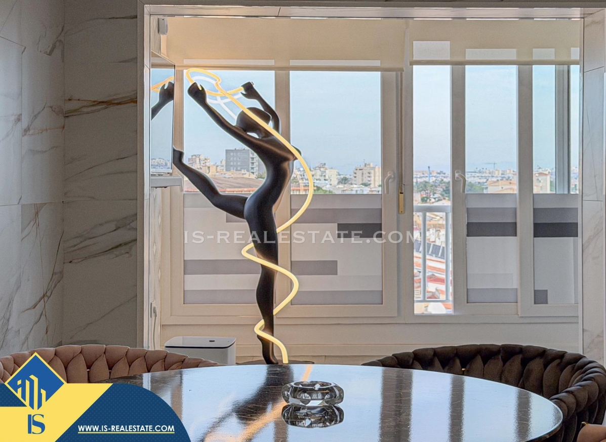 2-jų kambarių renovuotas penthouse apartamentas su terasa, Ispanijoje, Alicante provincijoje, Torrevieja mieste, Playa del Cura rajone, bendras plotas 45 m², 350 metrų iki jūros, 45 kilometrai iki Alicante oro uosto. Turtui priklauso terasa, liftas. Netoli turto yra parduotuvės, restoranai, autobusų stotelės, degalinės, žalios zonos, kavinės, vaistinės