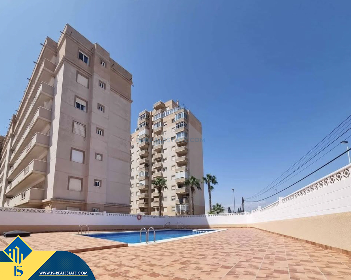 3-jų kambarių apartamentas su bendru baseinu, Ispanijoje, Alicante provincijoje, Torrevieja mieste, bendras plotas 65 m², 2 kilometrai iki jūros, 45 kilometrai iki Alicante oro uosto. Turtui priklauso bendras baseinas, terasa, soliariumas, liftas. Netoli turto yra parduotuvės, restoranai, vaistinės, autobusų stotelės, degalinės, žalios zonos, kavinės