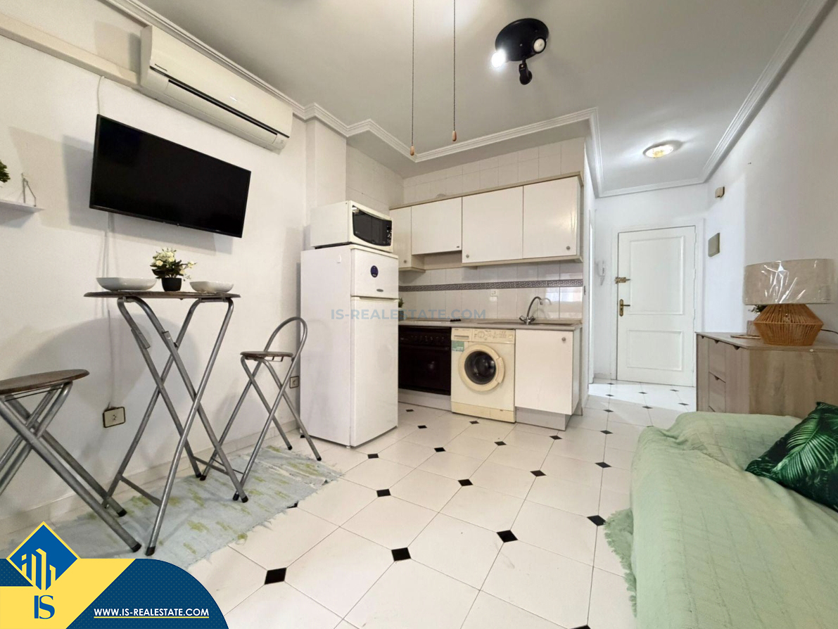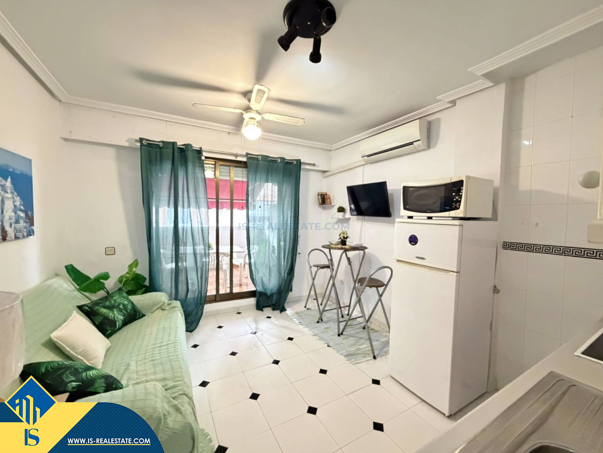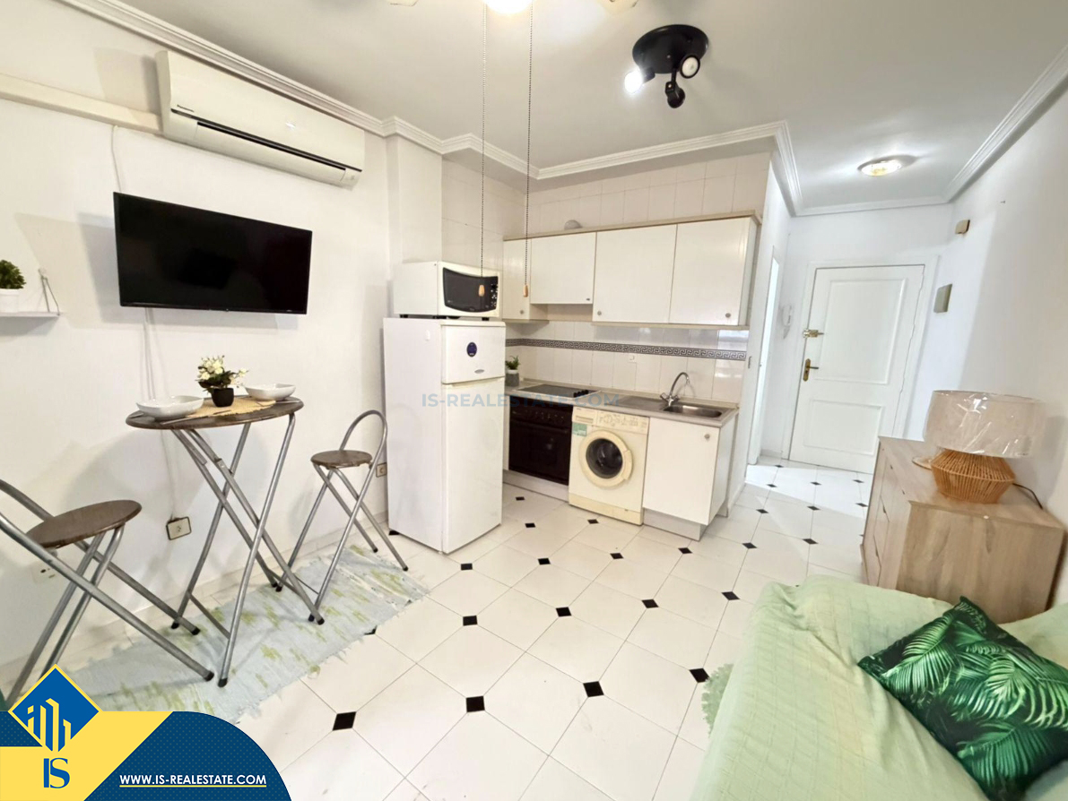Studija su terasa, Ispanijoje, Alicante provincijoje, Torrevieja mieste, bendras plotas 32 m², 400 metrų iki jūros, 45 kilometrai iki Alicante oro uosto. Turtui priklauso terasa, liftas. Netoli turto yra parduotuvės, restoranai, vaistinės, autobusų stotelės, degalinės, žalios zonos, kavinės