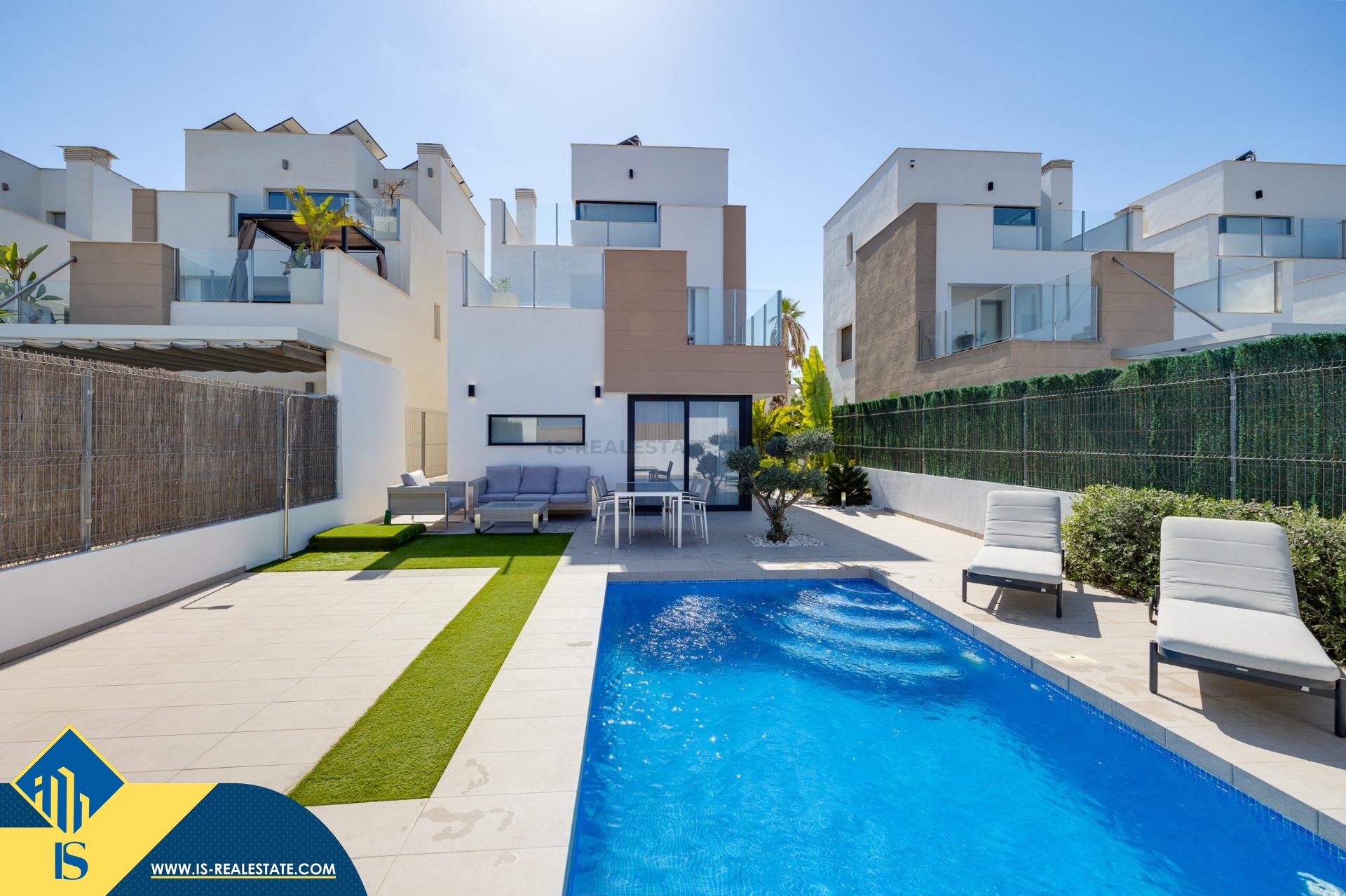 4-ių kambarių vila su privačiu baseinu Ispanijoje, Alicante provincija, Guardamar del Segura mieste, bendras plotas 178 m², 3 kilometrai iki jūros. Turtui priklauso privatus baseinas, soliariumas, kiemas. 38 kilometrai iki Alicante oro uosto. Netoli turto yra parduotuvės, restoranai, autobusų stotelės, degalinės, žalios zonos, kavinės, vaistinės
