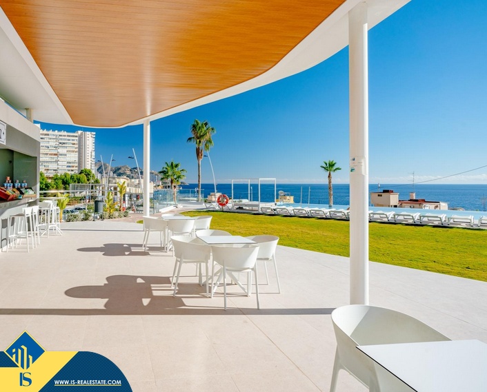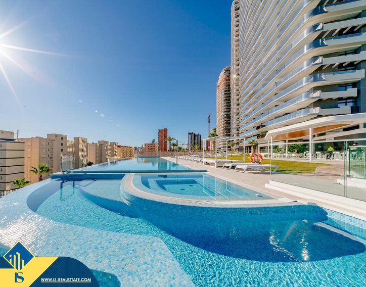 3-jų kambarių apartamentas su bendru baseinu, Ispanijoje, Alicante provincijoje, Benidorm mieste, 300 metrų iki jūros, bendras plotas 254 m², 55 kilometrai iki Alicante miesto oro uosto. Turtui priklauso terasa, bendras baseinas, vieta automobiliui. Netoli turto yra parduotuvės, restoranai, autobusų stotelės, vaikų zonos, degalinės, žalios zonos, kavinės