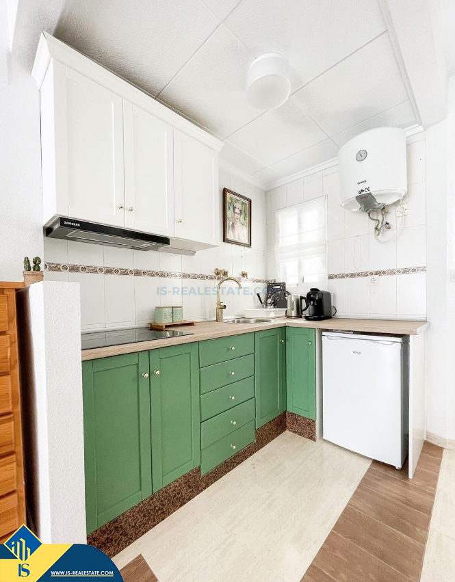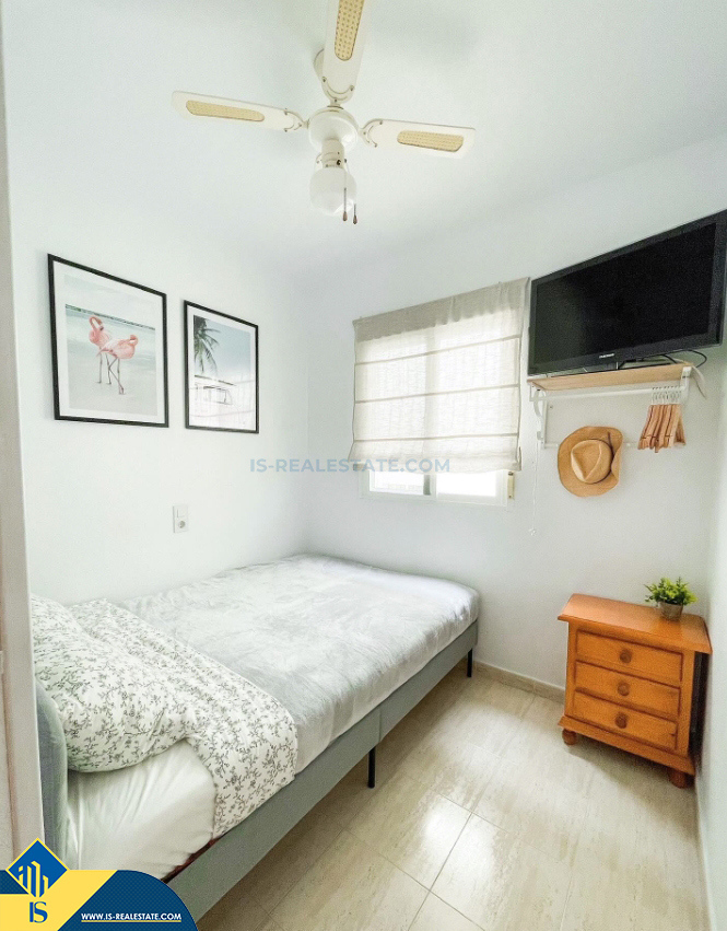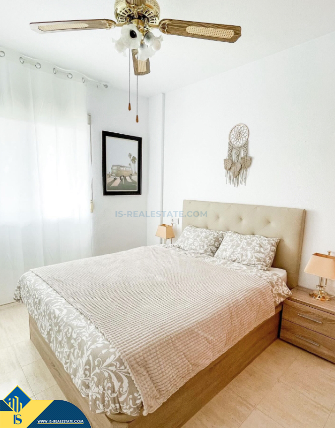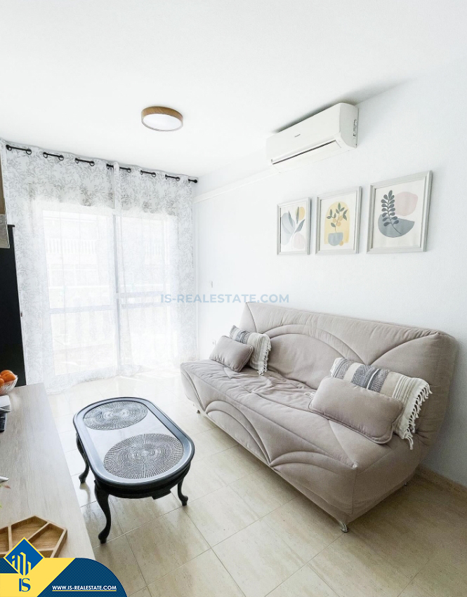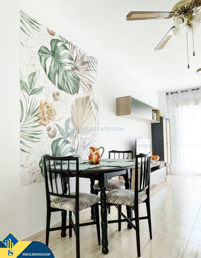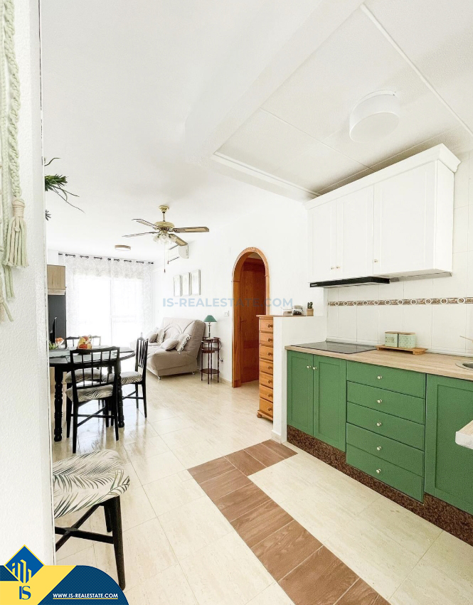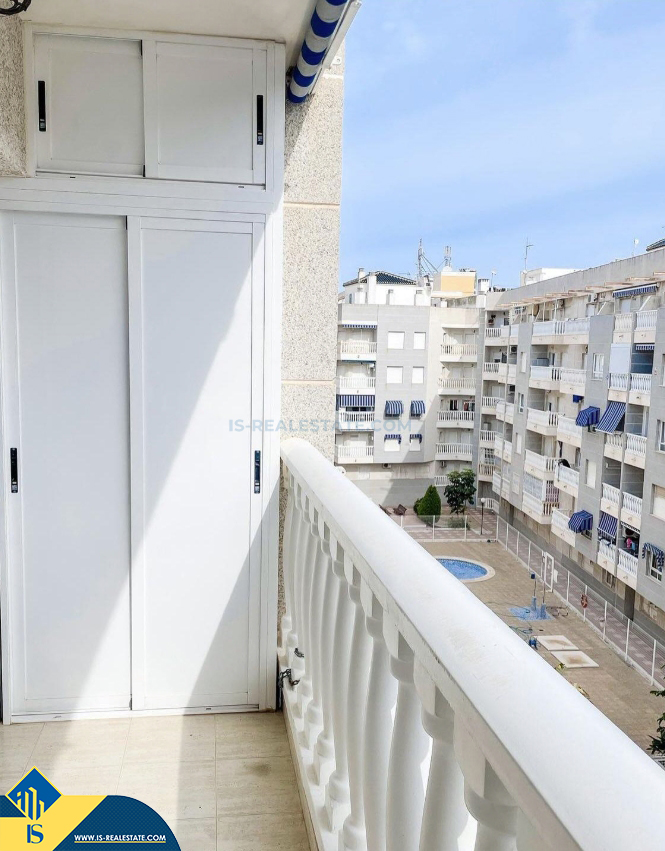 3-jų kambarių apartamentas su terasa, Ispanijoje, Alicante provincijoje, Torrevieja mieste, bendras plotas 50 m², 750 metrų iki jūros, 45 kilometrai iki Alicante oro uosto. Turtui priklauso terasa, liftas, garažas. Netoli turto yra parduotuvės, restoranai, vaistinės, autobusų stotelės, degalinės, žalios zonos, kavinės