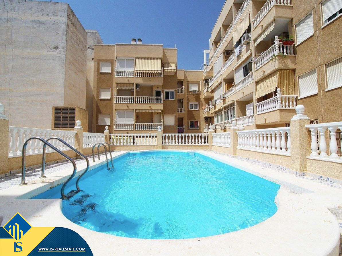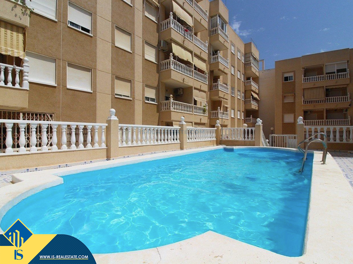 3-jų kambarių apartamentas su bendru baseinu, Ispanijoje, Alicante provincijoje, Torrevieja mieste, Playa del Cura rajone, bendras plotas 56 m², 500 metrų iki jūros, 45 kilometrai iki Alicante oro uosto. Turtui priklauso bendras baseinas, terasa, liftas. Netoli turto yra parduotuvės, restoranai, vaistinės, autobusų stotelės, degalinės, žalios zonos, kavinės, Habaneras alėja