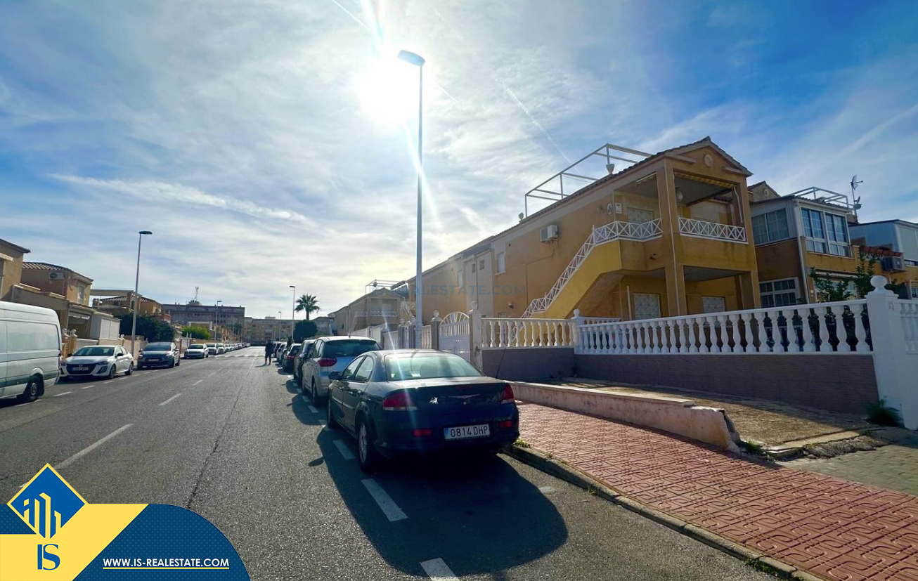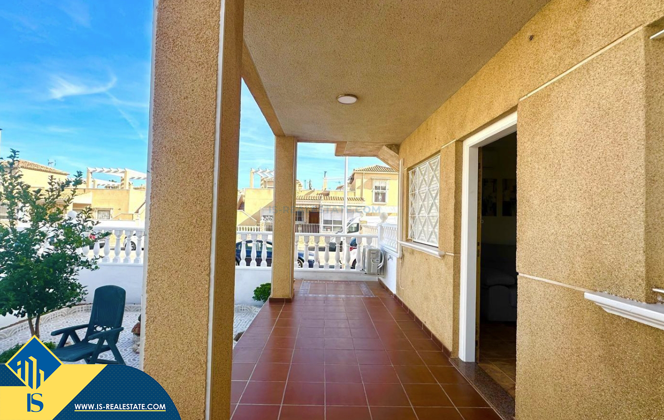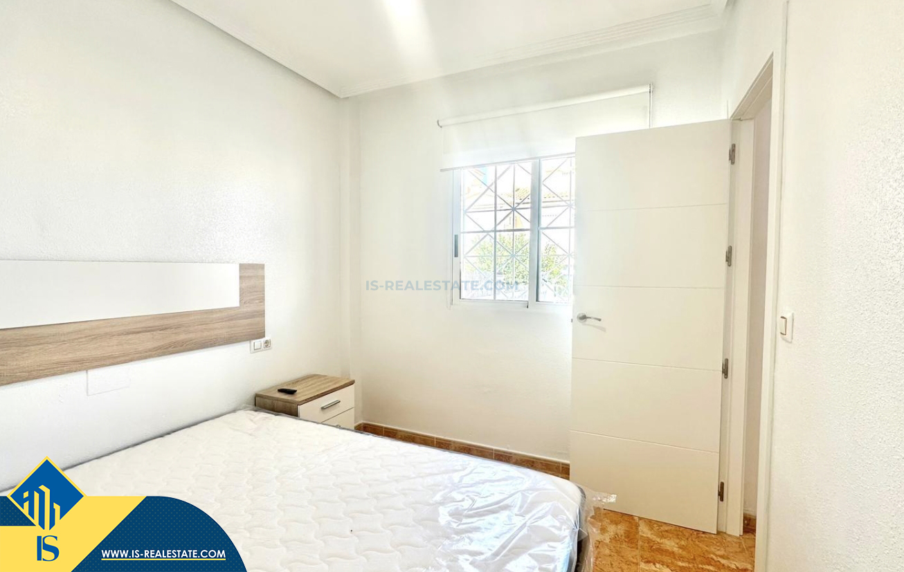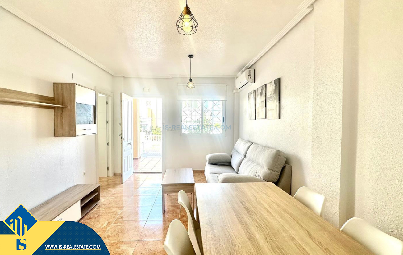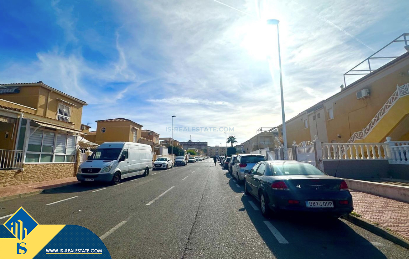 3-jų kambarių renovuotas bungalas su terasa, Ispanijoje, Alicante provincijoje, Torrevieja mieste, bendras plotas 90 m², 1.5 kilometro iki jūros, 45 kilometrai iki Alicante oro uosto. Turtui priklauso terasa, vieta automobiliui, privatus kiemas. Netoli turto yra parduotuvės, restoranai, autobusų stotelės, vaikų zonos, degalinės, žalios zonos, kavinės