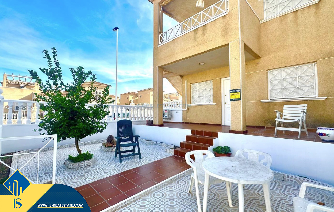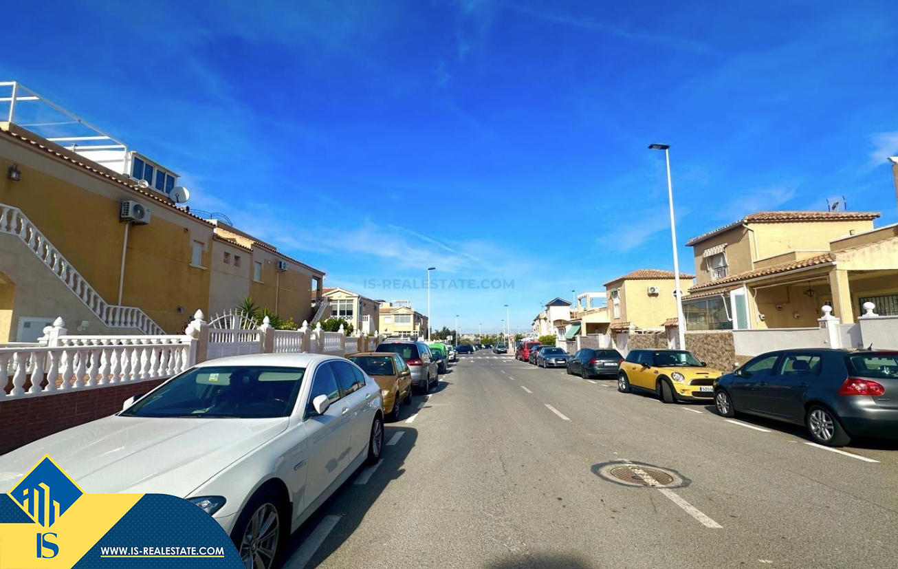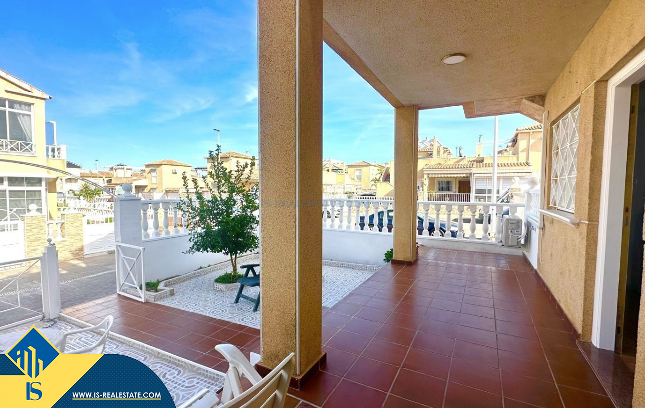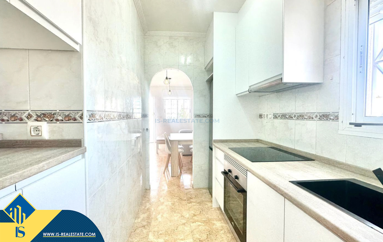 3-jų kambarių renovuotas bungalas su terasa, Ispanijoje, Alicante provincijoje, Torrevieja mieste, bendras plotas 90 m², 1.5 kilometro iki jūros, 45 kilometrai iki Alicante oro uosto. Turtui priklauso terasa, vieta automobiliui, privatus kiemas. Netoli turto yra parduotuvės, restoranai, autobusų stotelės, vaikų zonos, degalinės, žalios zonos, kavinės