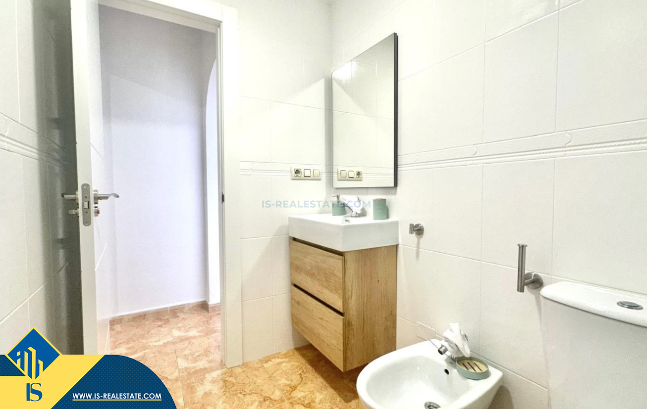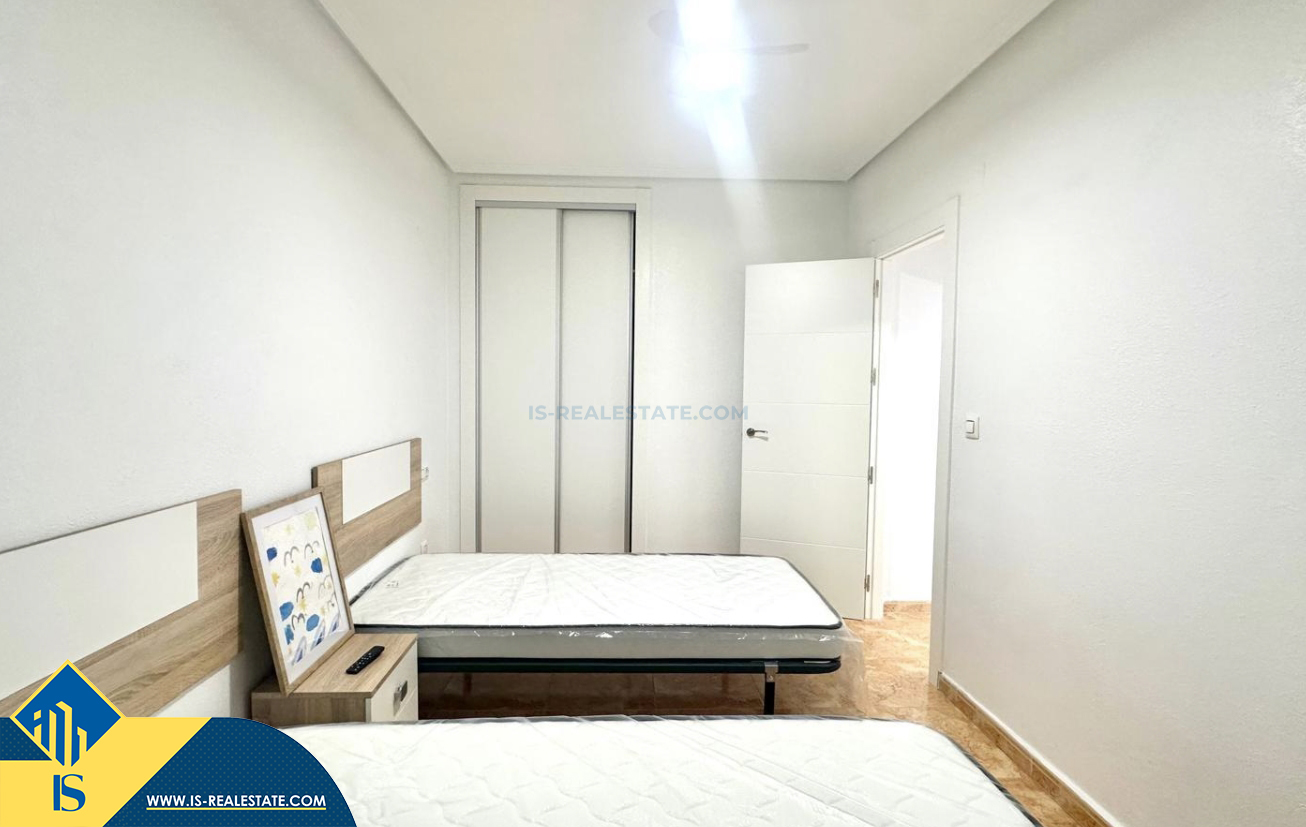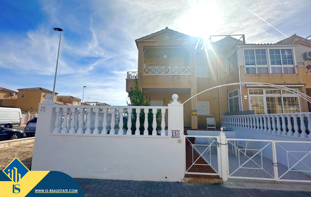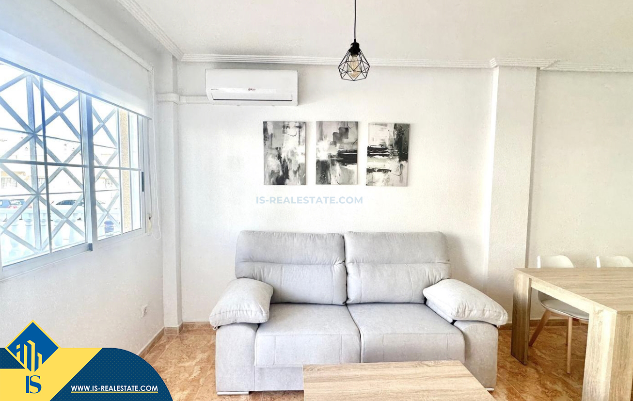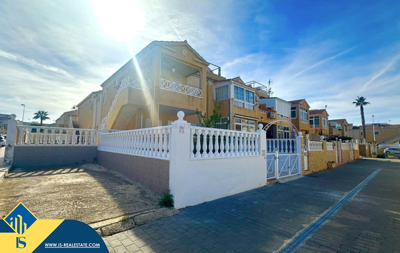 3-jų kambarių renovuotas bungalas su terasa, Ispanijoje, Alicante provincijoje, Torrevieja mieste, bendras plotas 90 m², 1.5 kilometro iki jūros, 45 kilometrai iki Alicante oro uosto. Turtui priklauso terasa, vieta automobiliui, privatus kiemas. Netoli turto yra parduotuvės, restoranai, autobusų stotelės, vaikų zonos, degalinės, žalios zonos, kavinės