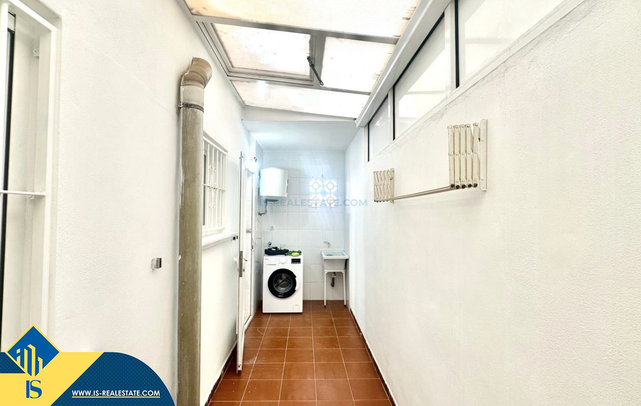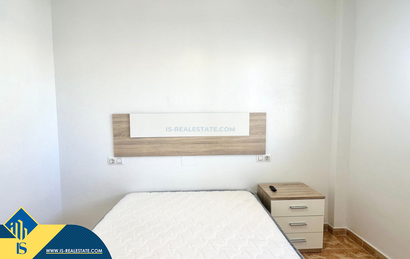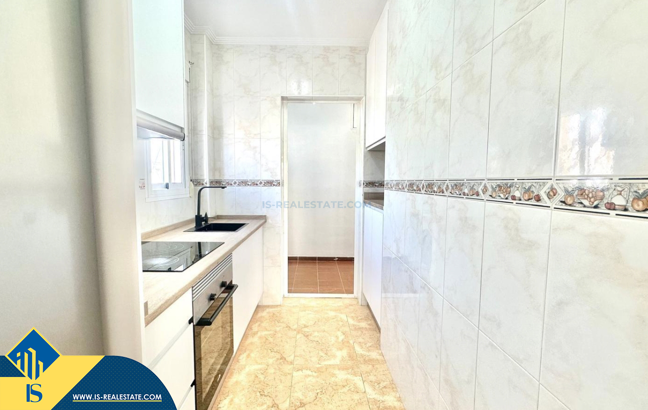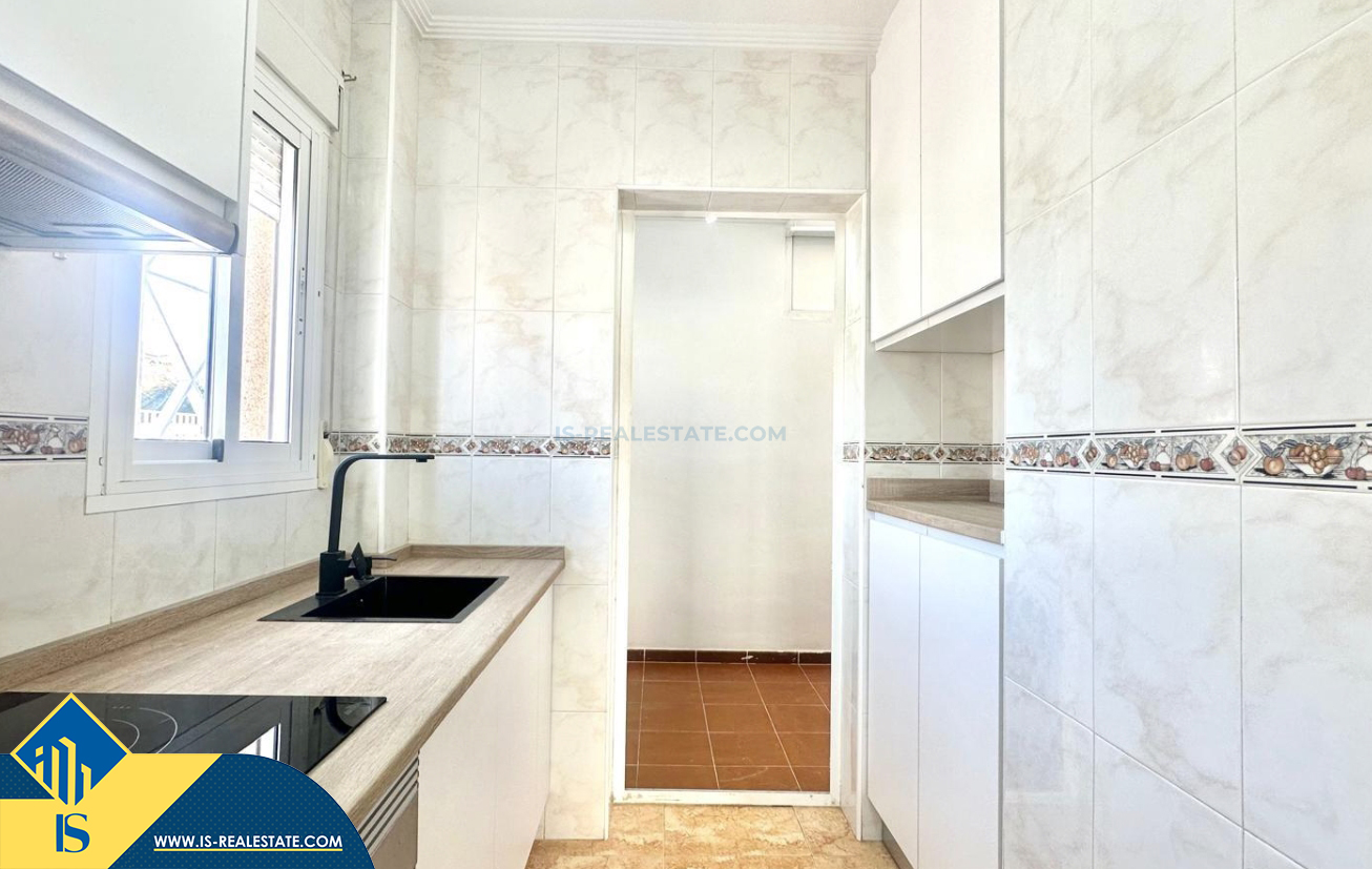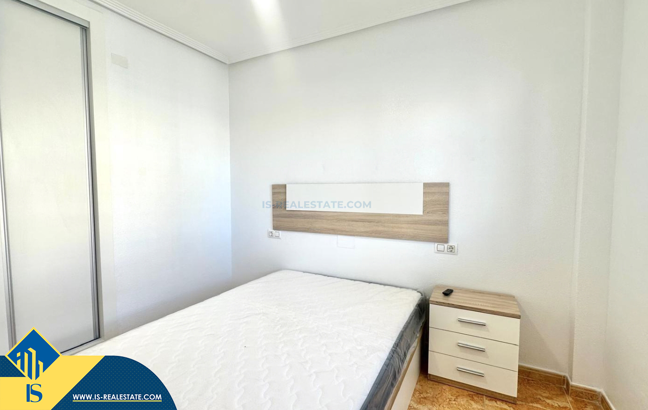 3-jų kambarių renovuotas bungalas su terasa, Ispanijoje, Alicante provincijoje, Torrevieja mieste, bendras plotas 90 m², 1.5 kilometro iki jūros, 45 kilometrai iki Alicante oro uosto. Turtui priklauso terasa, vieta automobiliui, privatus kiemas. Netoli turto yra parduotuvės, restoranai, autobusų stotelės, vaikų zonos, degalinės, žalios zonos, kavinės