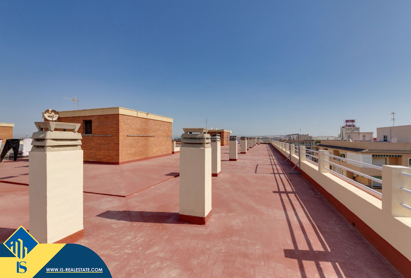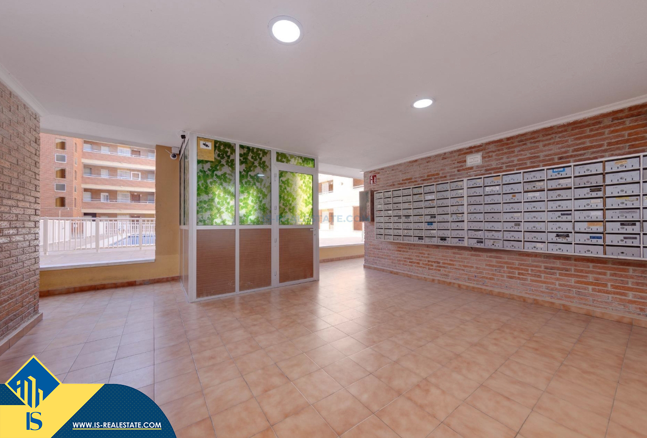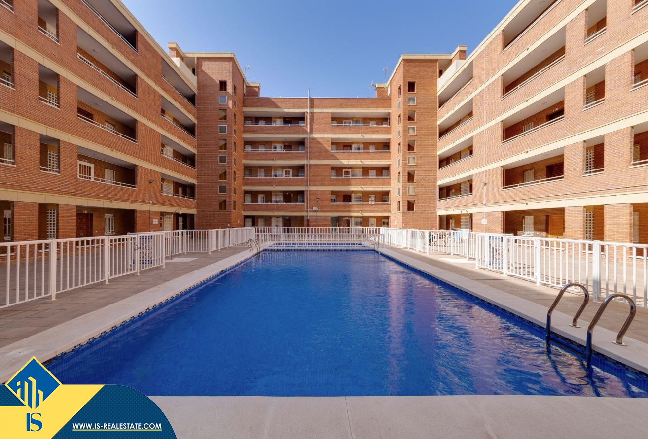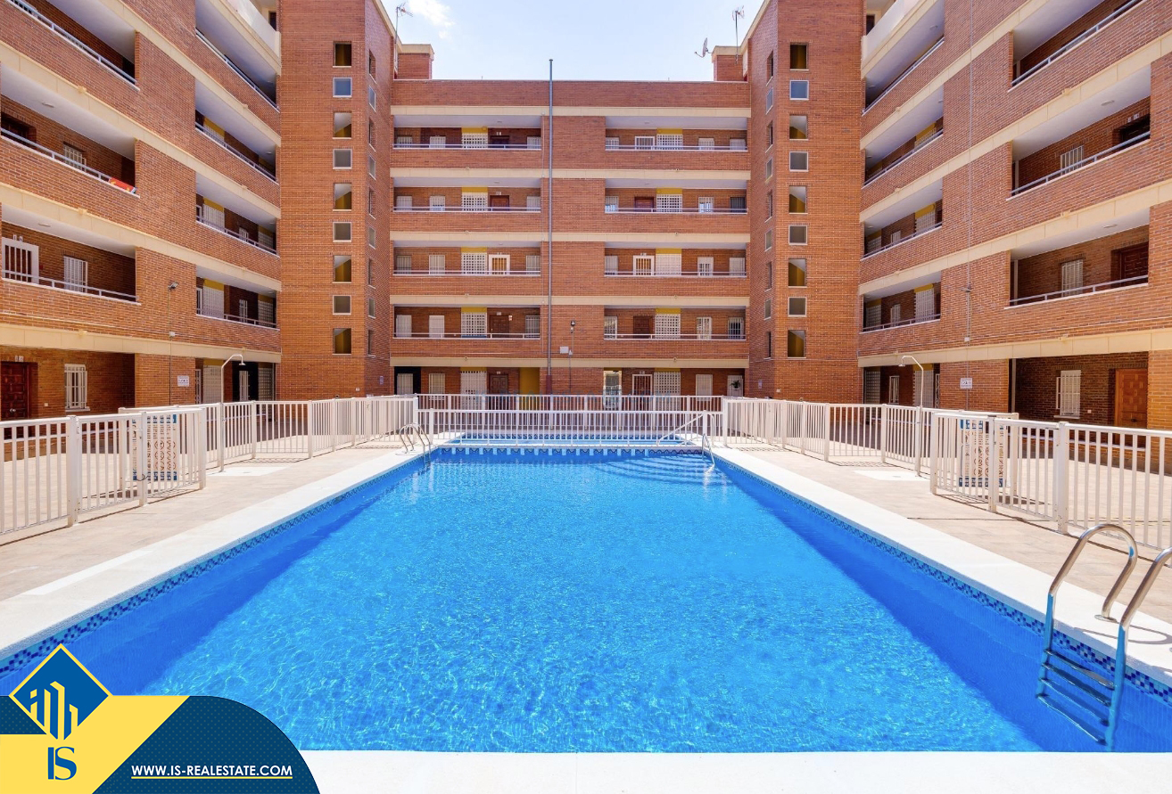 3-jų kambarių apartamentas su bendru baseinu, Ispanijoje, Alicante provincijoje, Torrevieja mieste, Playa de los Náufragos rajone, bendras plotas 79 m², 300 metrų iki jūros, 45 kilometrai iki Alicante oro uosto. Turtui priklauso bendras baseinas, terasa, liftas. Netoli turto yra parduotuvės, restoranai, vaistinės, autobusų stotelės, degalinės, žalios zonos, kavinės