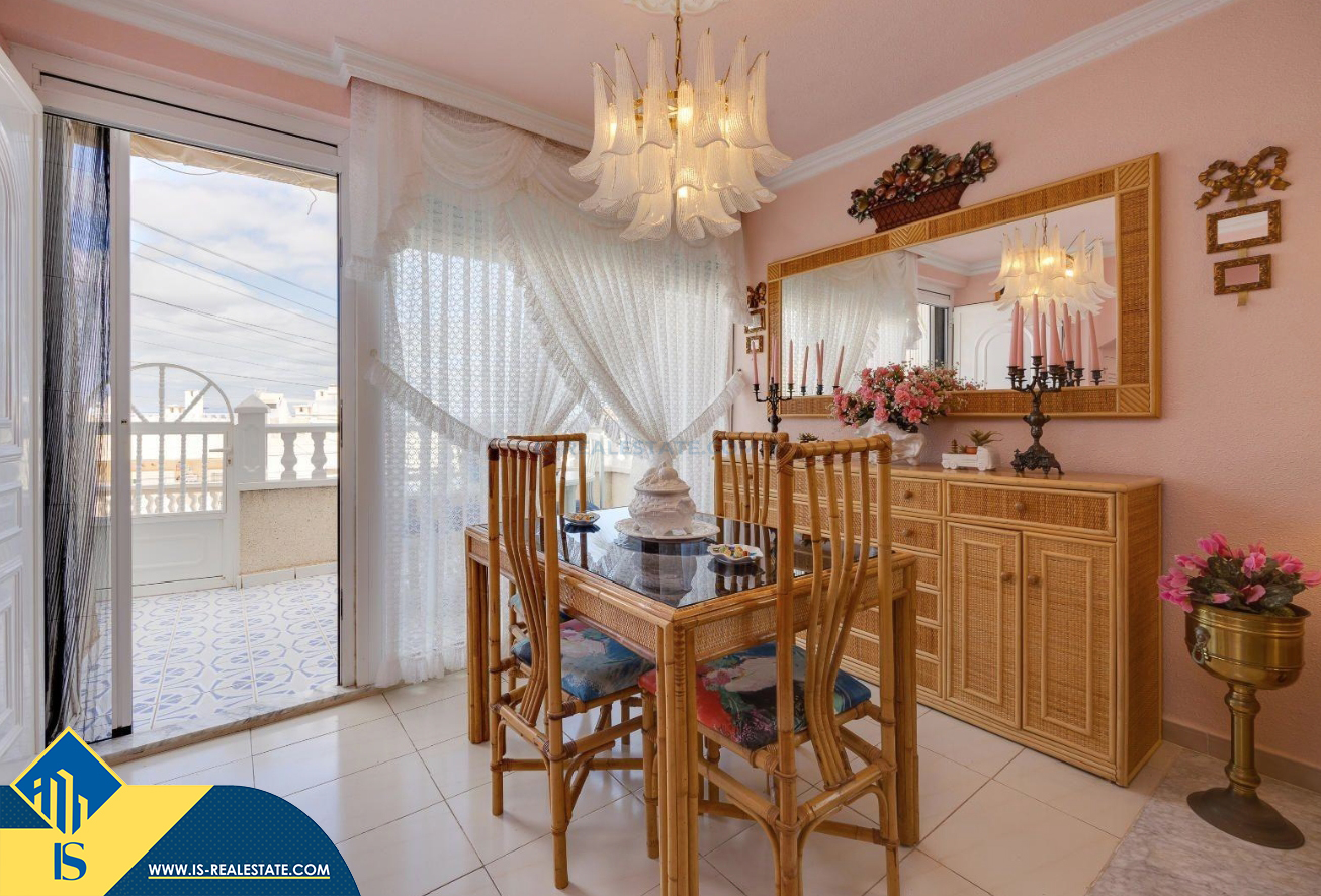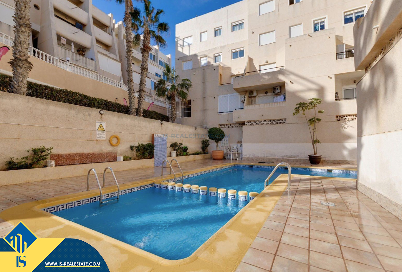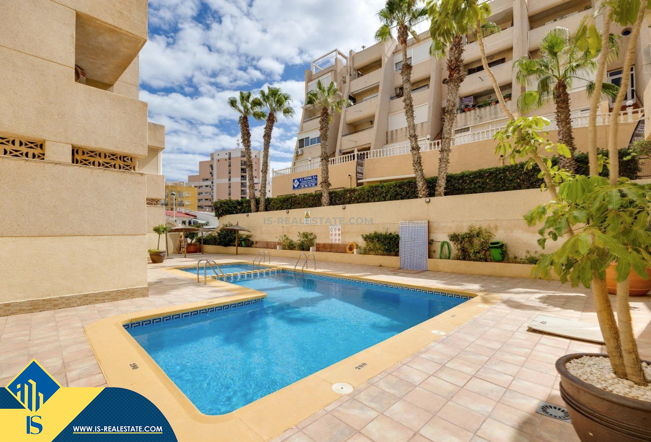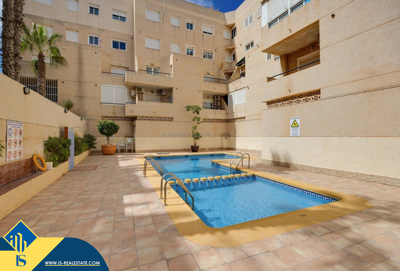 2-jų kambarių apartamentas su bendru baseinu, Ispanijoje, Alicante provincijoje, Torrevieja mieste, bendras plotas 58 m², 600 metrų iki jūros, 45 kilometrai iki Alicante oro uosto. Turtui priklauso bendras baseinas, terasa, garažas. Netoli turto yra parduotuvės, restoranai, vaistinės, autobusų stotelės, degalinės, žalios zonos, kavinės