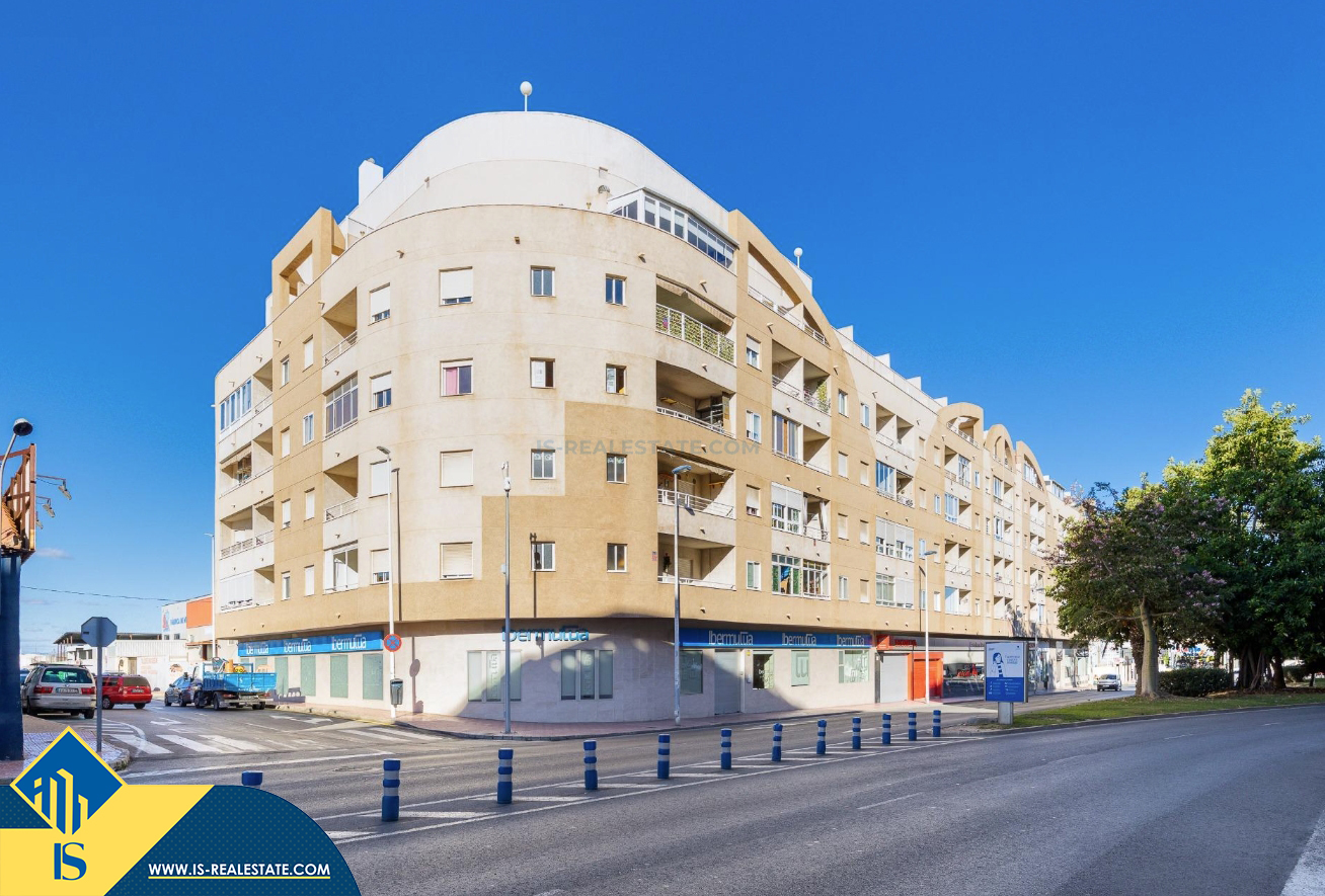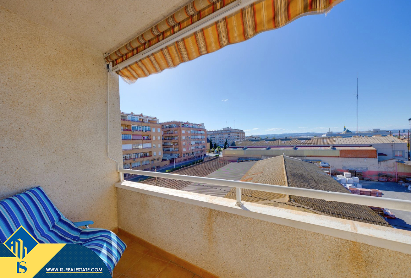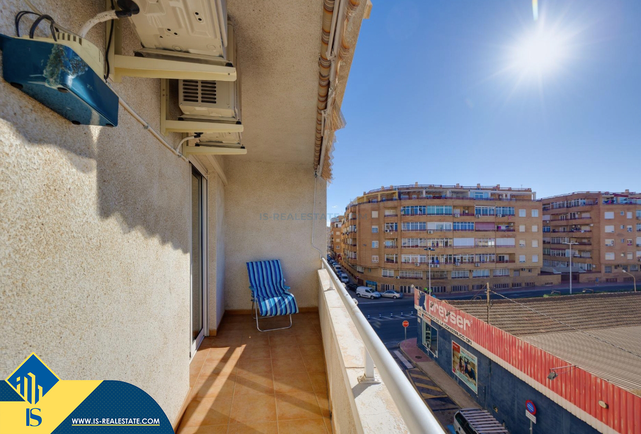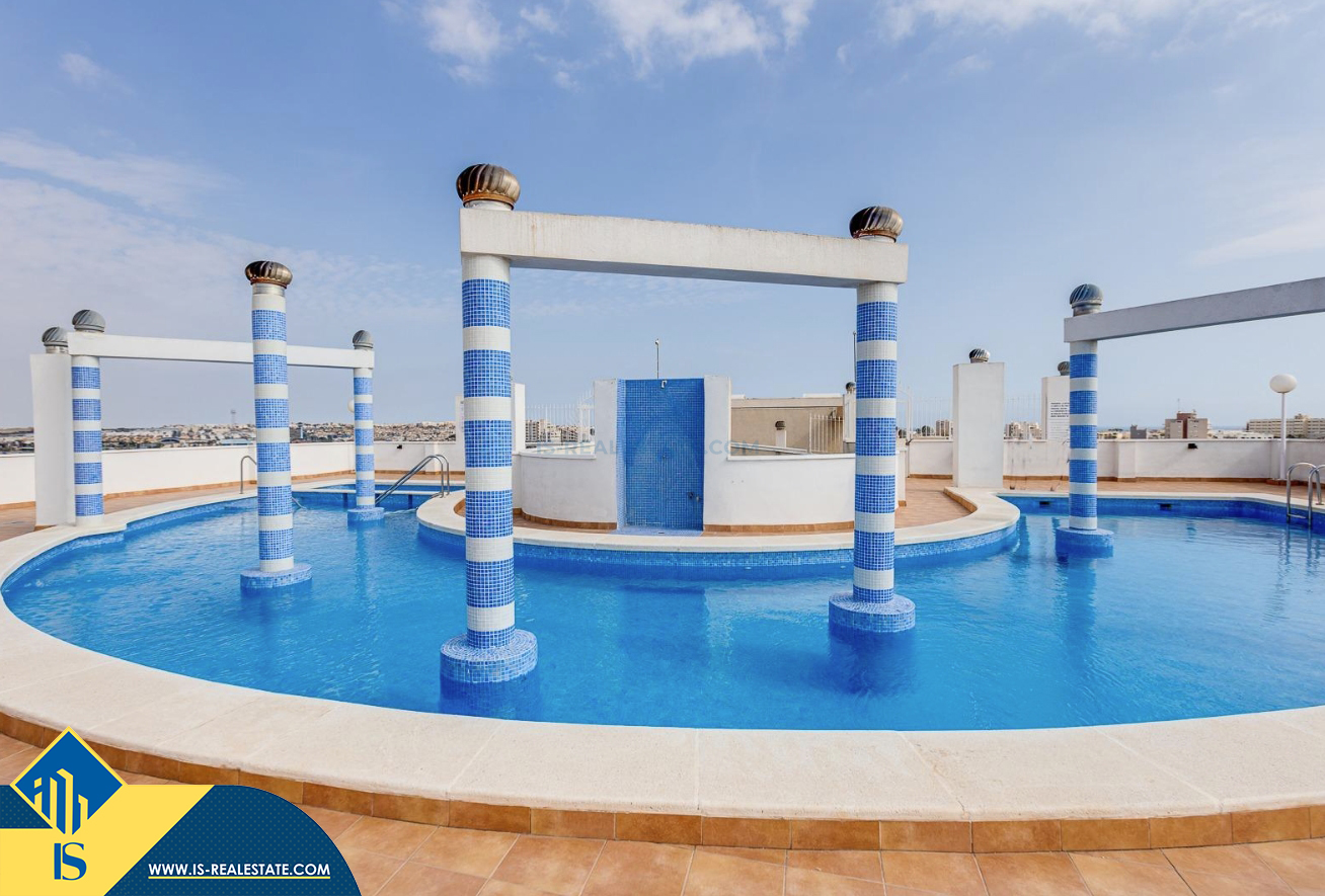 3-jų kambarių apartamentas su bendru baseinu, Ispanijoje, Alicante provincijoje, Torrevieja mieste, bendras plotas 84 m², 1.5 kilometro iki jūros, 45 kilometrai iki Alicante oro uosto. Turtui priklauso bendras baseinas, terasa, liftas, garažas. Netoli turto yra parduotuvės, restoranai, vaistinės, autobusų stotelės, degalinės, žalios zonos, kavinės