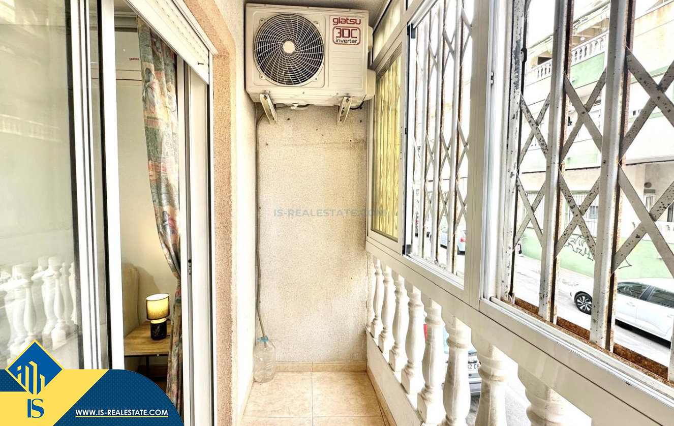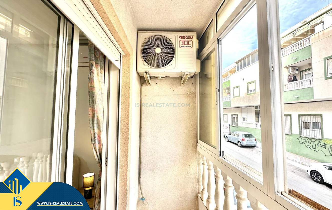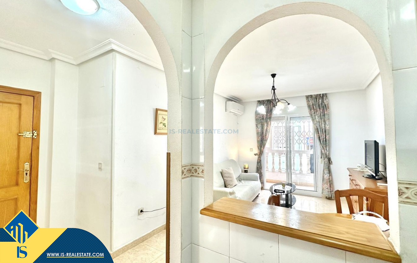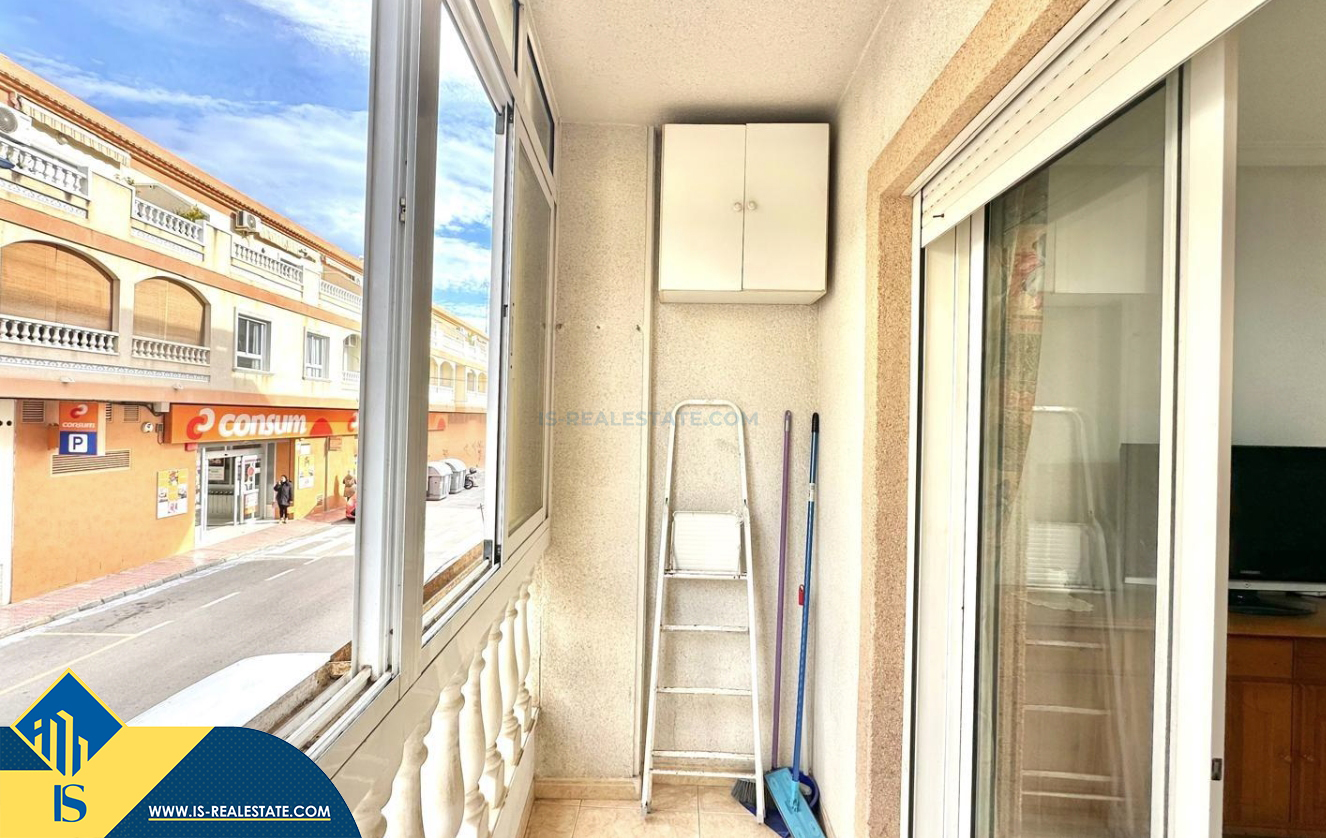 2-jų kambarių apartamentas su terasa, Ispanijoje, Alicante provincijoje, Torrevieja mieste, bendras plotas 48 m², 450 metrų iki jūros, 45 kilometrai iki Alicante oro uosto. Turtui priklauso terasa, liftas. Netoli turto yra parduotuvės, restoranai, vaistinės, autobusų stotelės, degalinės, žalios zonos, kavinės