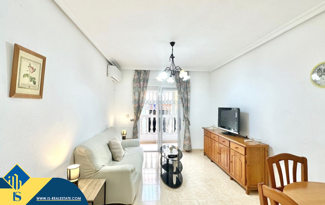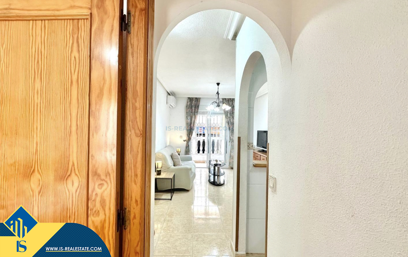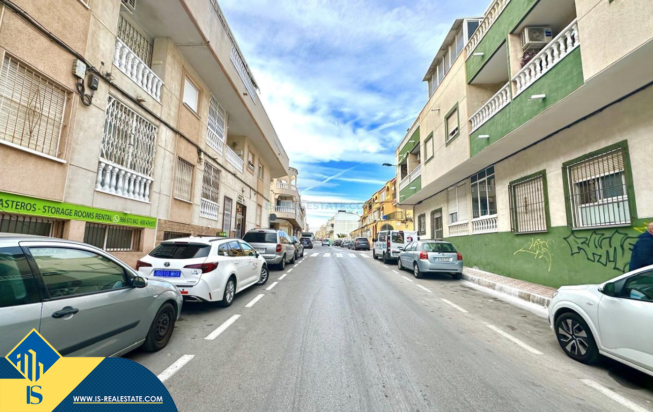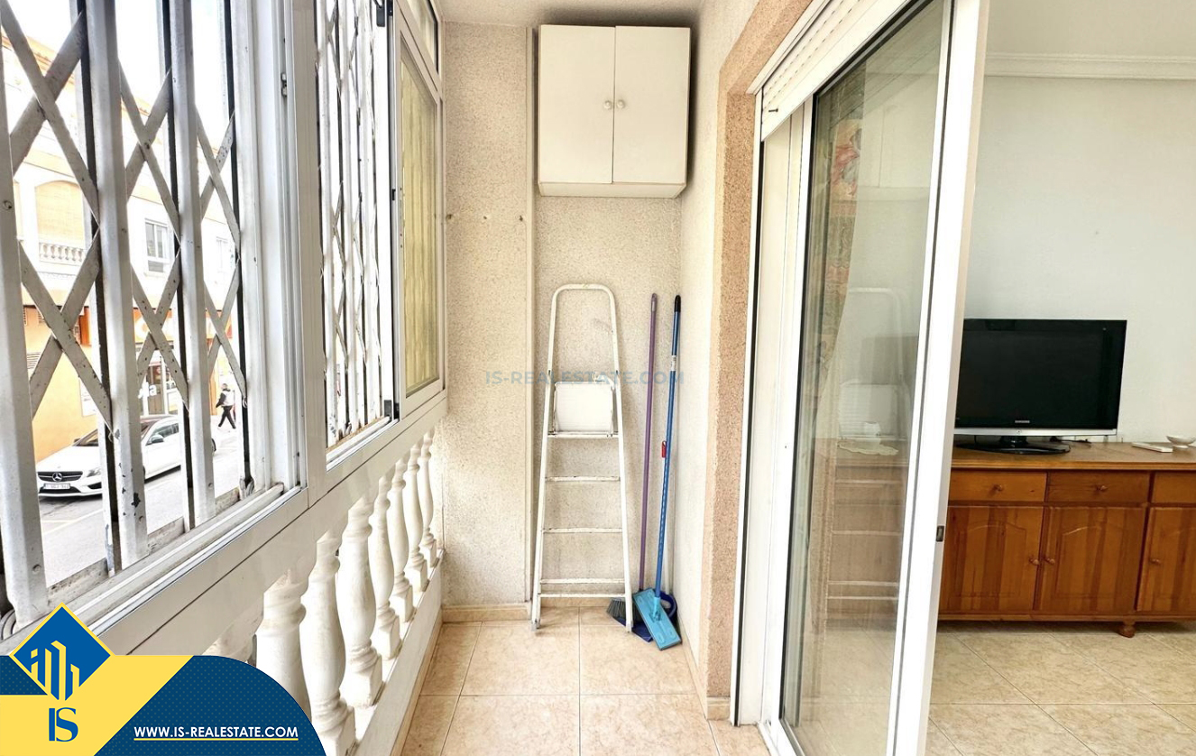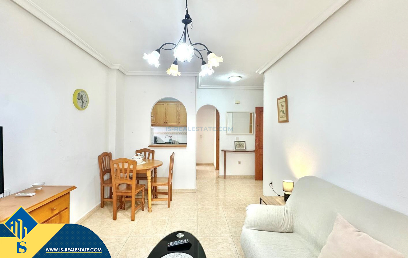 2-jų kambarių apartamentas su terasa, Ispanijoje, Alicante provincijoje, Torrevieja mieste, bendras plotas 48 m², 450 metrų iki jūros, 45 kilometrai iki Alicante oro uosto. Turtui priklauso terasa, liftas. Netoli turto yra parduotuvės, restoranai, vaistinės, autobusų stotelės, degalinės, žalios zonos, kavinės