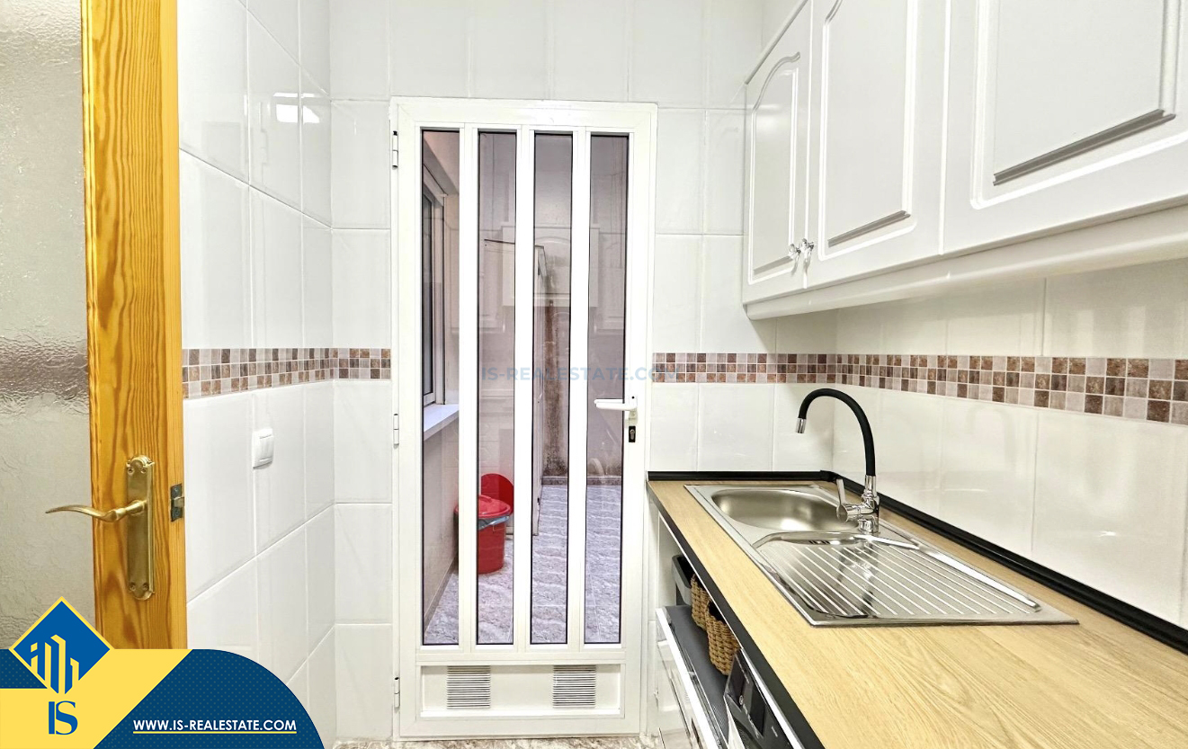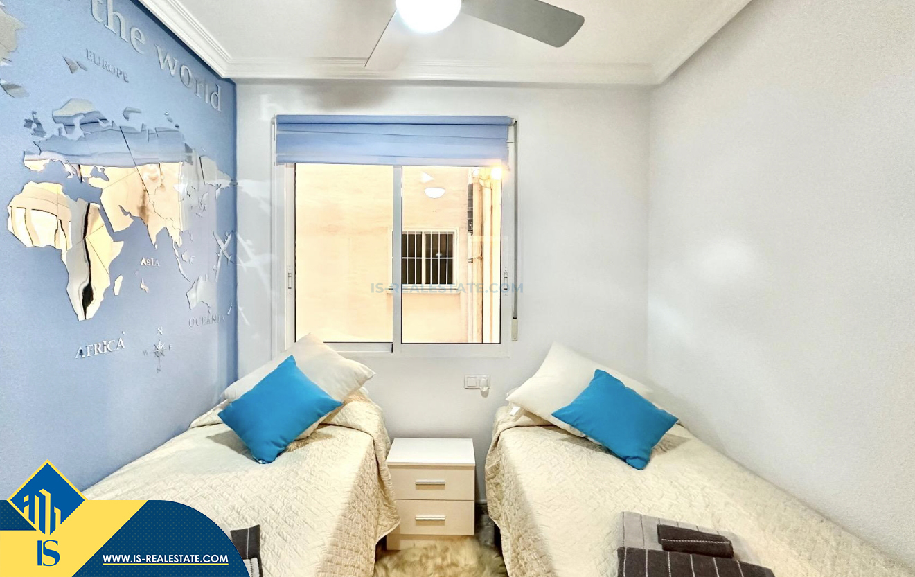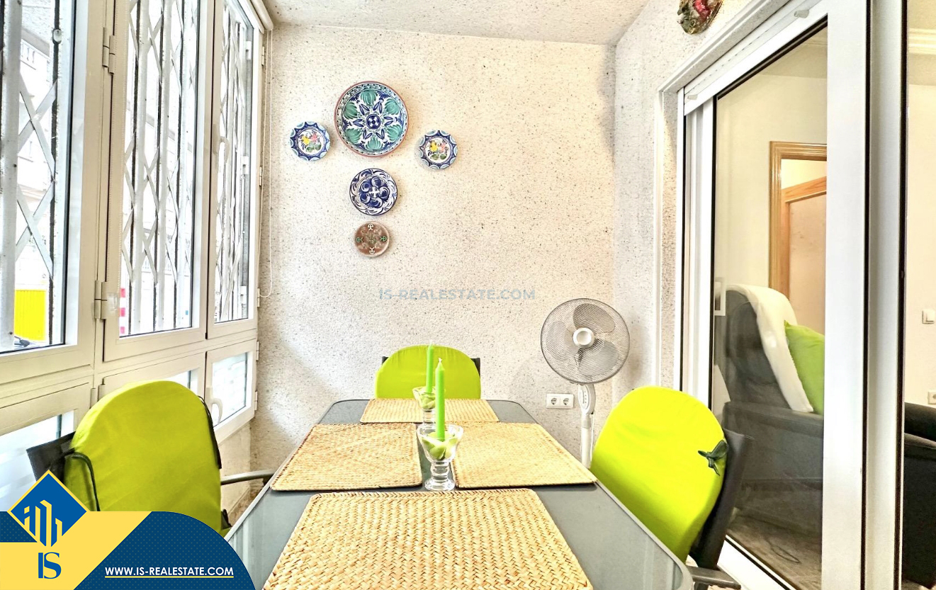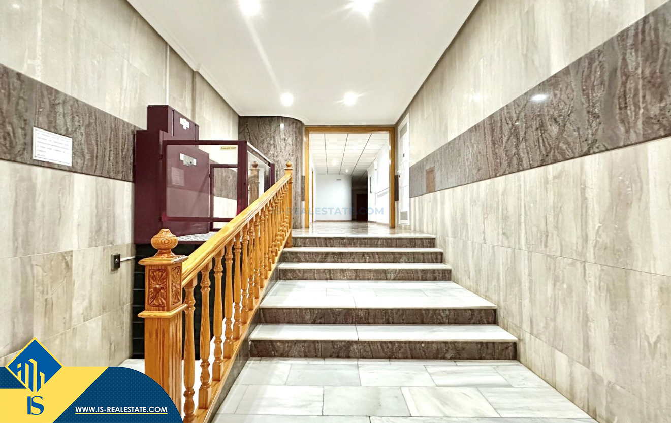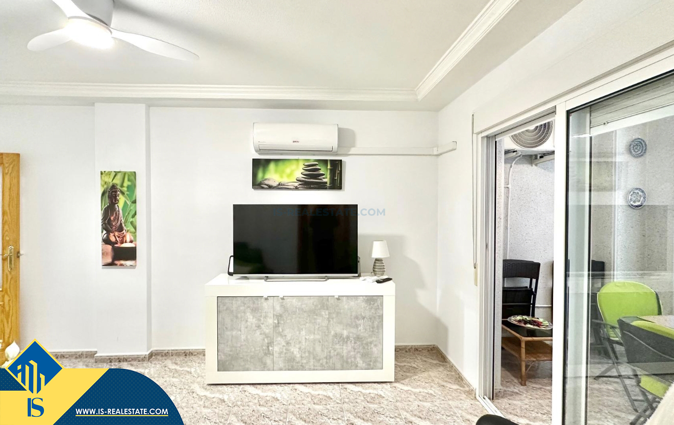 3-jų kambarių apartamentas su terasa, Ispanijoje, Alicante provincijoje, Torrevieja mieste, bendras plotas 74 m², 750 metrų iki jūros, 45 kilometrai iki Alicante oro uosto. Turtui priklauso terasa, liftas, kiemelis. Netoli turto yra parduotuvės, restoranai, vaistinės, autobusų stotelės, degalinės, žalios zonos, kavinės
