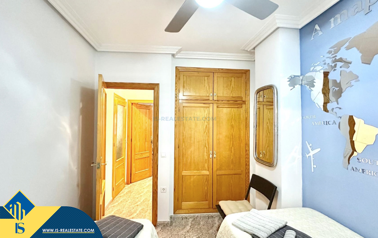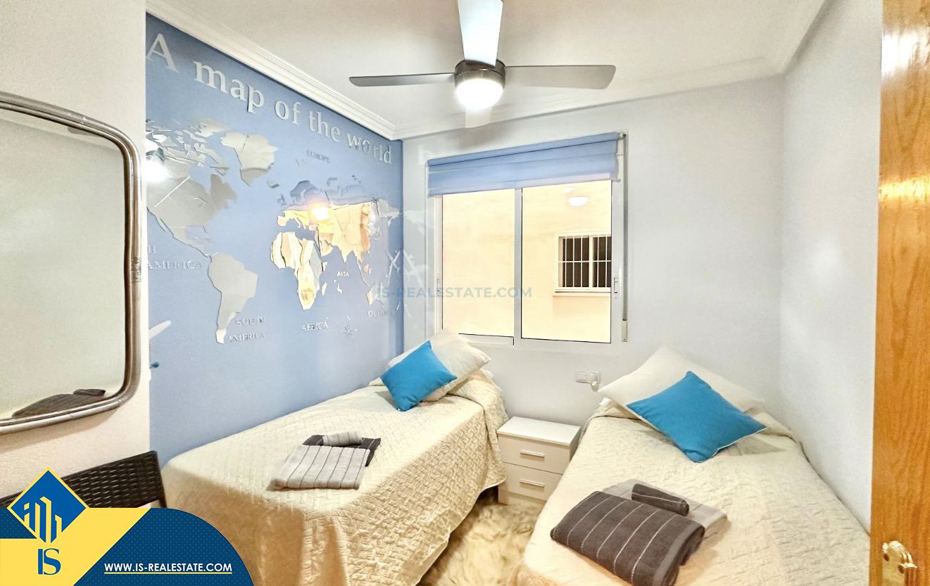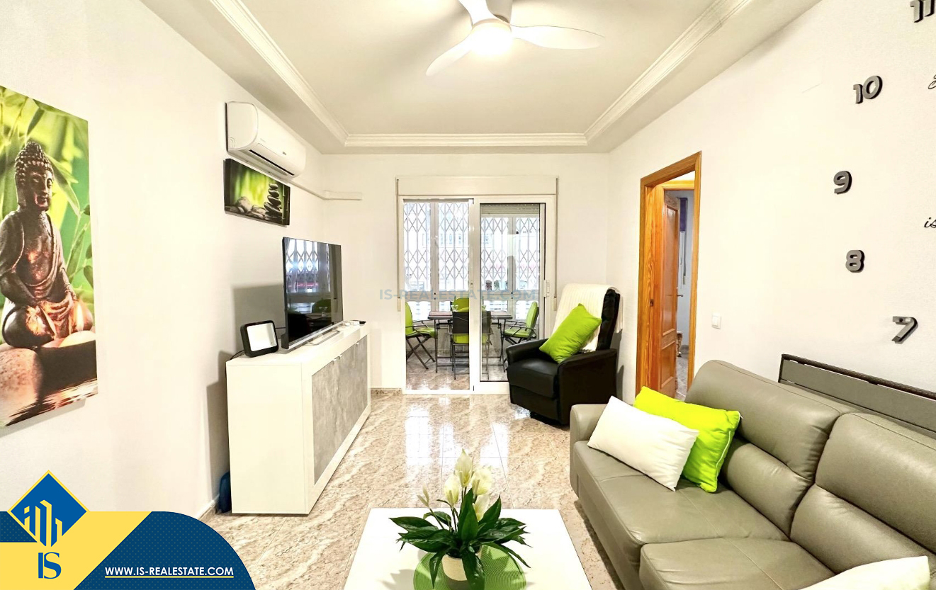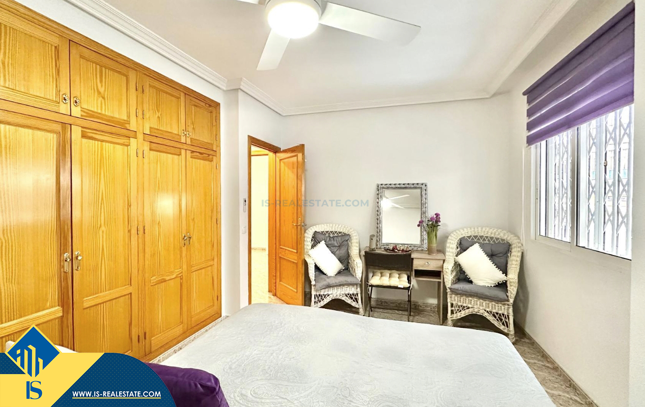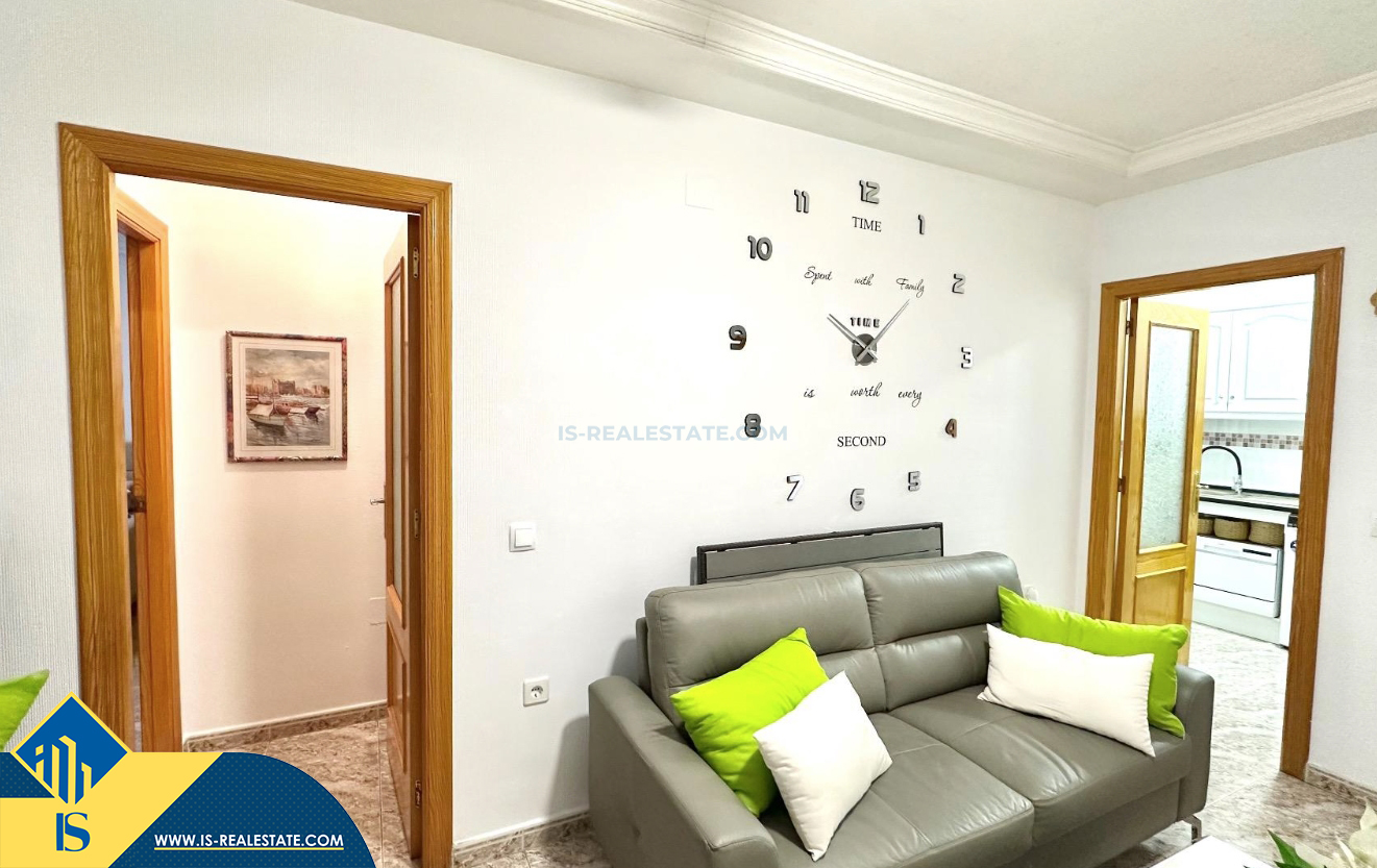 3-jų kambarių apartamentas su terasa, Ispanijoje, Alicante provincijoje, Torrevieja mieste, bendras plotas 74 m², 750 metrų iki jūros, 45 kilometrai iki Alicante oro uosto. Turtui priklauso terasa, liftas, kiemelis. Netoli turto yra parduotuvės, restoranai, vaistinės, autobusų stotelės, degalinės, žalios zonos, kavinės