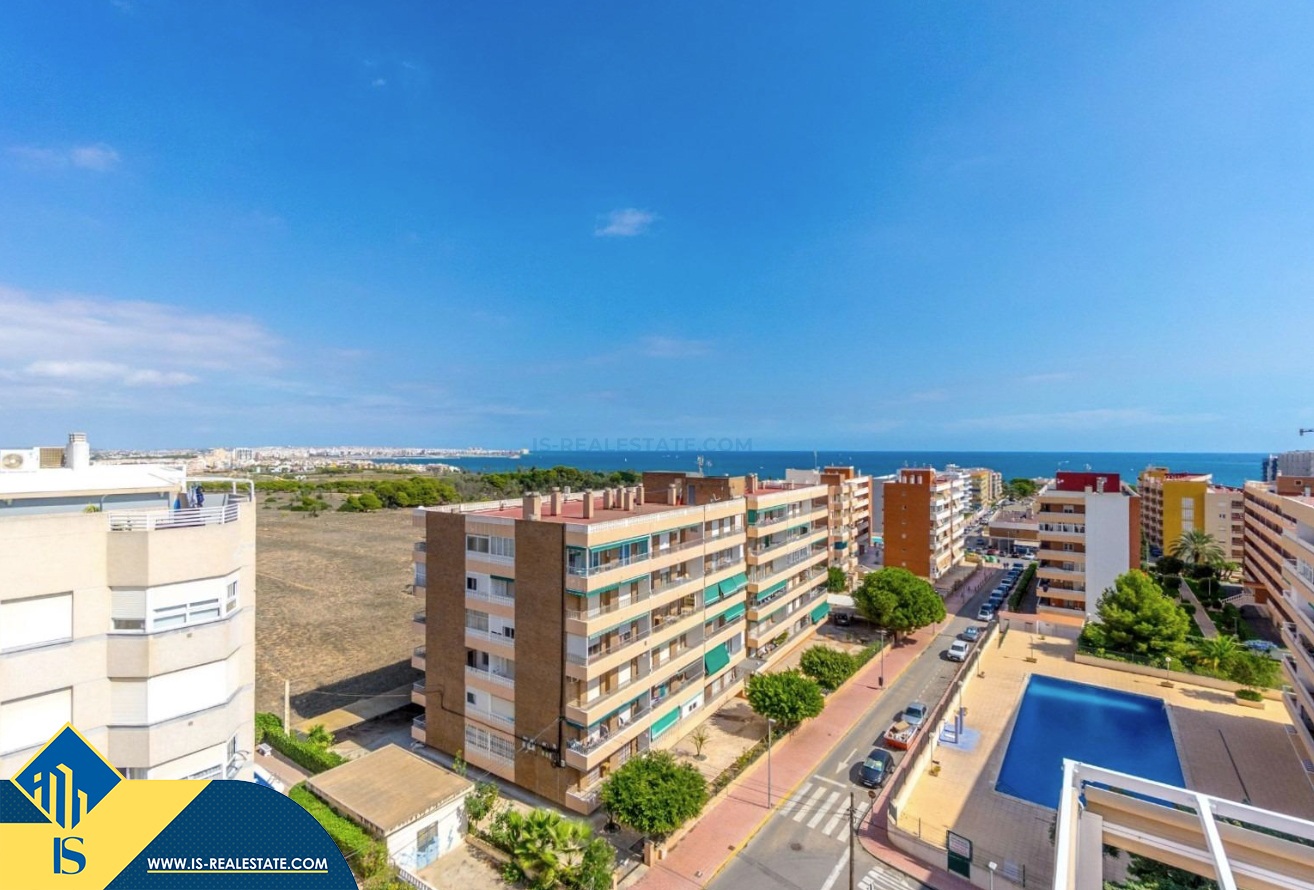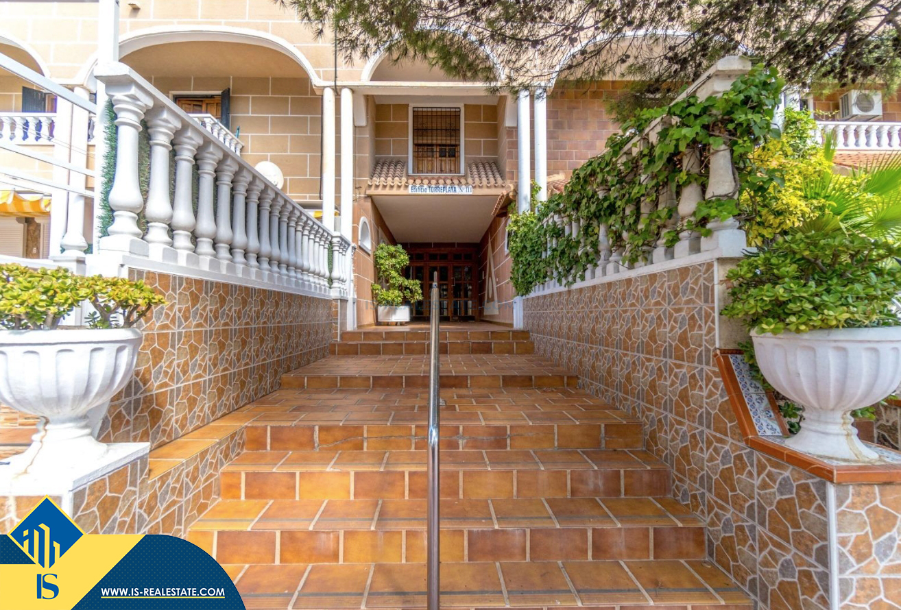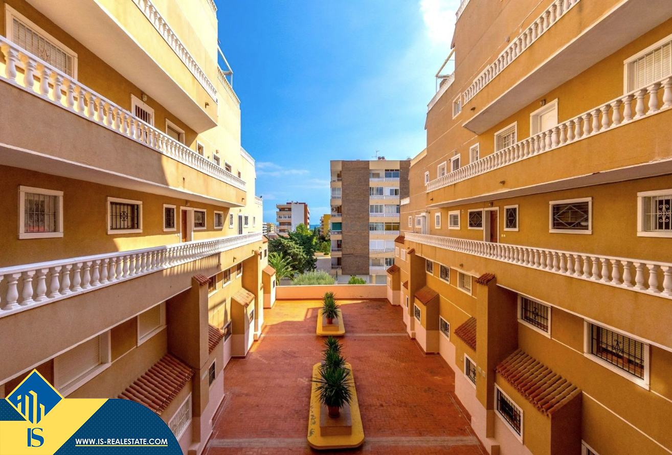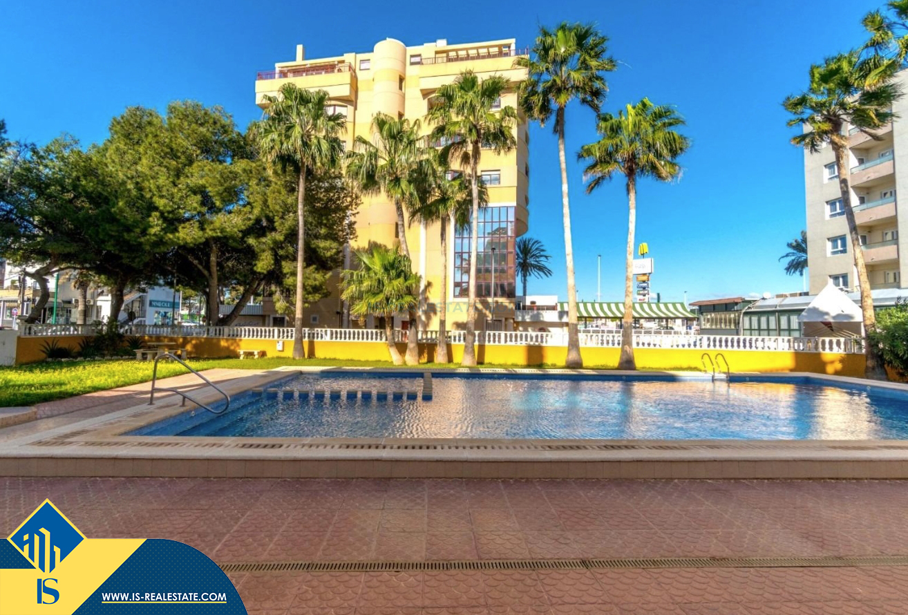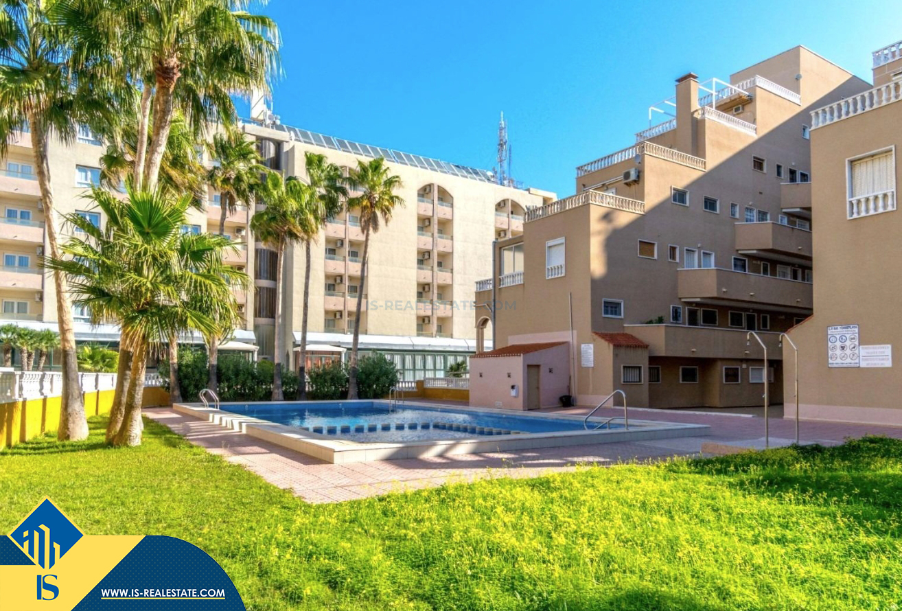 3-jų kambarių apartamentas su bendru baseinu, Ispanijoje, Alicante provincijoje, Torrevieja mieste, bendras plotas 64 m², 300 metrų iki jūros, 45 kilometrai iki Alicante oro uosto. Turtui priklauso bendras baseinas, terasa, liftas. Netoli turto yra parduotuvės, restoranai, vaistinės, autobusų stotelės, degalinės, žalios zonos, kavinės
