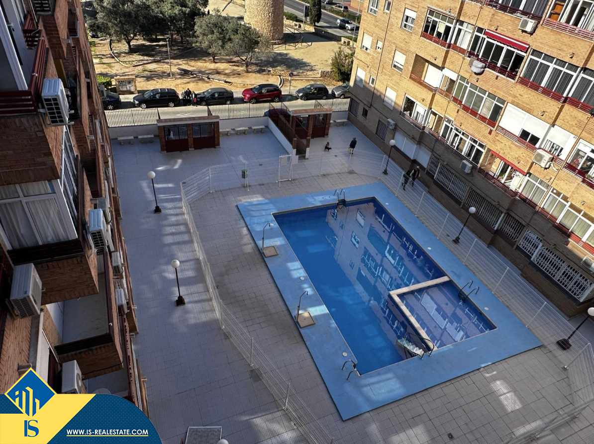 2-jų kambarių renovuotas apartamentas su bendru baseinu, Ispanijoje, Alicante provincijoje, Torrevieja mieste, bendras plotas 53 m², 800 metrų iki jūros, 45 kilometrai iki Alicante oro uosto. Turtui priklauso bendras baseinas, terasa, liftas. Netoli turto yra parduotuvės, restoranai, vaistinės, autobusų stotelės, degalinės, žalios zonos, kavinės