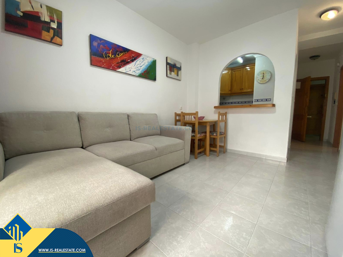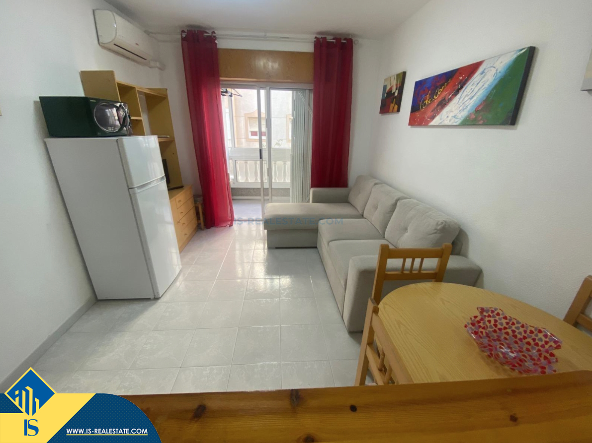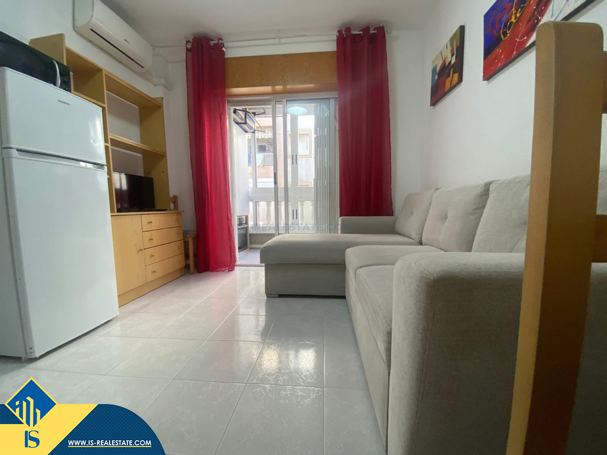Studija su terasa, Ispanijoje, Alicante provincijoje, Torrevieja mieste, Playa del Acequión rajone, bendras plotas 30 m², 150 metrų iki jūros, 45 kilometrai iki Alicante oro uosto. Turtui priklauso terasa, liftas. Netoli turto yra parduotuvės, restoranai, vaistinės, autobusų stotelės, degalinės, žalios zonos, kavinės