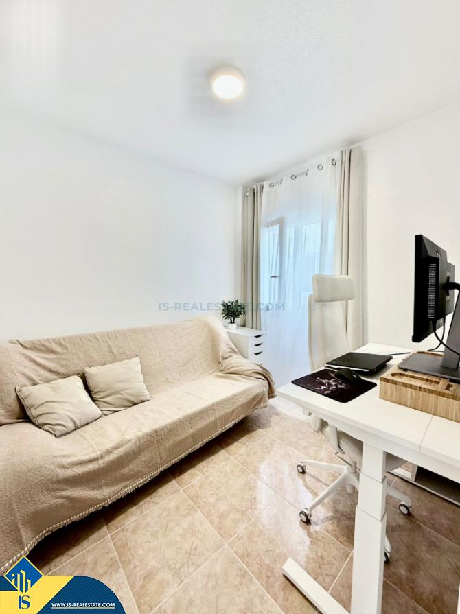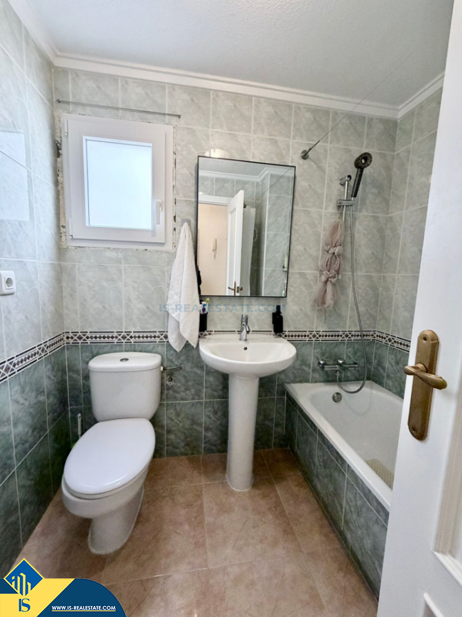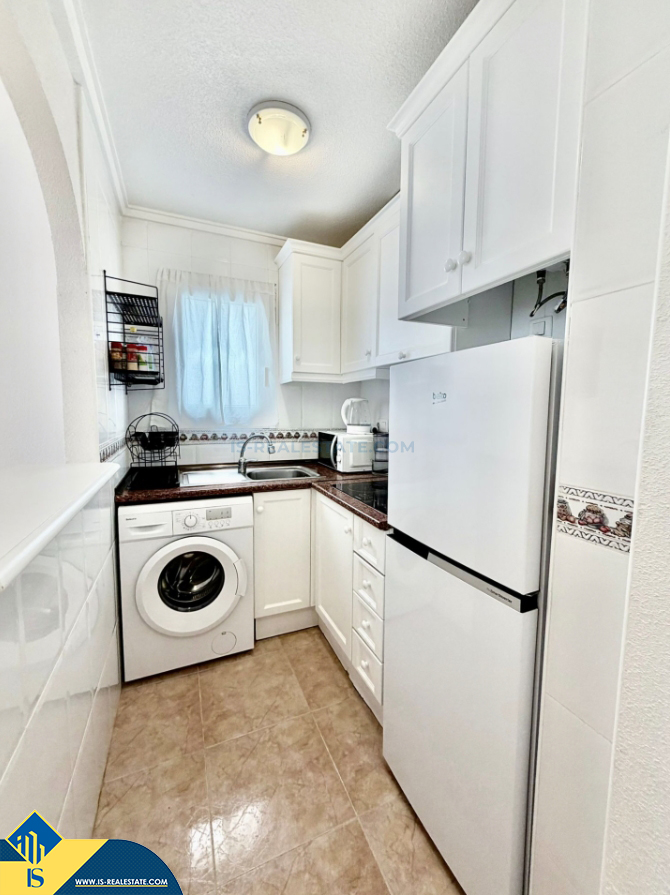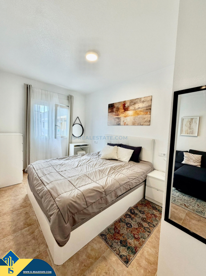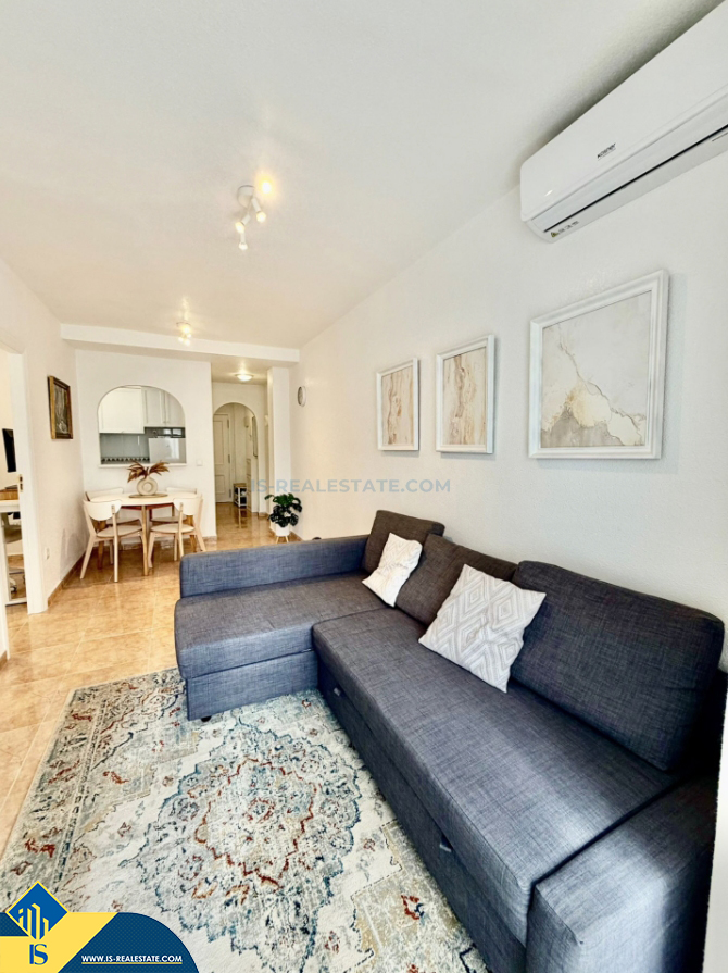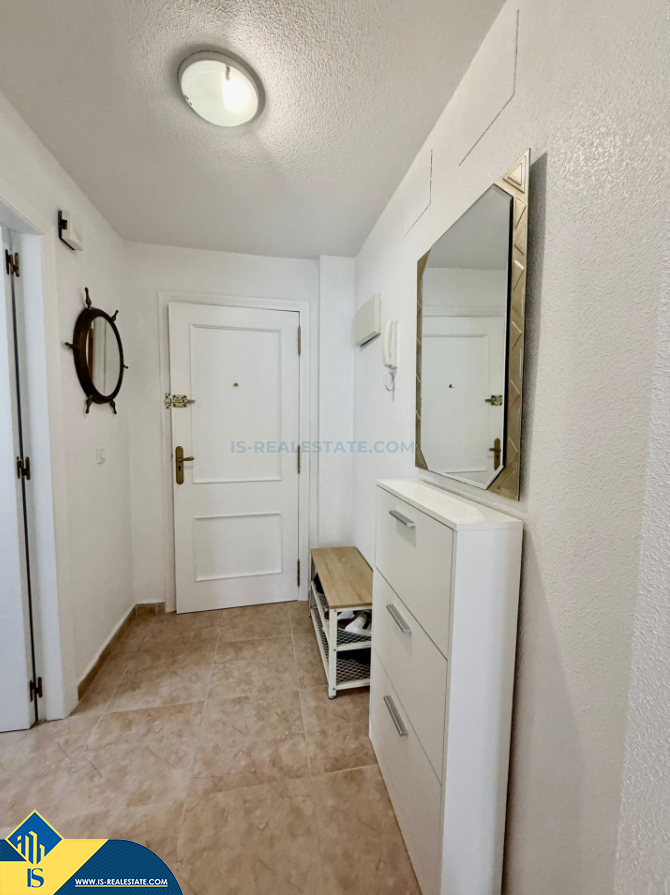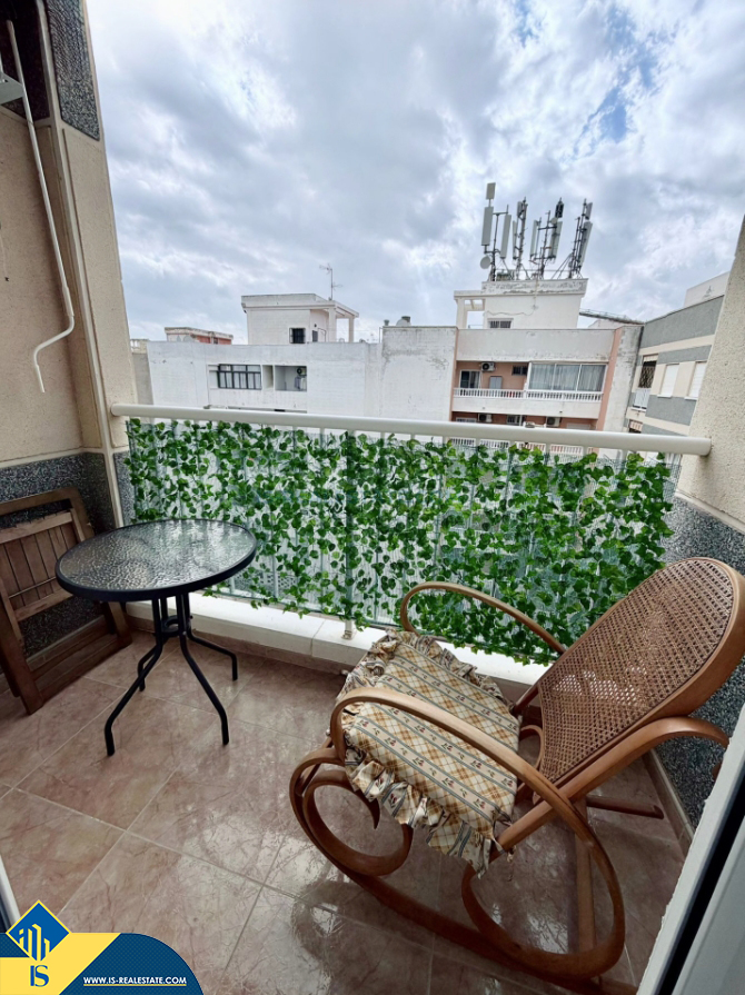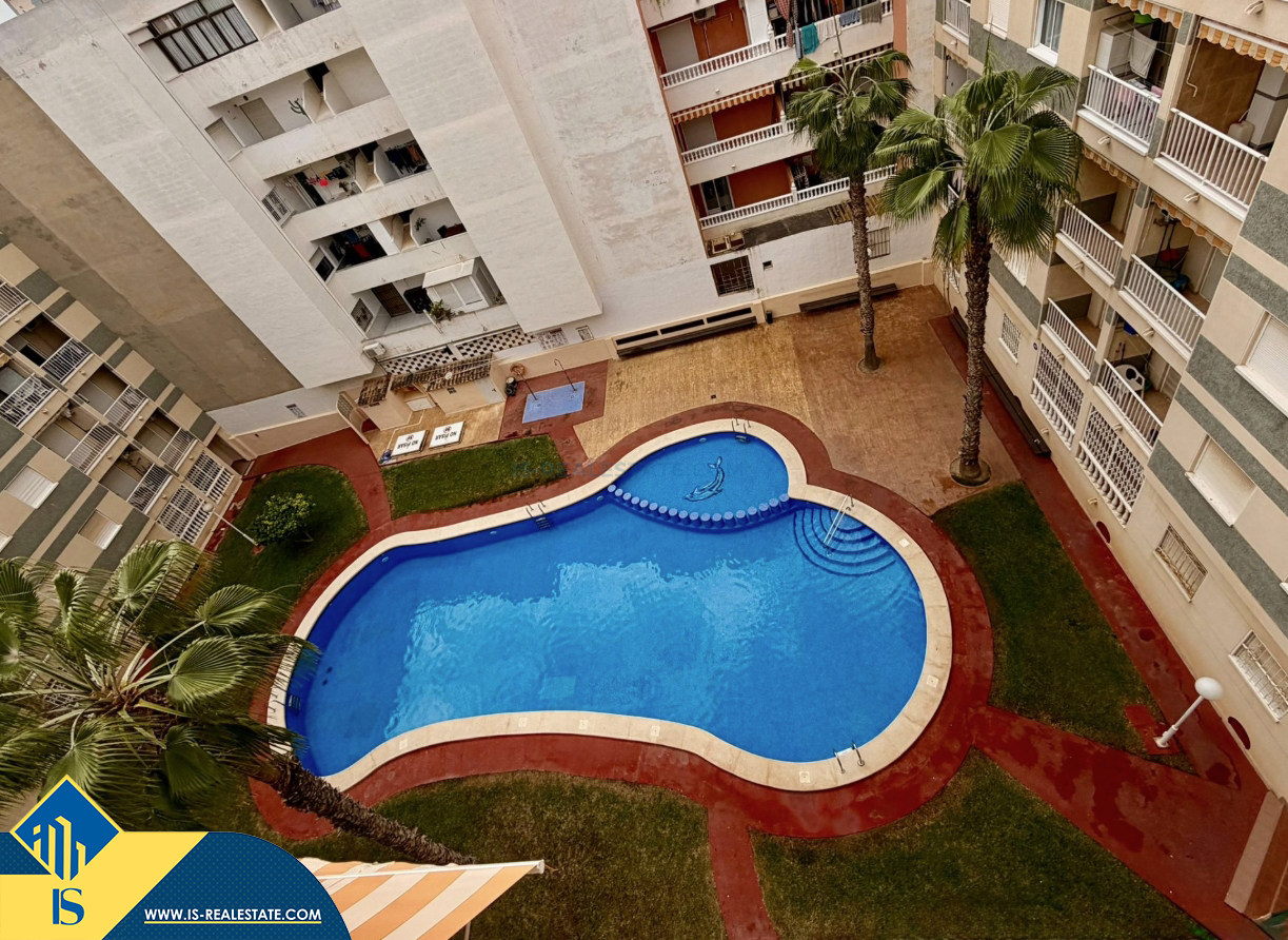 3-jų kambarių apartamentas su bendru baseinu, Ispanijoje, Alicante provincijoje, Torrevieja mieste, bendras plotas 52 m², 350 metrų iki jūros, 45 kilometrai iki Alicante oro uosto. Turtui priklauso bendras baseinas, terasa, liftas. Netoli turto yra parduotuvės, restoranai, vaistinės, autobusų stotelės, degalinės, žalios zonos, kavinės