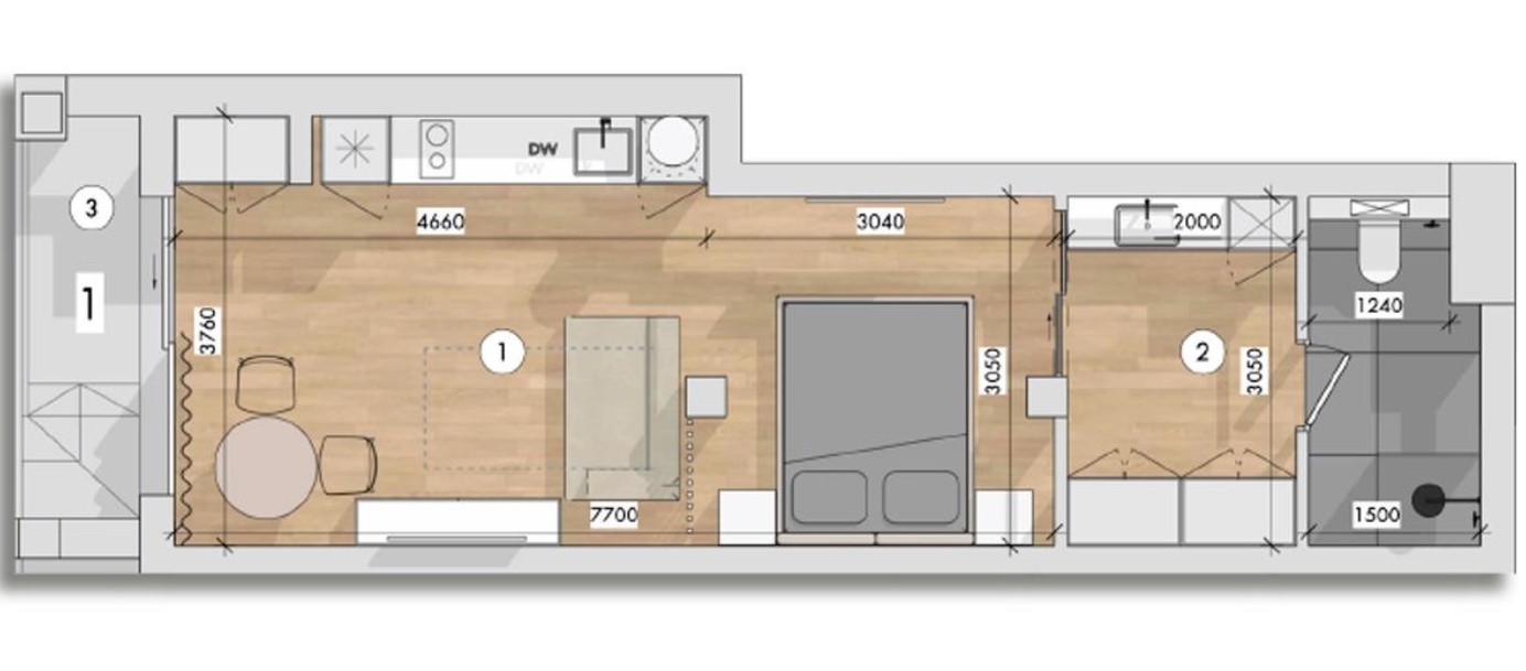 Kambariai: 1 miegamasis, 1 vonios kambarys